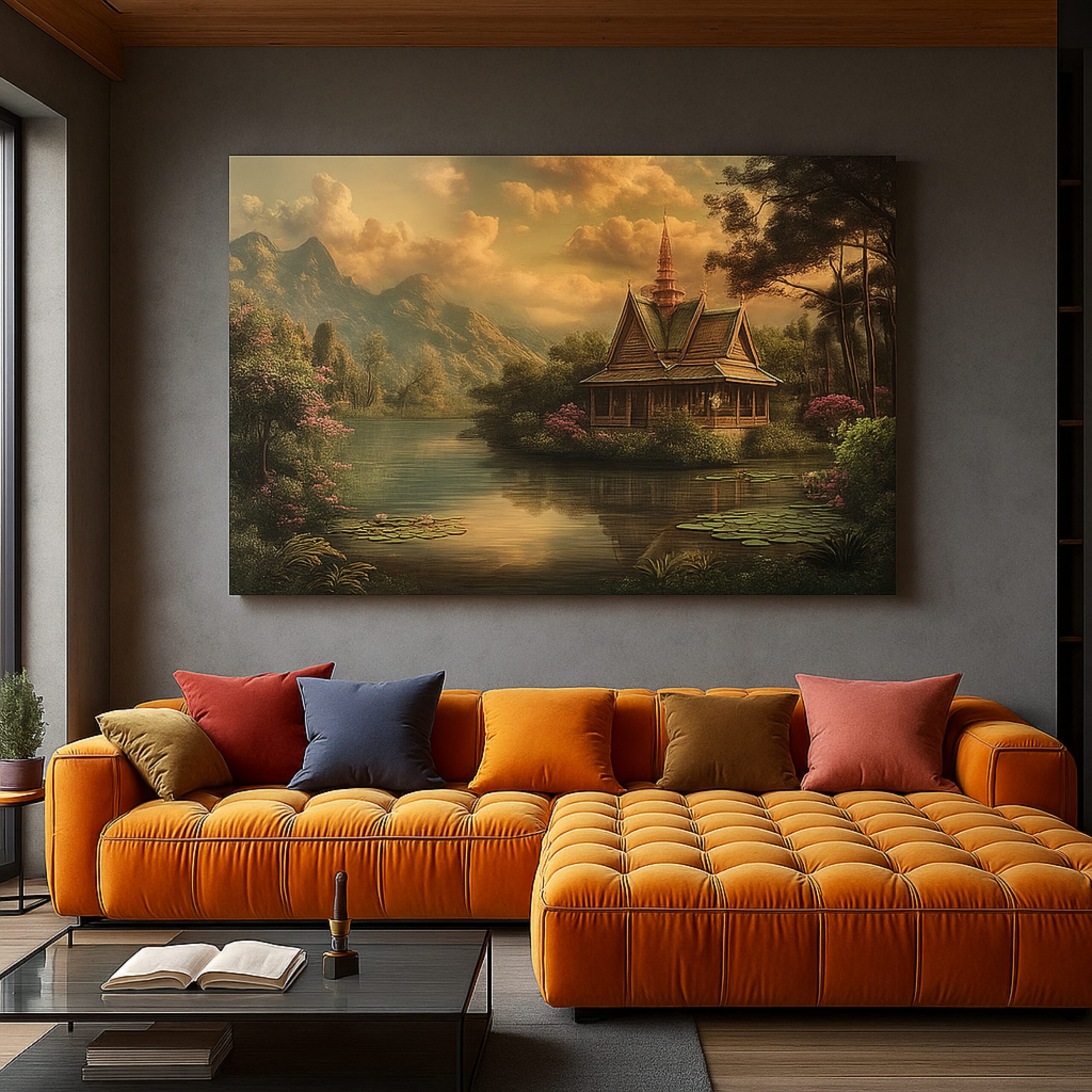 Temple Sequence transports viewers into a sacred world of devotion and natural beauty. Rising temple structures surrounded by lotus ponds and golden skies inspire serenity and cultural pride. With its detailed architecture and reflective waters, this canvas print evokes peace and reverence in any interior.