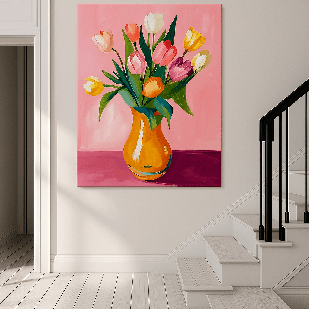 Canvas Print of Tulip Reverie brightens interiors with bold tulips in a warm yellow vase against a lively pink backdrop. Bursting with energy and modern charm, this floral composition lifts moods instantly while adding a chic, contemporary pop of color. The balanced shapes and saturated tones make it a joyful focal point for kitchens, living rooms, and creative spaces alike.