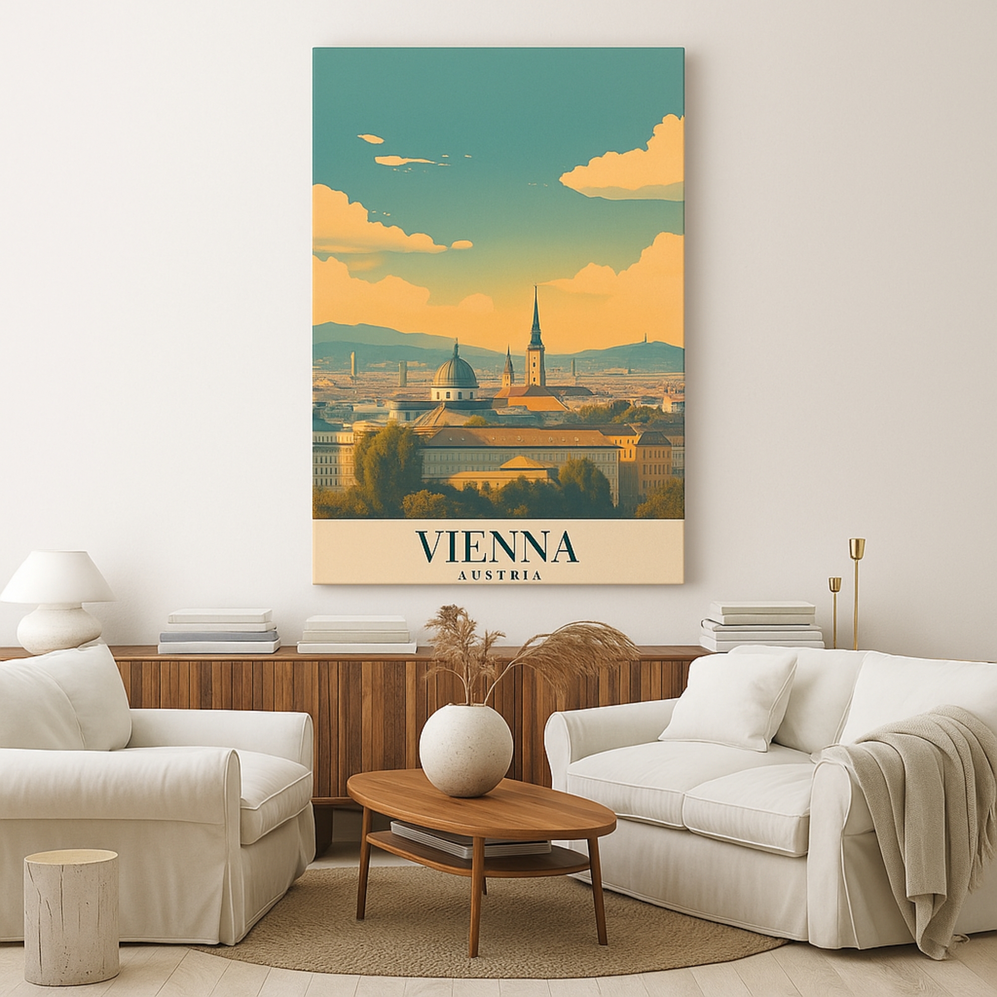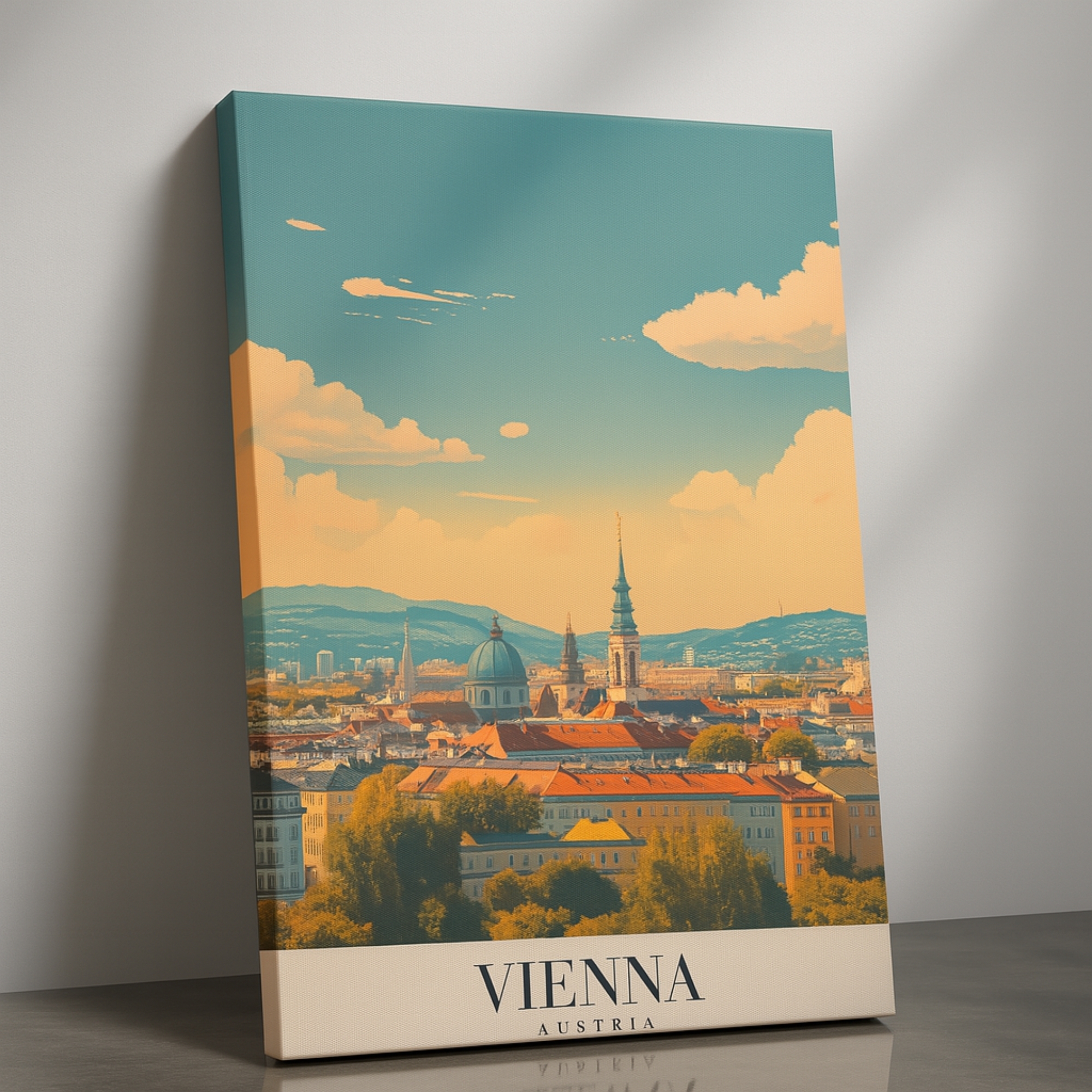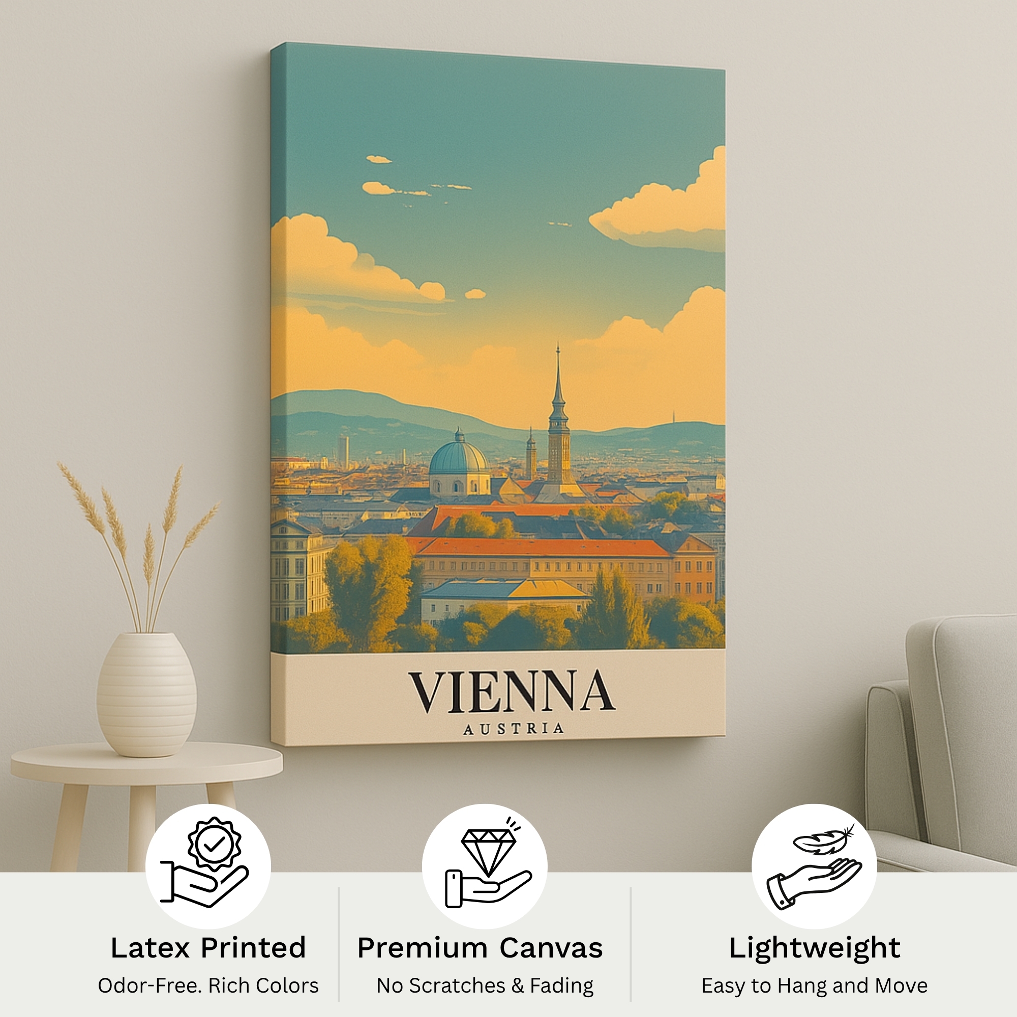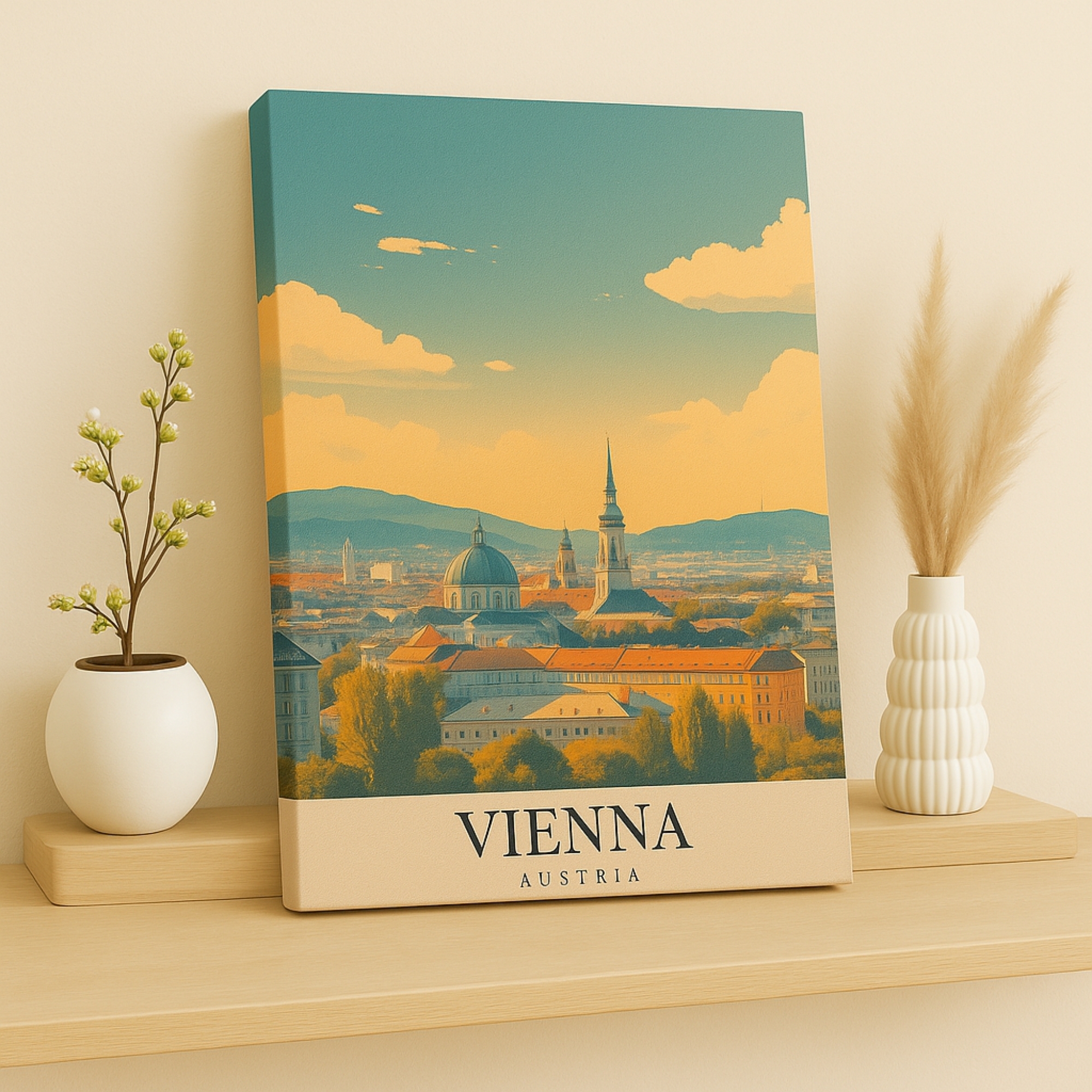 Bring old-world elegance into your home with the Canvas Print of Vienna Austria, a graceful panorama featuring domes, rooftops, and historic avenues bathed in warm, refined tones. This artwork captures the architectural grandeur and timeless charm of Austria’s capital, creating a cultured focal point that balances calm with sophistication. Perfect for classical or European-inspired interiors, it enriches living rooms, studies, and heritage-style spaces with cultural depth and artistic refinement.