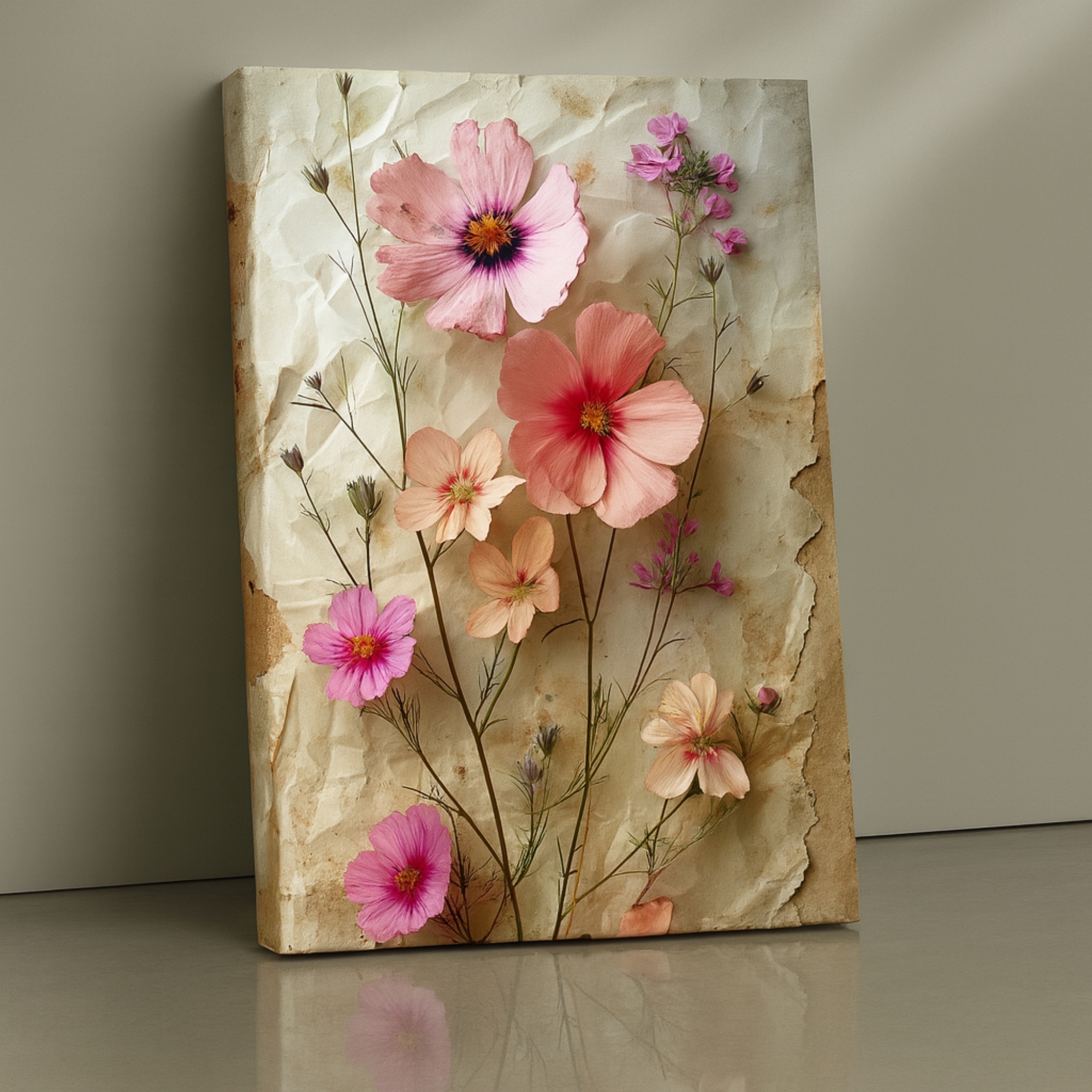 Add nostalgic warmth to your décor with the Vintage Meadow Charm Canvas Print. This artwork showcases delicate wildflowers layered over a textured vintage-style background. As a result, it creates a cozy and romantic atmosphere. The earthy tones add softness and charm to your space.