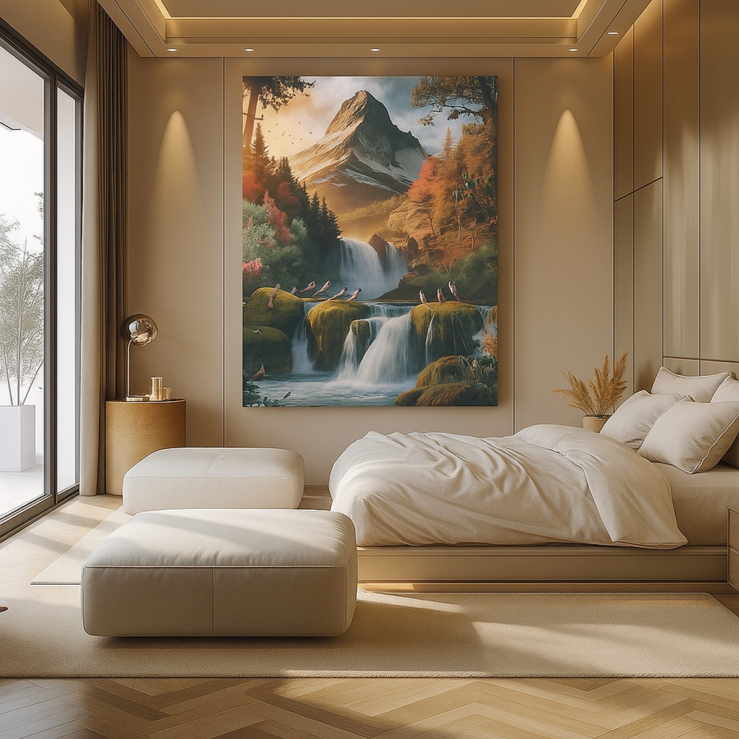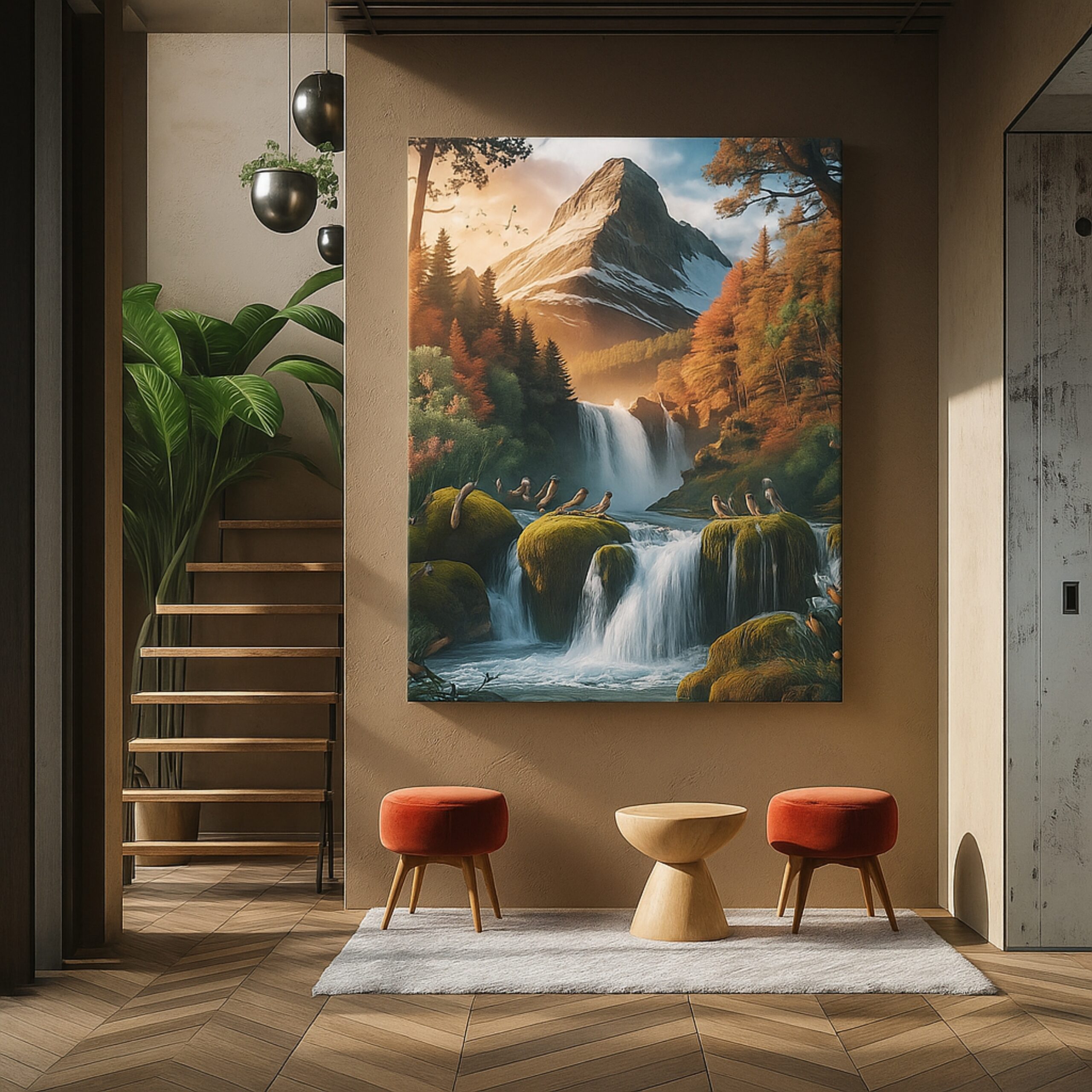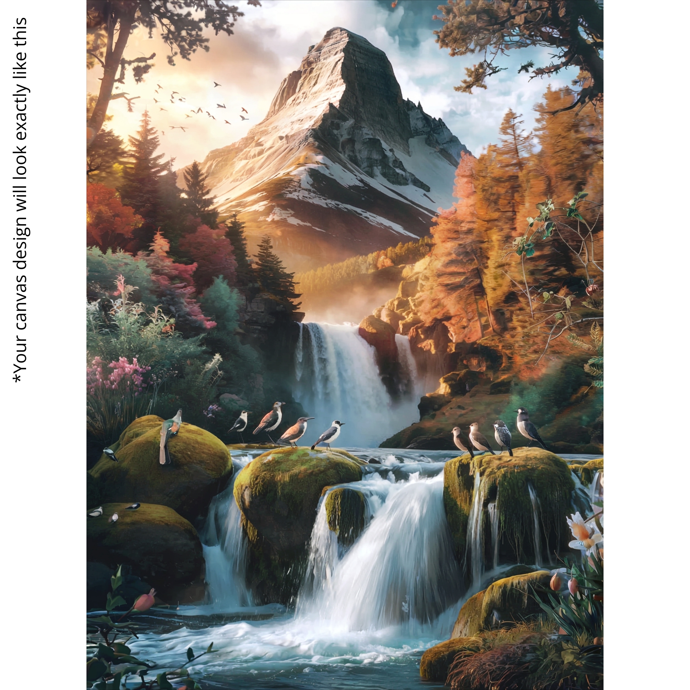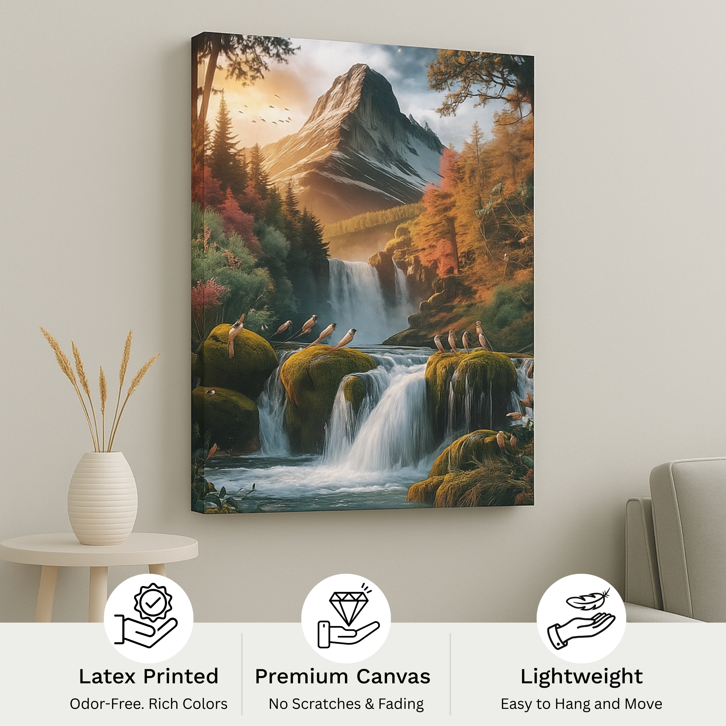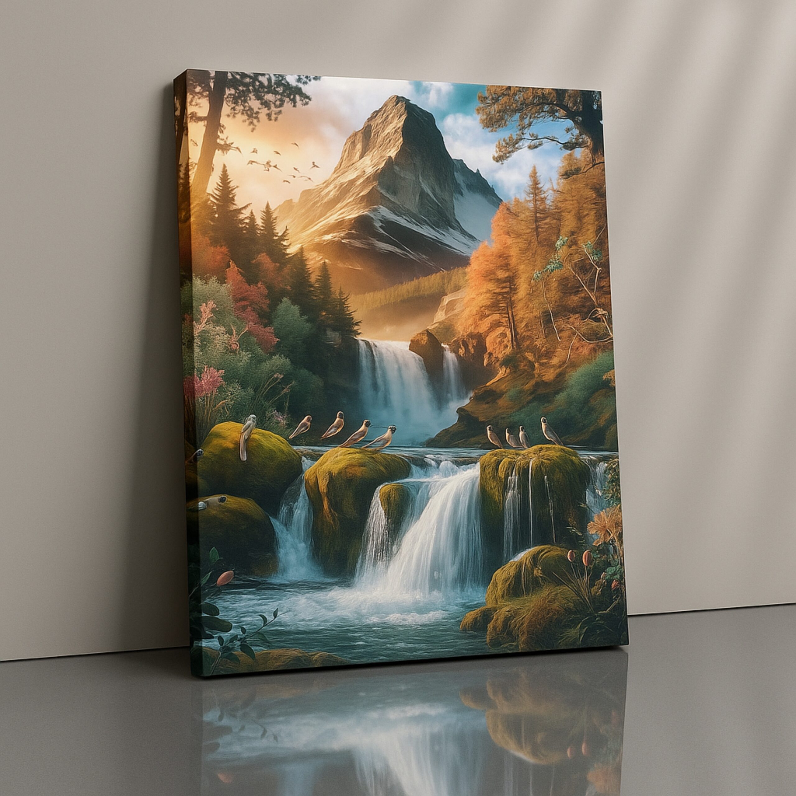 Experience wilderness beauty with the Canvas Print of Whispering Peaks. This majestic composition showcases mountains, waterfalls, and songbirds in vibrant foliage, celebrating harmony and adventure. Its detailed textures evoke awe and inspiration, making it ideal for creative interiors.