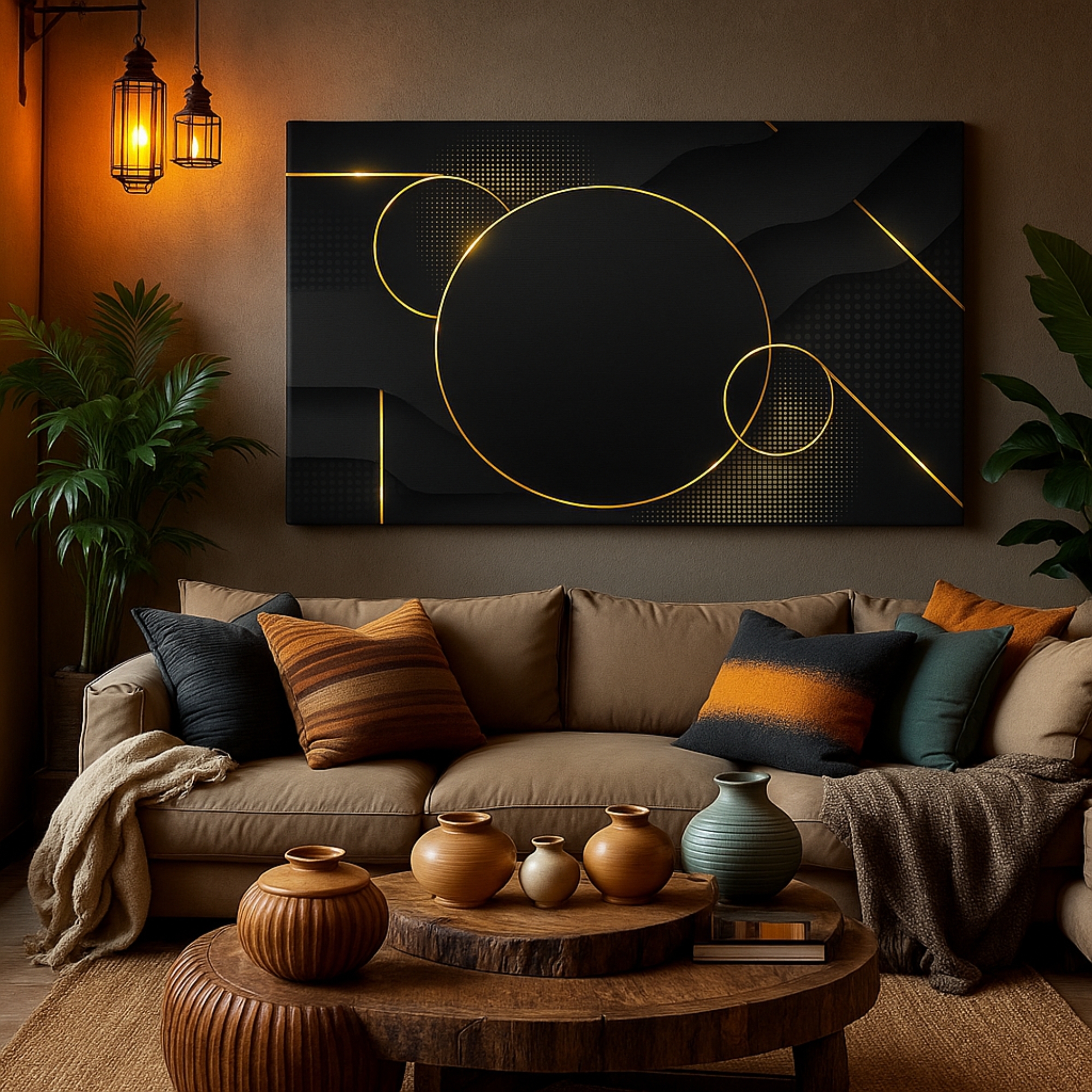A refined abstract piece that elevates spaces with symmetry and golden elegance.This canvas art is ideal for statement walls, cultural décor themes, and interiors that embrace bold, detailed craftsmanship.