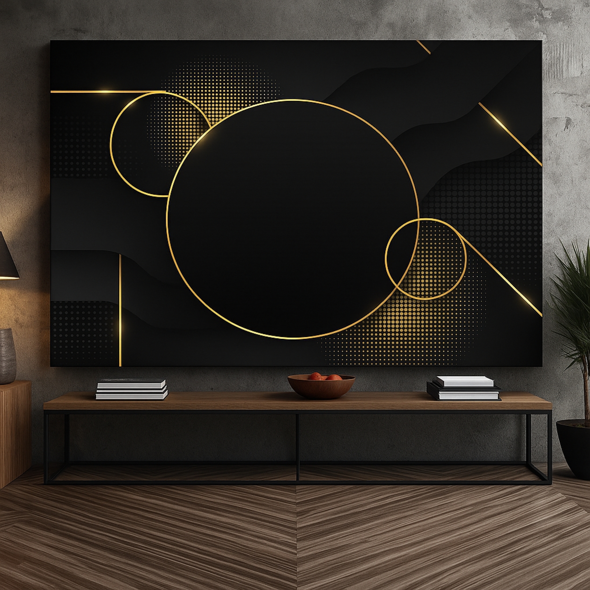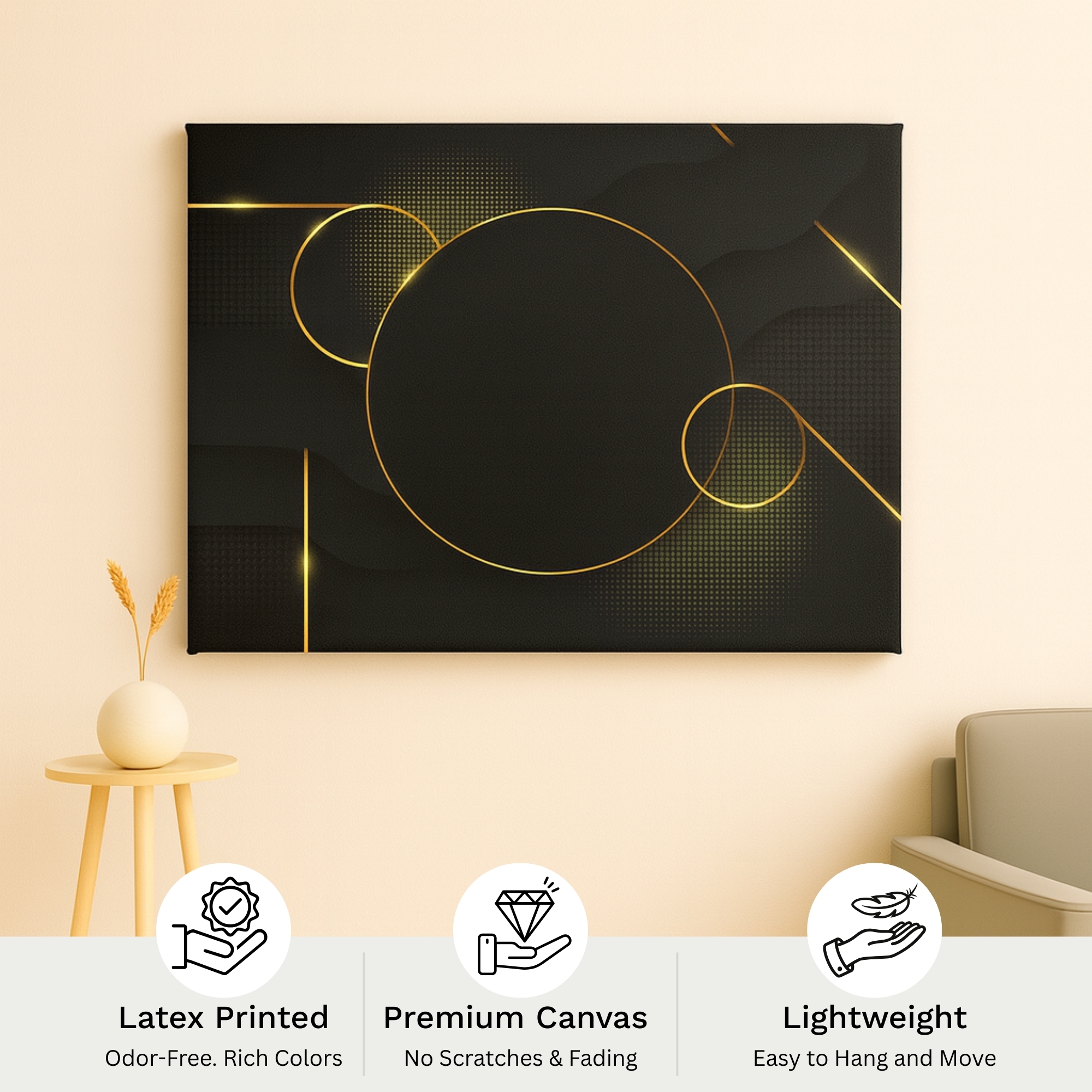 Radiant Circle Matrix Canvas Print highlights interconnected golden circles layered over subtle textures, creating harmony and visual balance. Ideal for modern interiors, creative offices, and luxury décor themes.