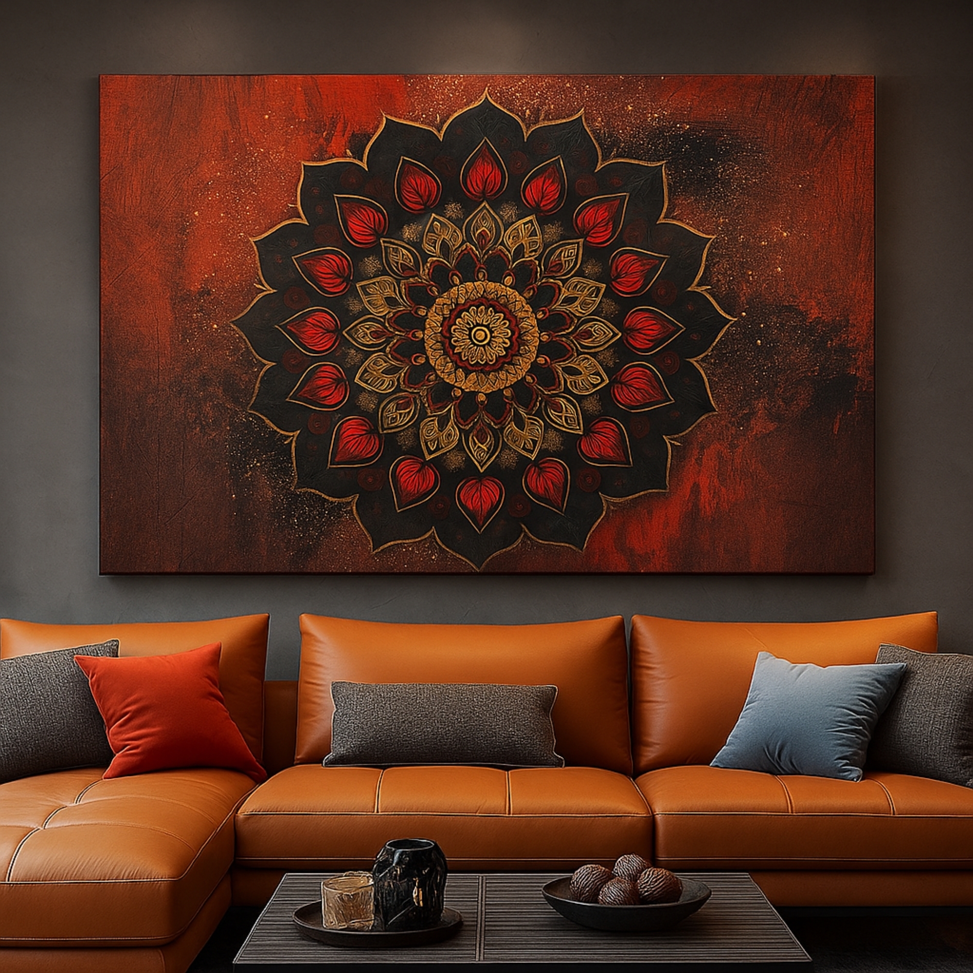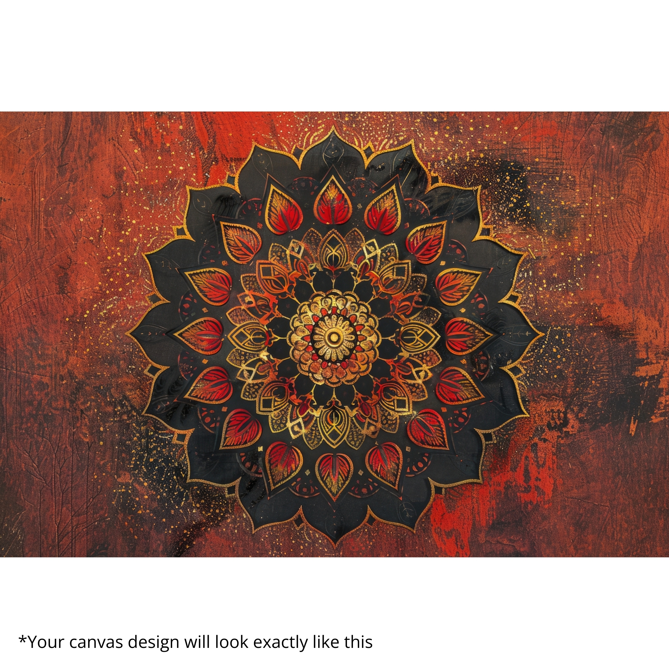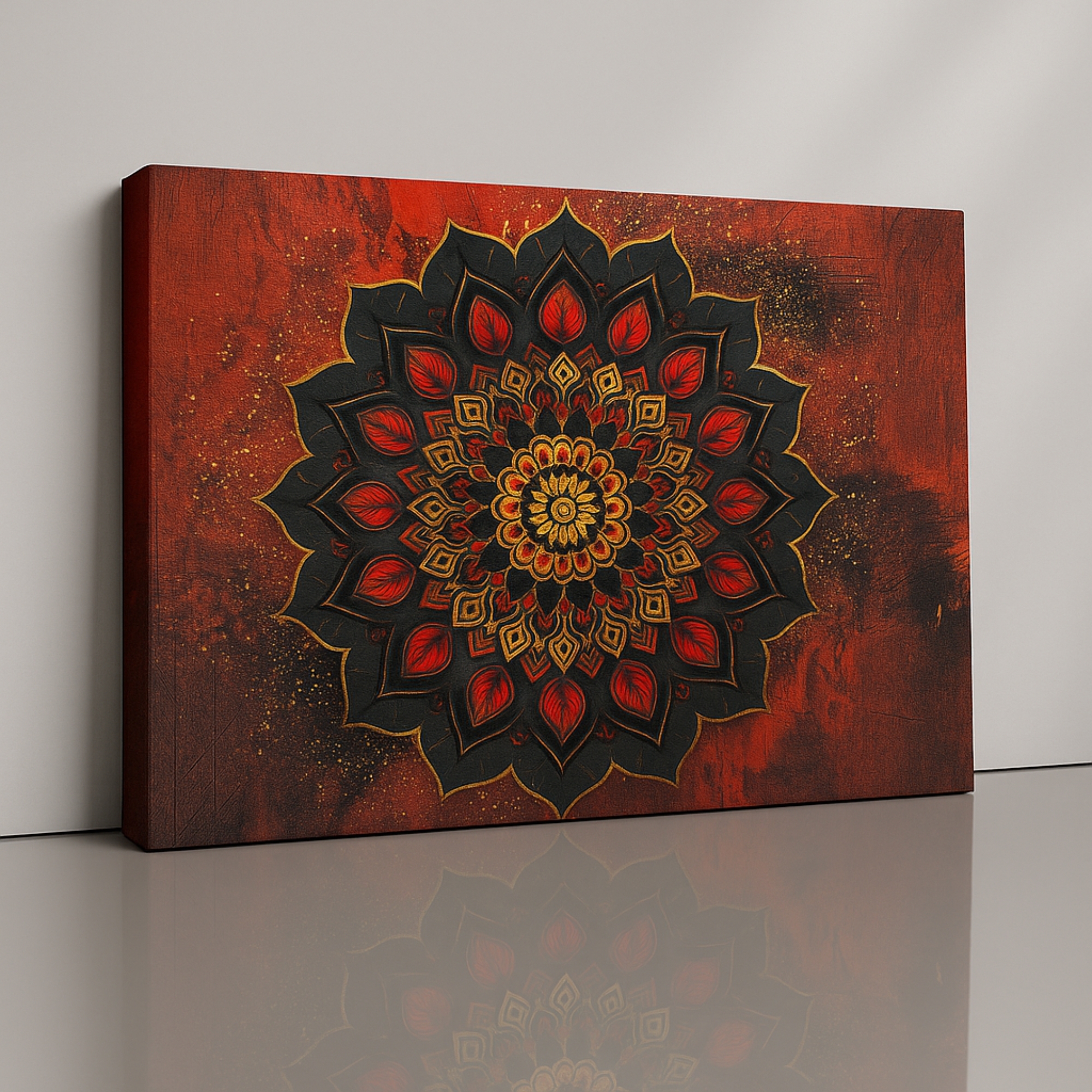 The Radiant Mandala Canvas Print glows with fiery red and golden petals, symbolizing awakening, focus, and spiritual energy. This design blends sacred geometry with artistic depth, bringing warmth, vitality, and balance to yoga rooms, meditation spaces, or modern interiors. Its vibrant tones create a captivating focal point that enhances any mindful or spiritual corner.