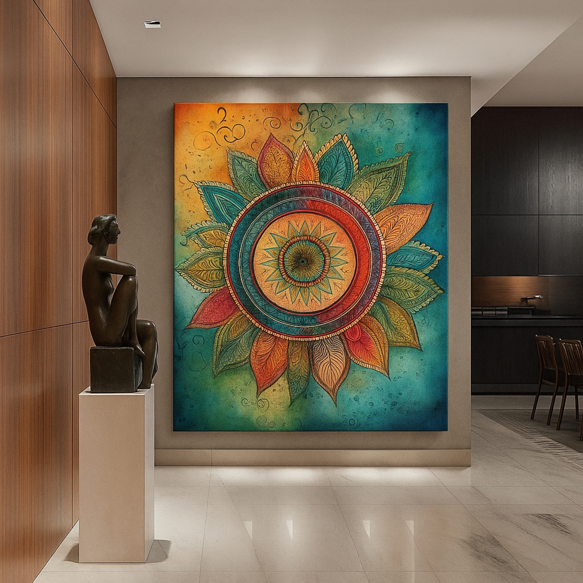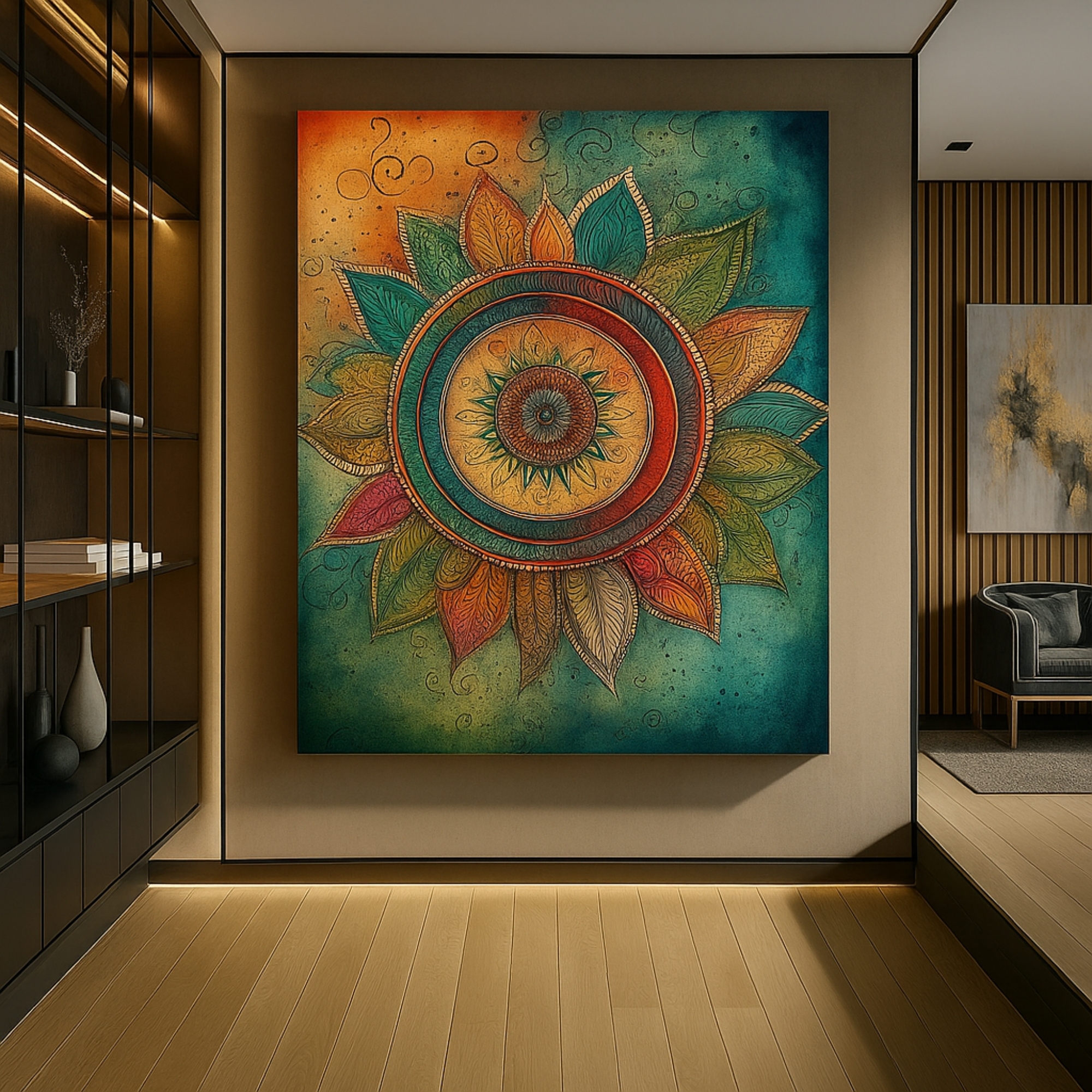 The Radiant Mandala Canvas Print is a vibrant expression of energy, balance, and spirituality. Featuring fiery red, orange, and gold hues in intricate symmetry, this canvas print symbolizes focus, harmony, and timeless Indian artistry. More than décor, it inspires positivity and inner strength, making it a striking centerpiece for modern homes.