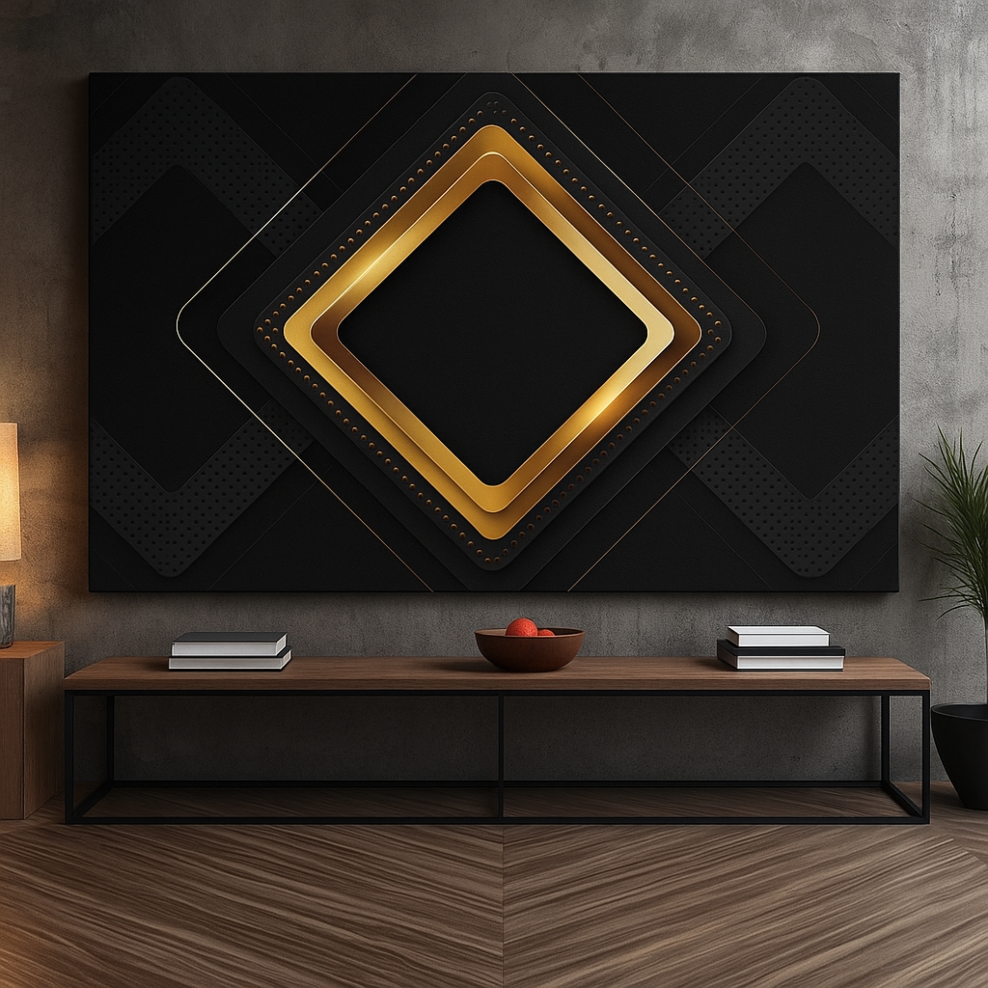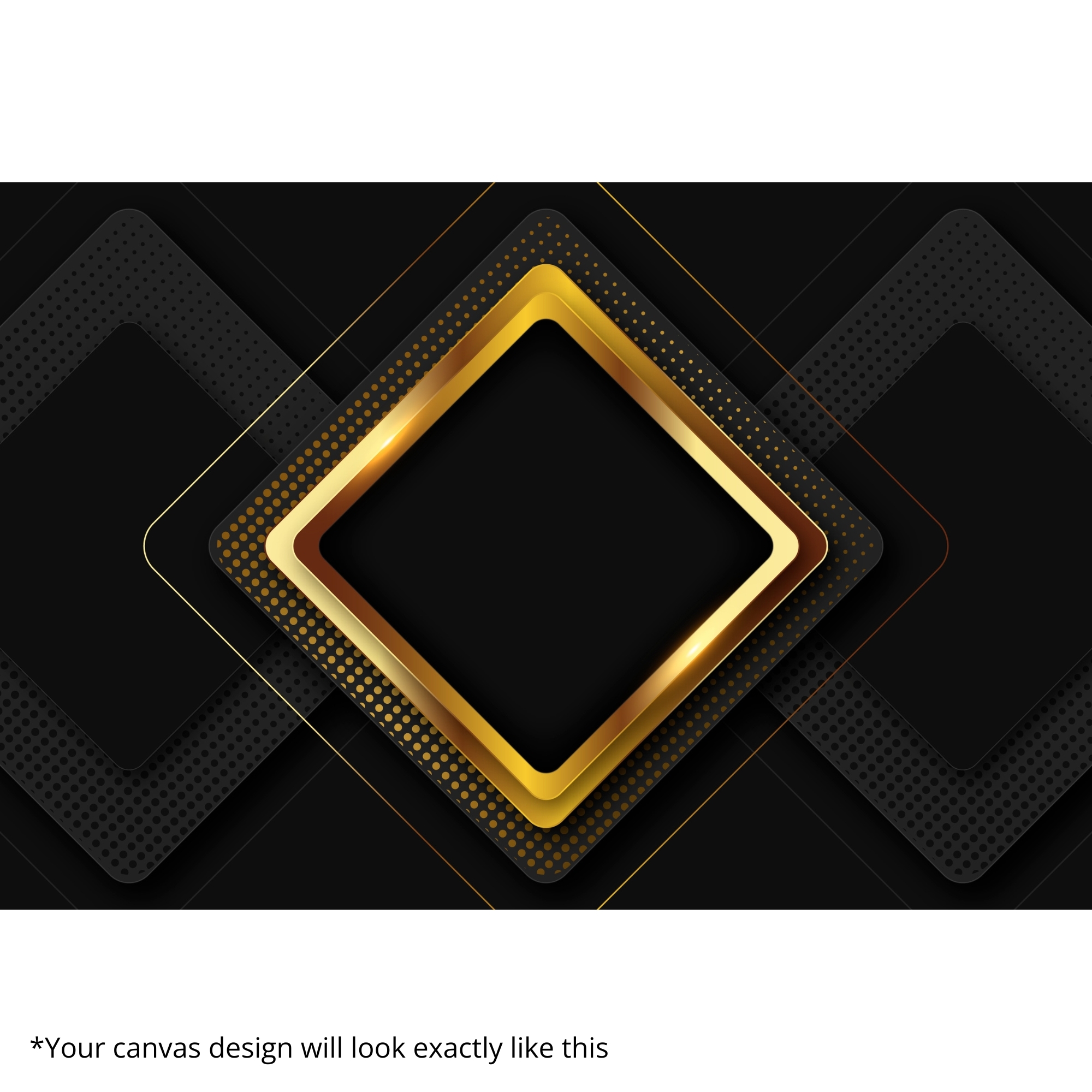 Regal Geometric Frame Canvas Print features layered geometric forms outlined in radiant gold on a deep black base. This bold abstract composition creates a powerful focal point, perfect for luxury homes, offices, and modern architectural interiors.