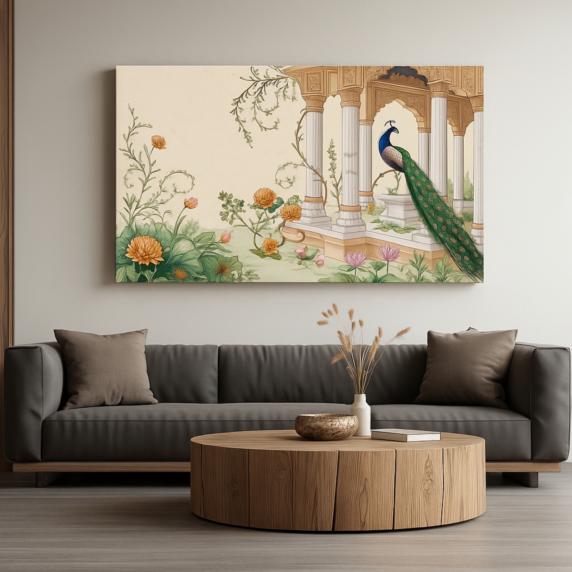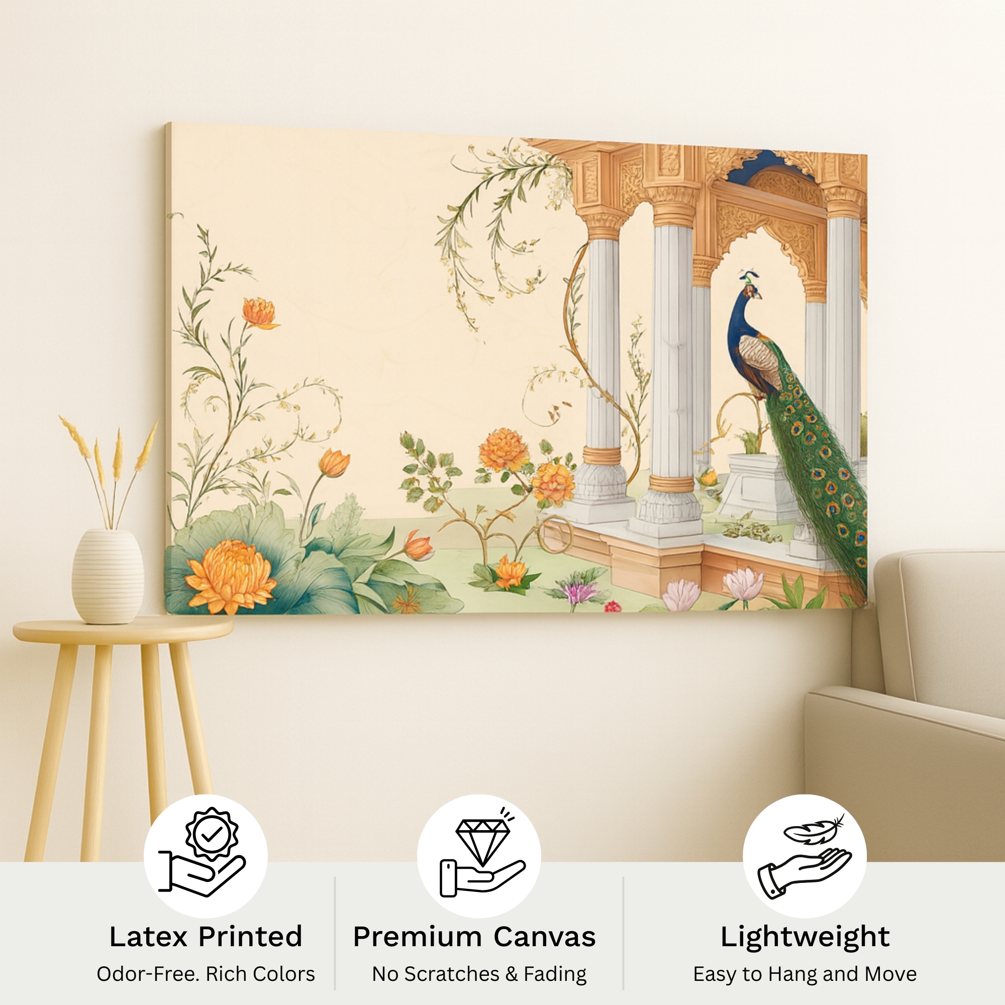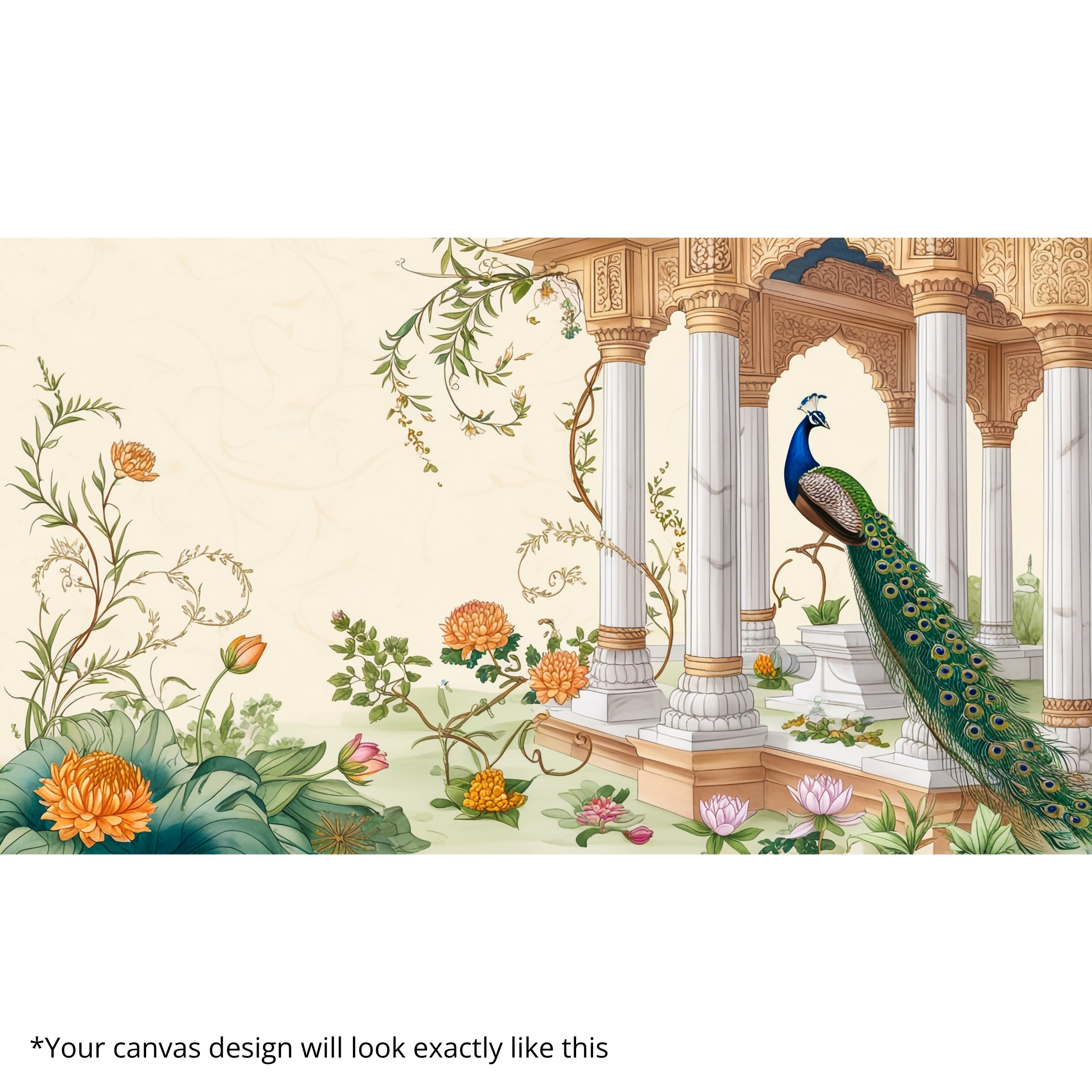 Each Regal Peacock Pavilion Canvas Print is handcrafted in India with care and precision.