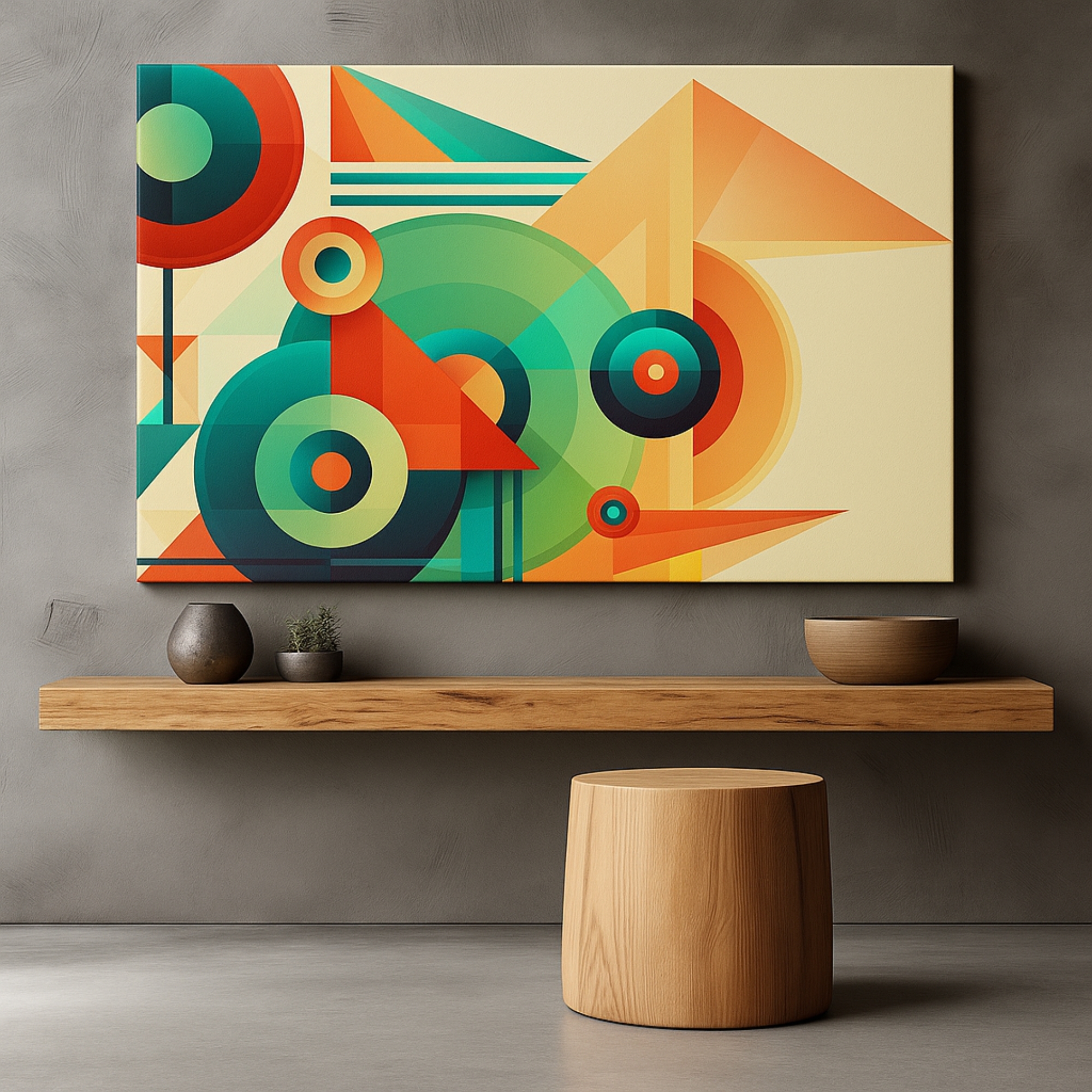 The Retro Geo Fusion canvas print blends vintage-inspired shapes, bold circles, and contrasting tones to create a lively geometric artwork. Perfect for brightening living rooms, nurseries, creative corners, and home offices, this canvas delivers warmth, balance, and high-end aesthetic appeal. Playful Echoes fits beautifully with pastel décor, Scandinavian themes, and modern abstract styling.