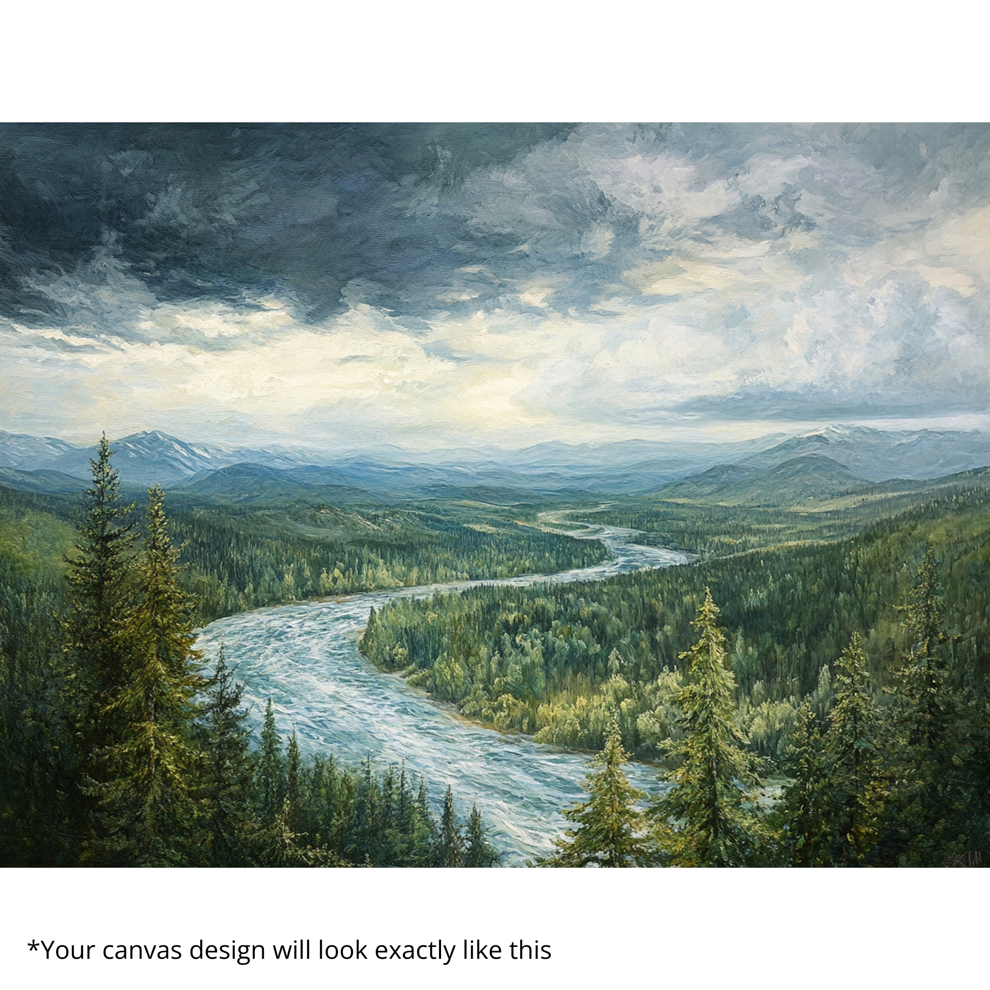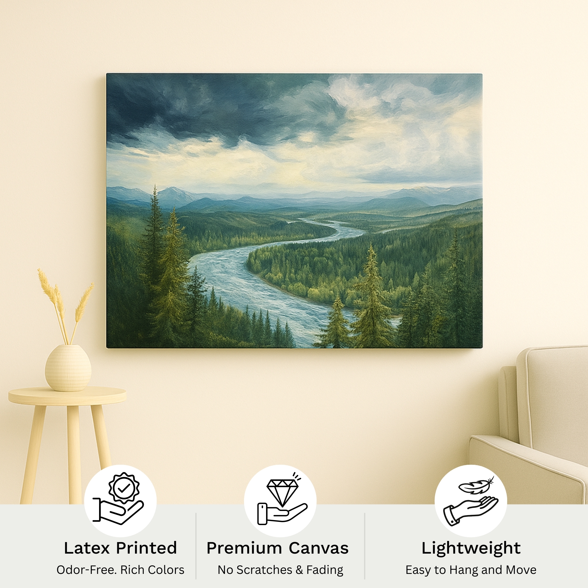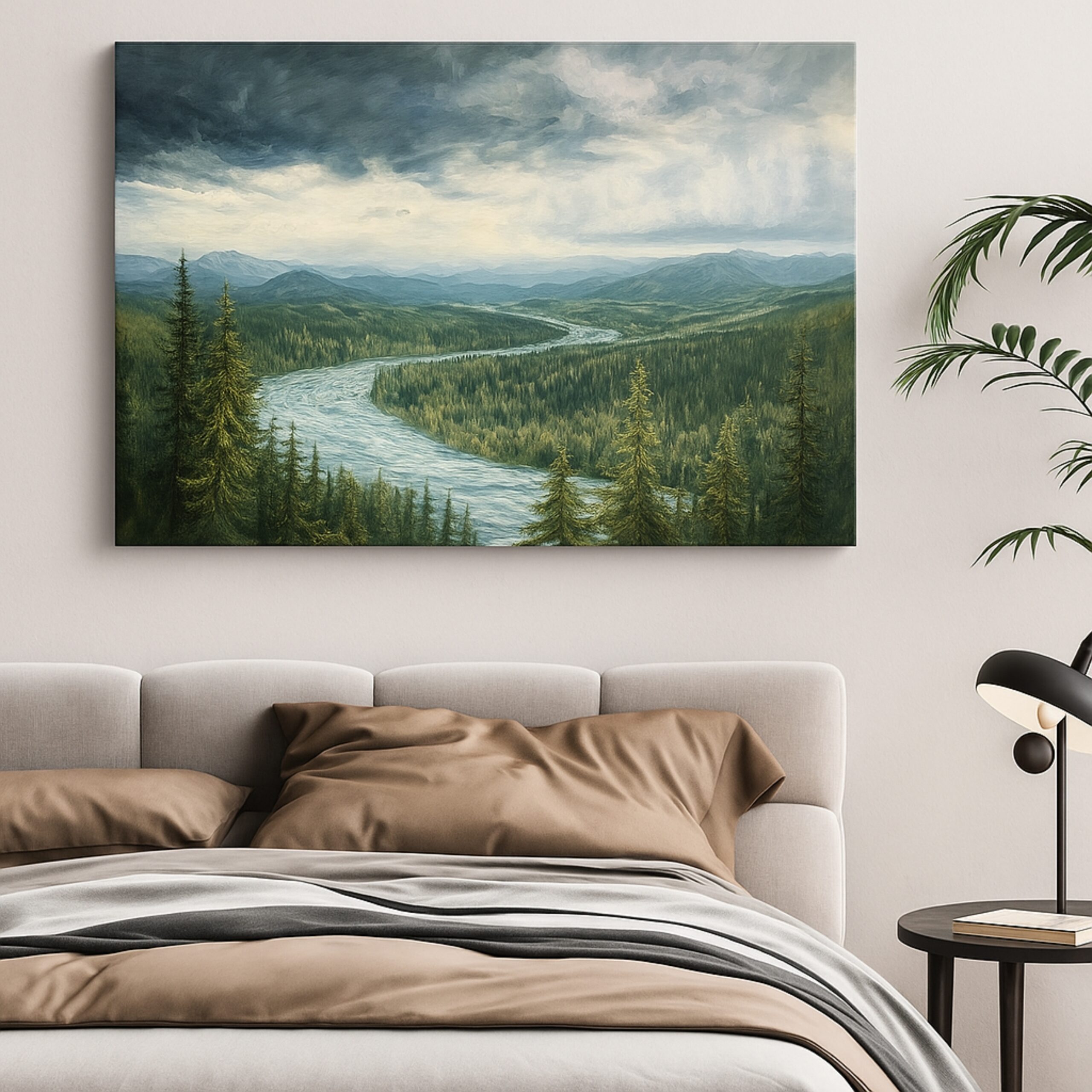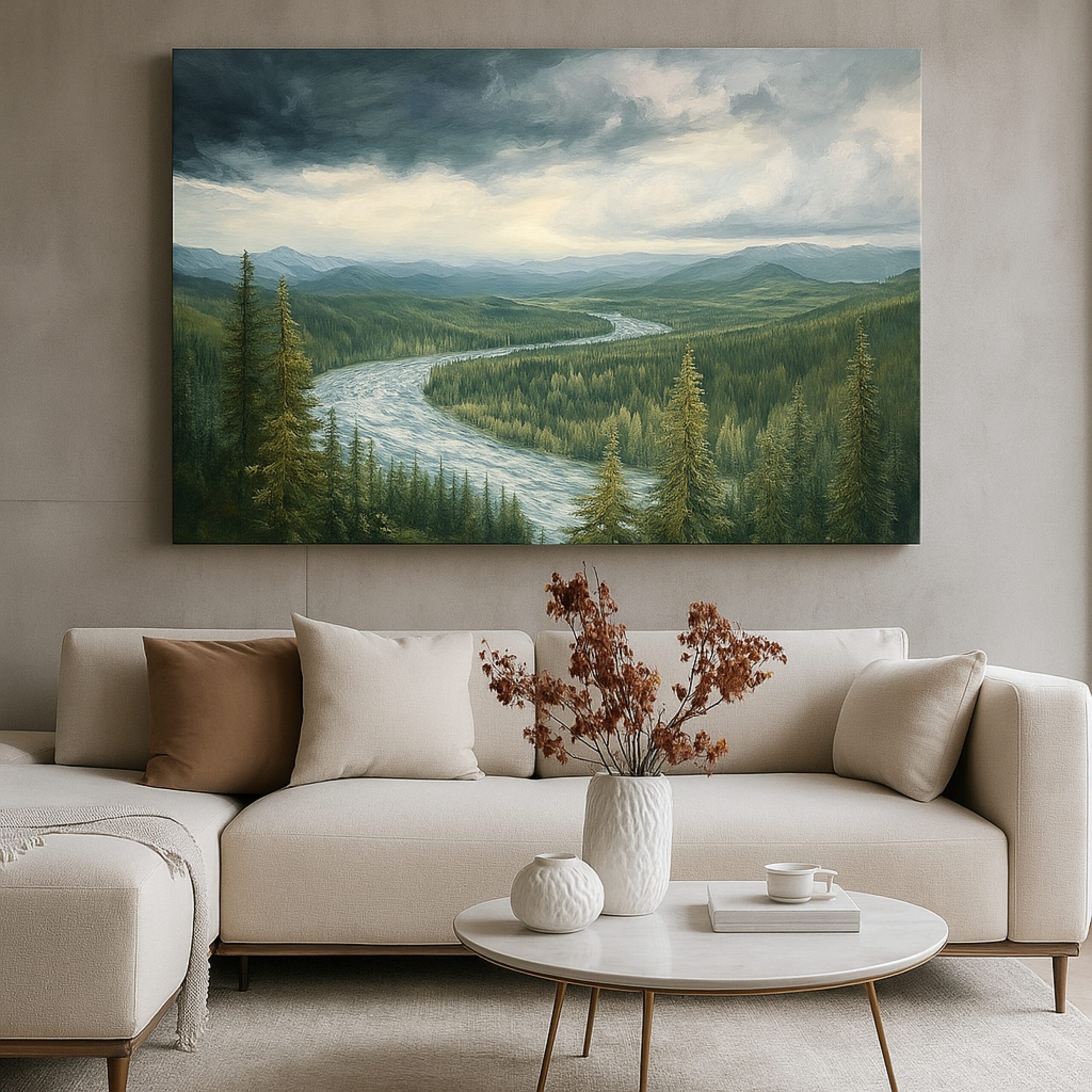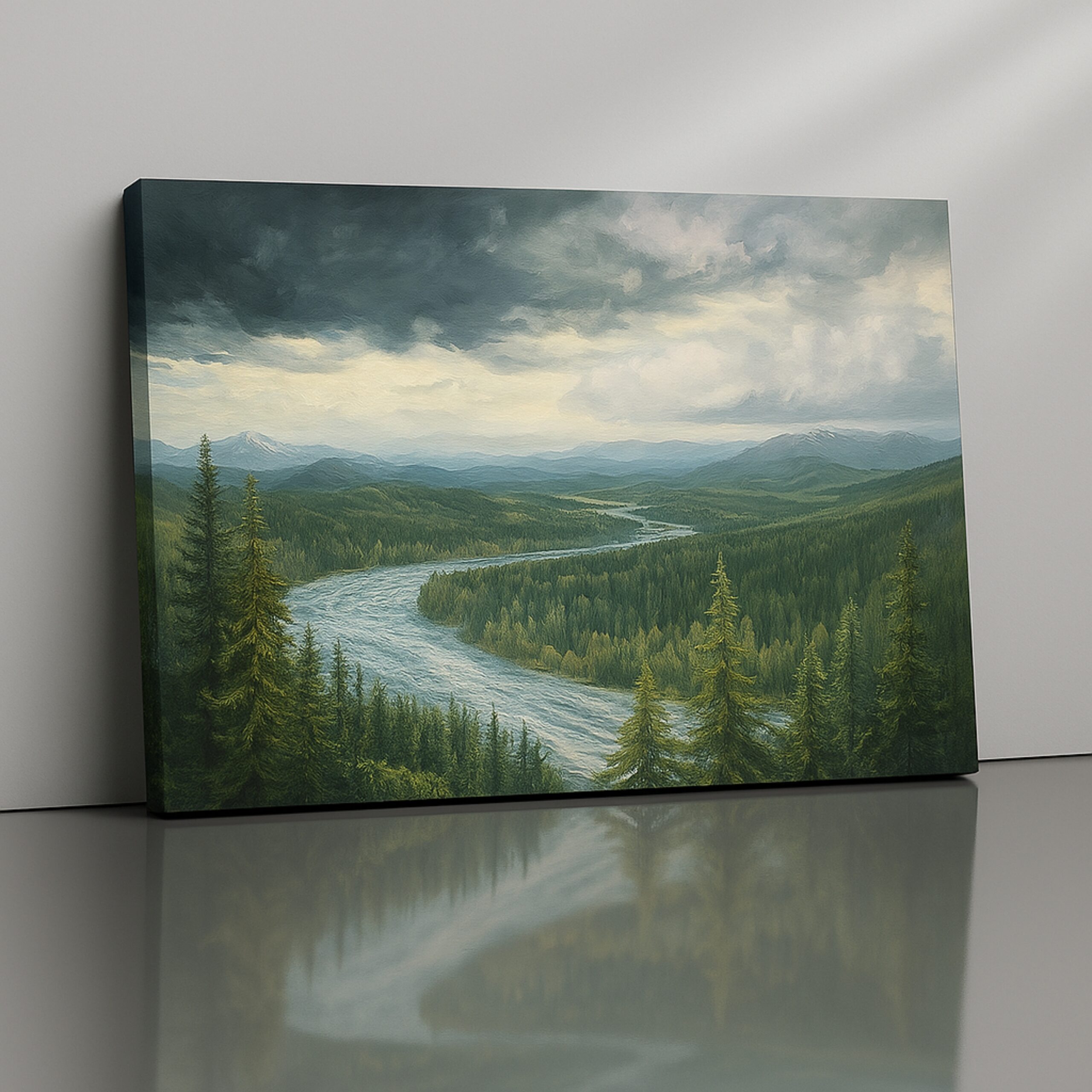 “River’s Journey” is a majestic Canvas Print that captures a winding river flowing through pine forests under dramatic skies. The composition balances nature’s grandeur with serenity, making it a timeless landscape for modern interiors.