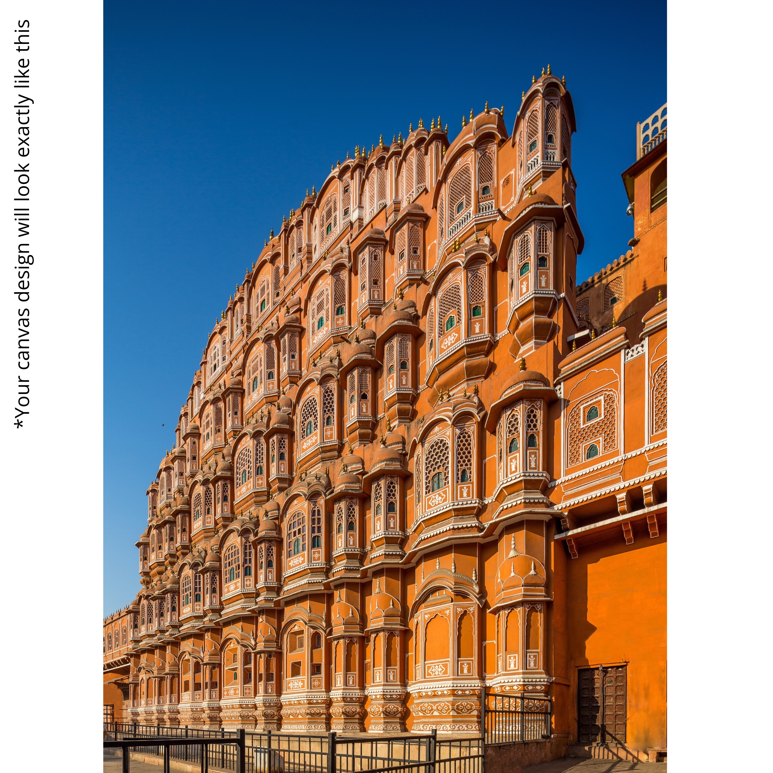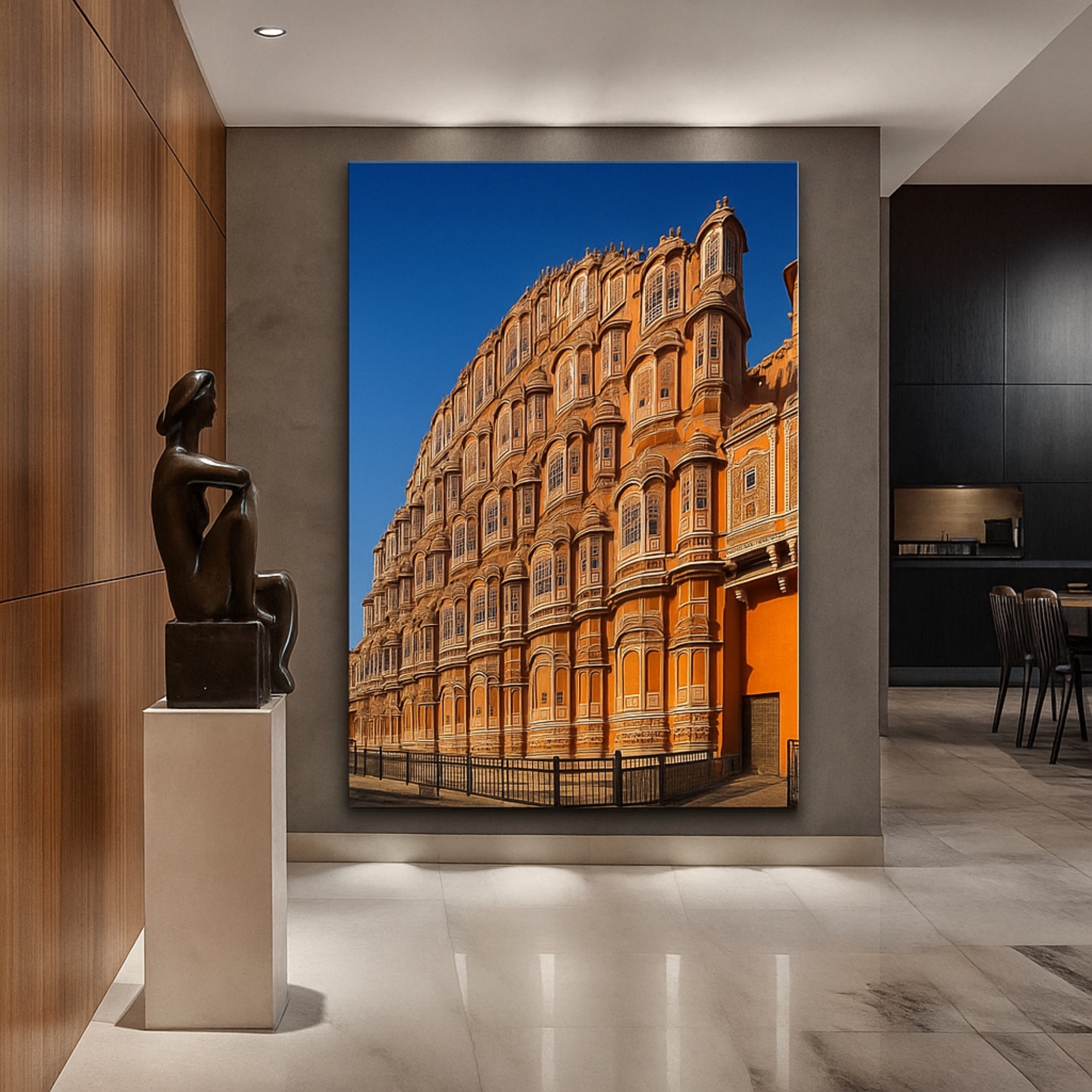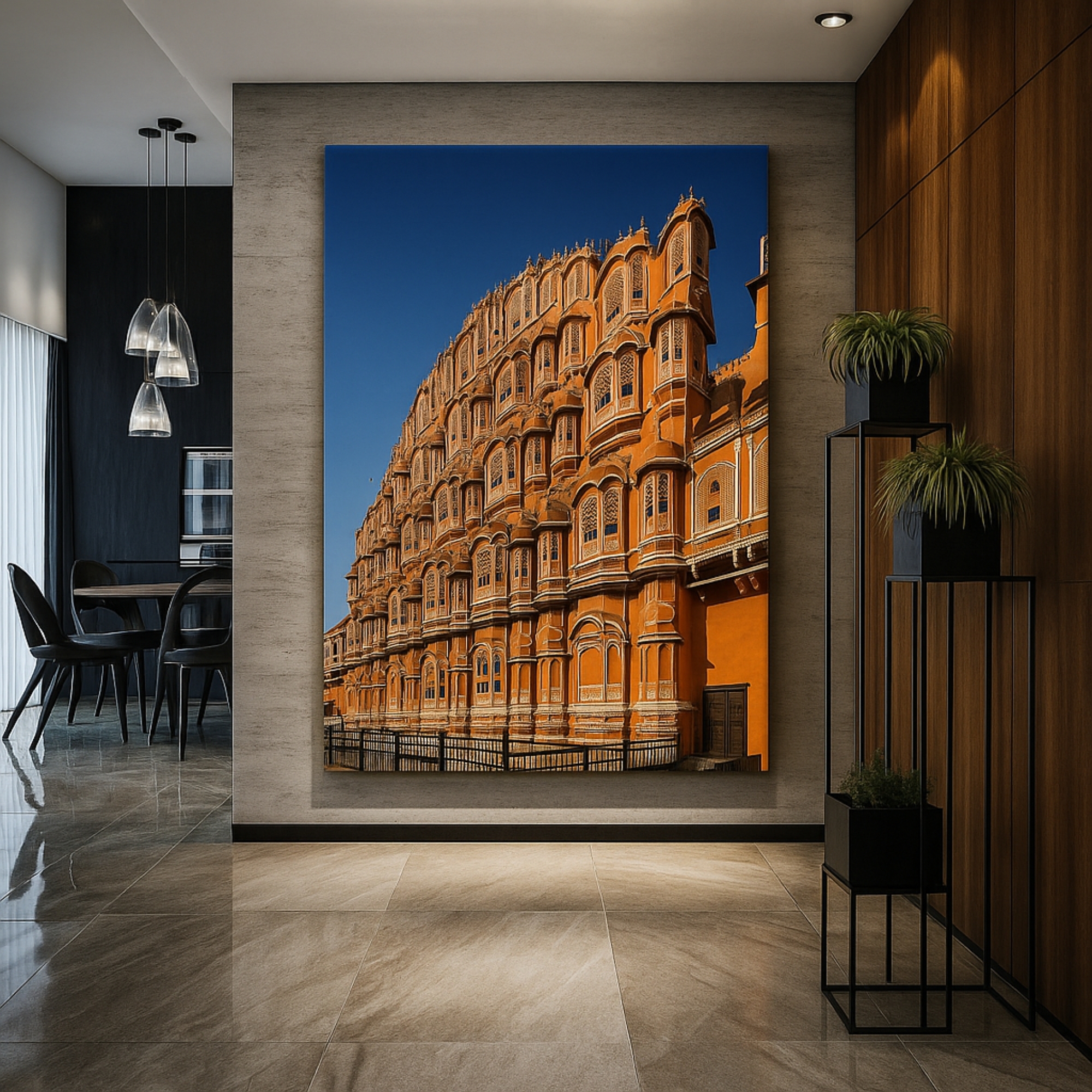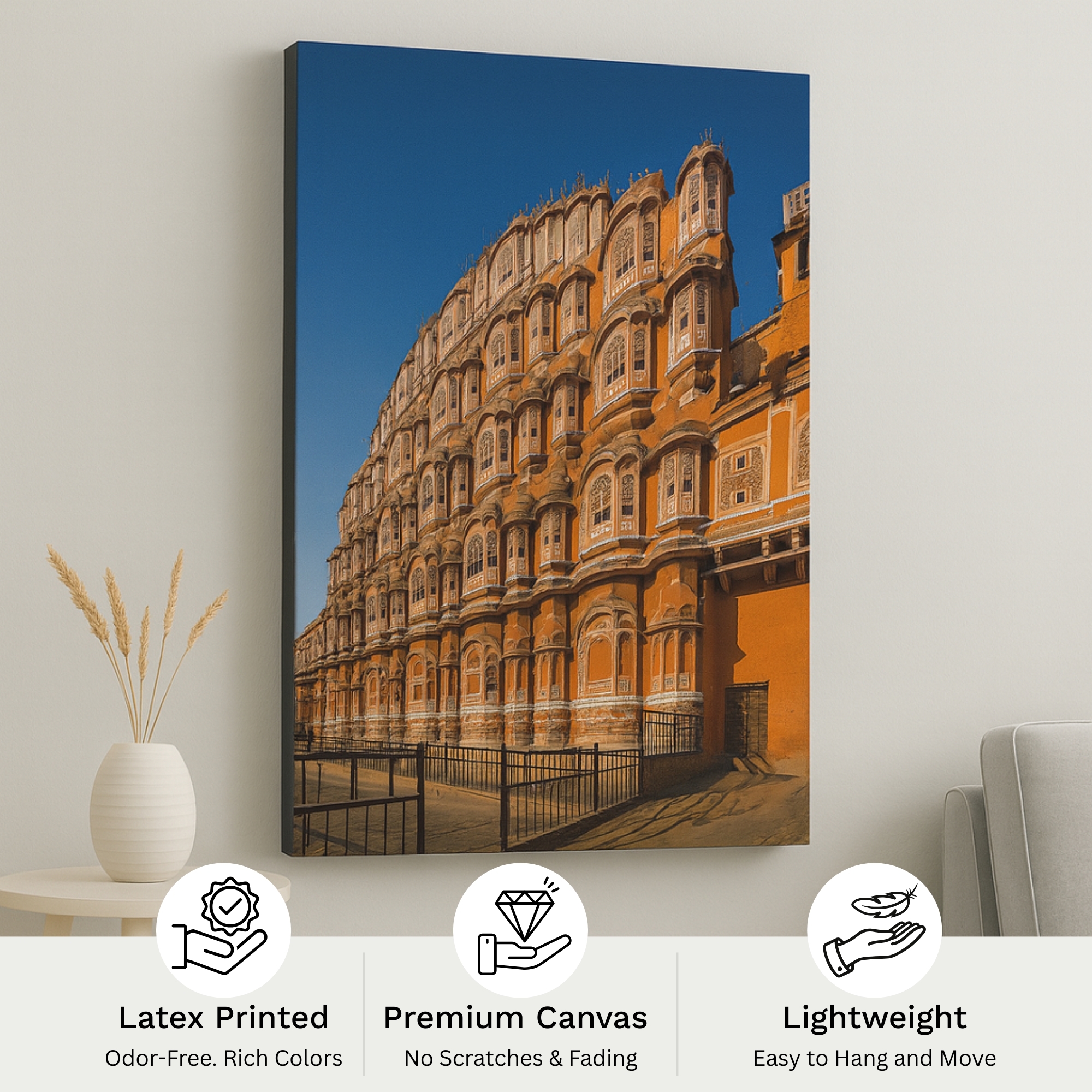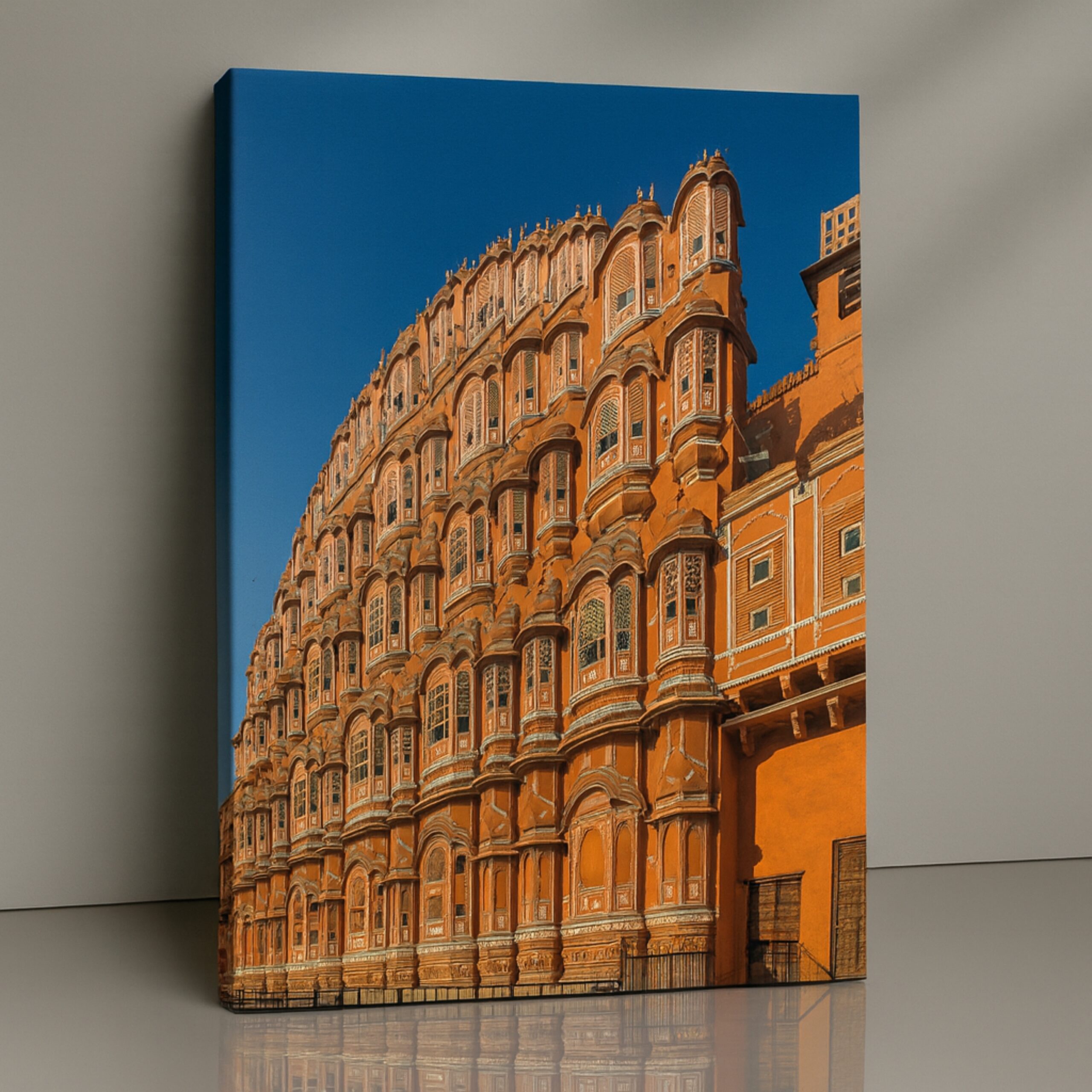 The Royal Facade Canvas Print captures the grandeur of Rajasthan’s iconic Hawa Mahal, a masterpiece of red sandstone and intricate latticework. This wall art transforms your space into a royal setting, radiating India’s architectural legacy with pride. The vibrant orange tones contrasted against a blue sky make it a striking décor element that bridges tradition with modern interiors. This canvas print serves as both art and heritage in one elegant design.