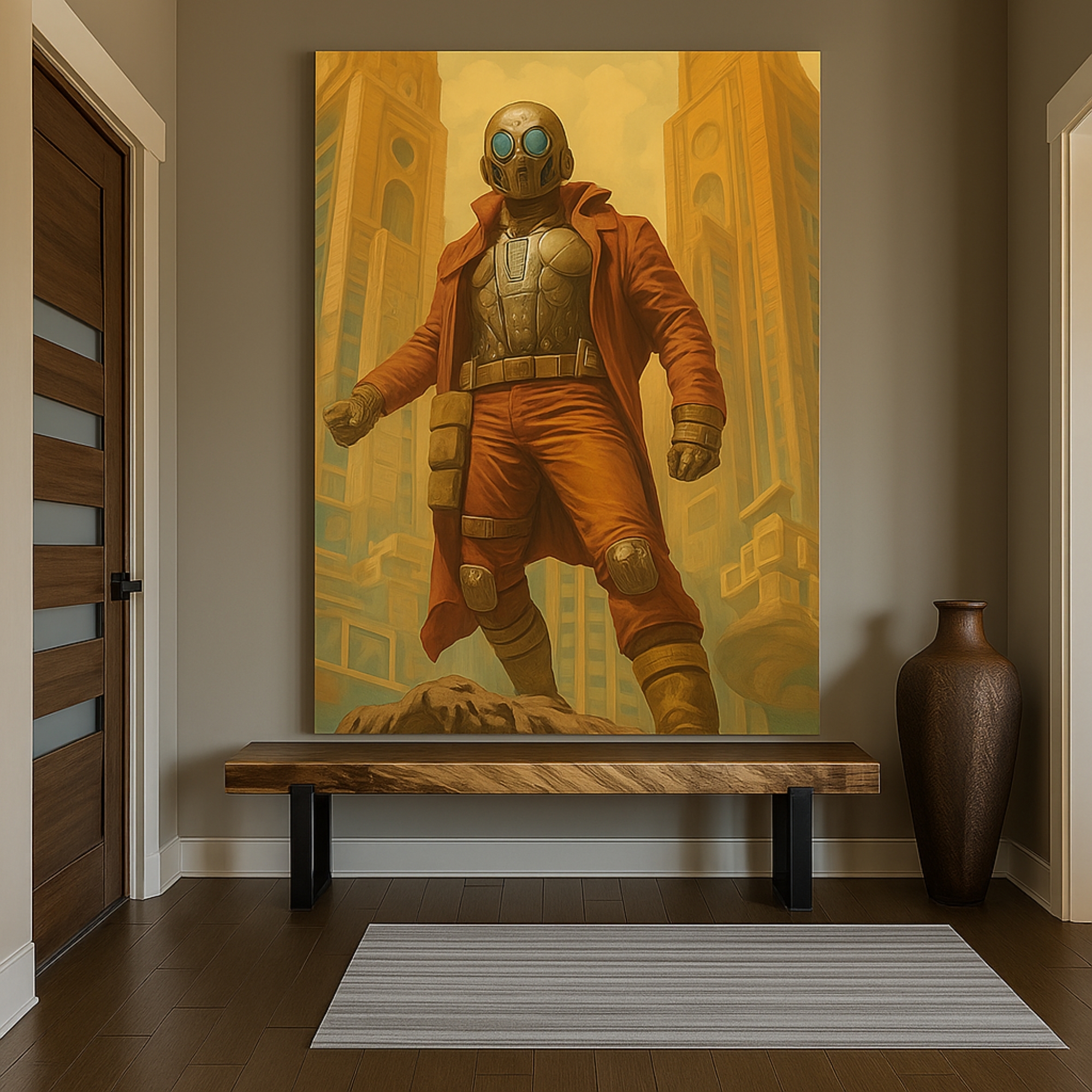 The artwork’s layered rust textures, mechanical detailing, and smoky background tones evoke themes of resilience, survival, and post-apocalyptic grit. Its visually rich composition brings an immersive futuristic mood to any modern interior, making it an excellent centerpiece for rooms that embrace mechanical aesthetics and atmospheric world-building. Ideal for contemporary Indian décor spaces that appreciate bold, imaginative, and tech-inspired wall art.