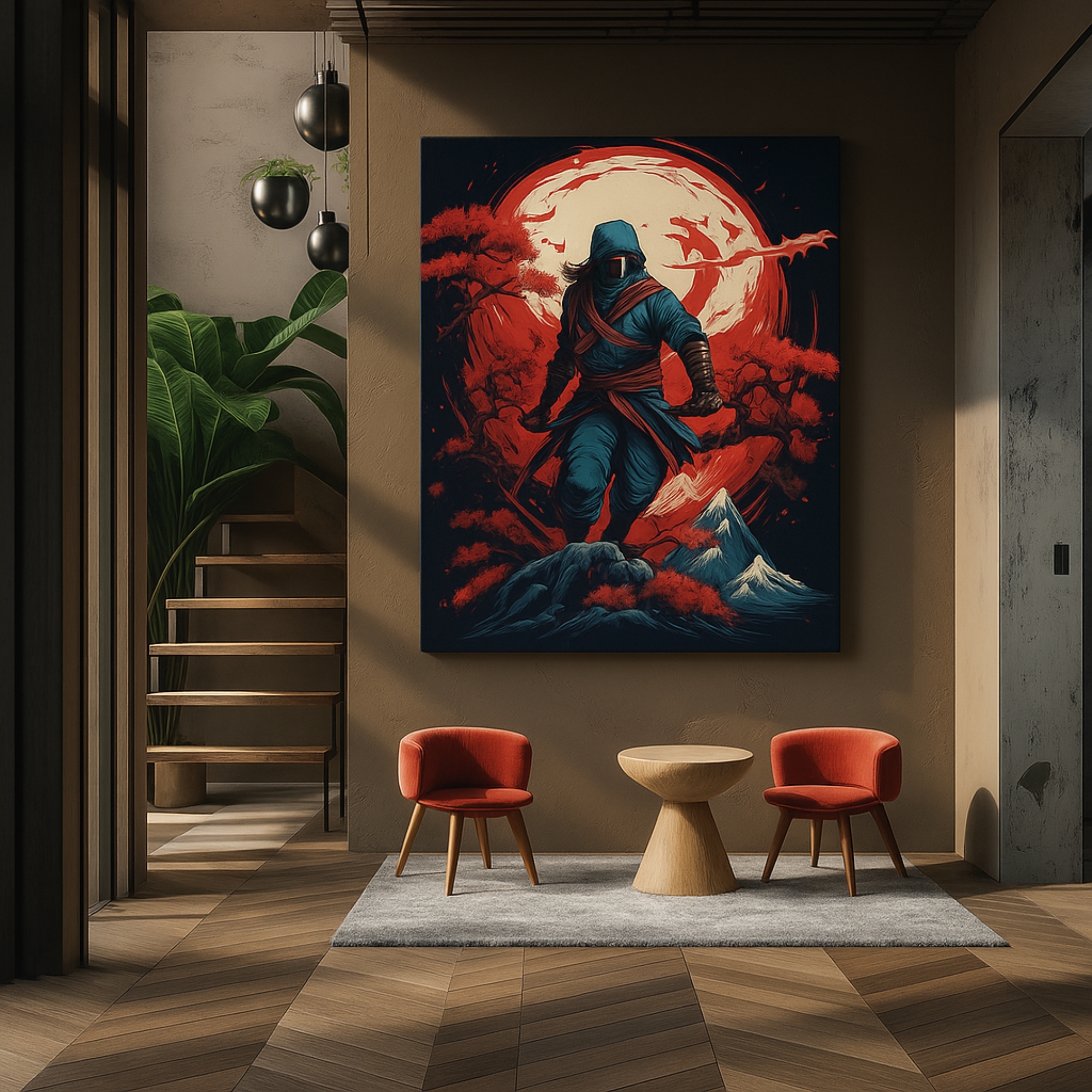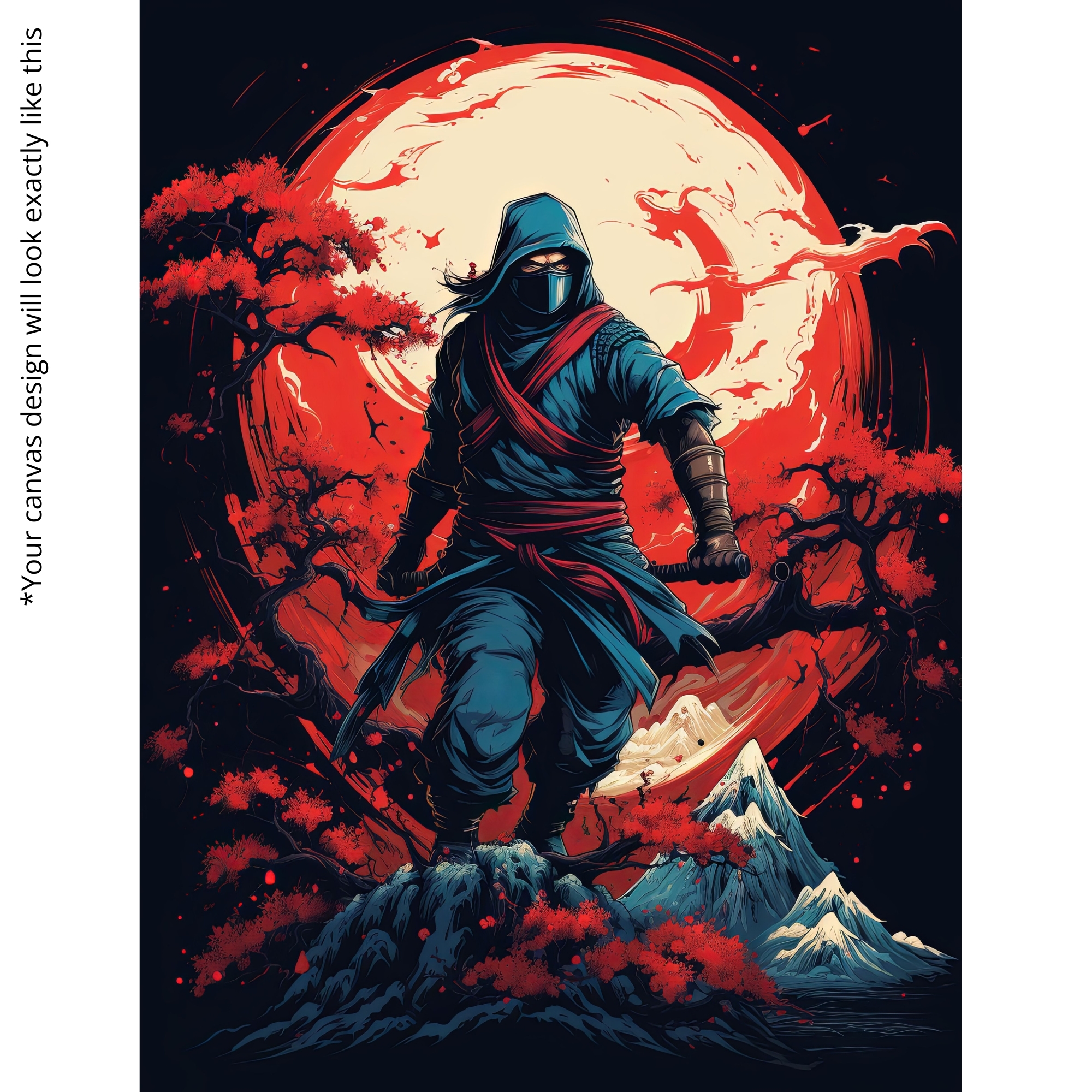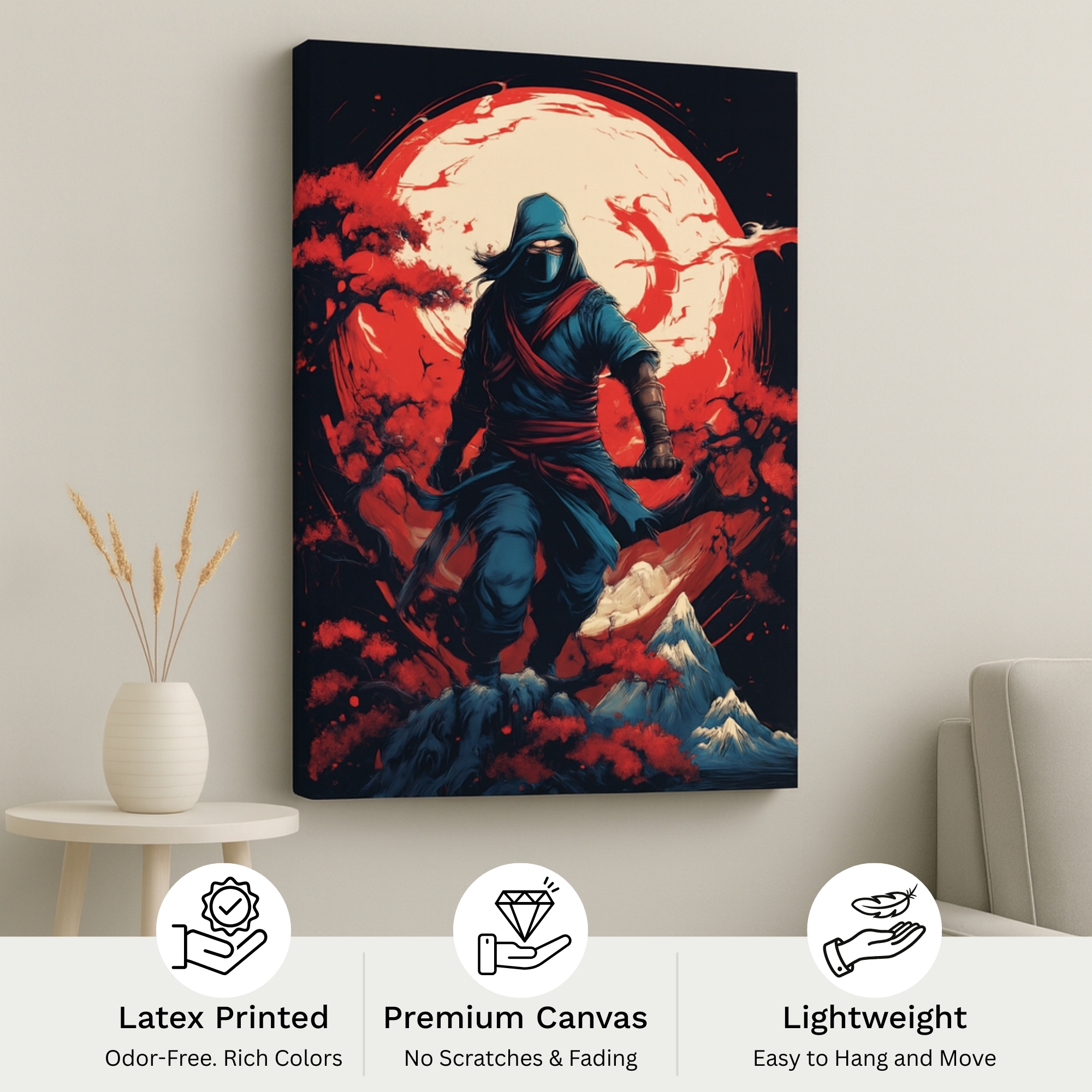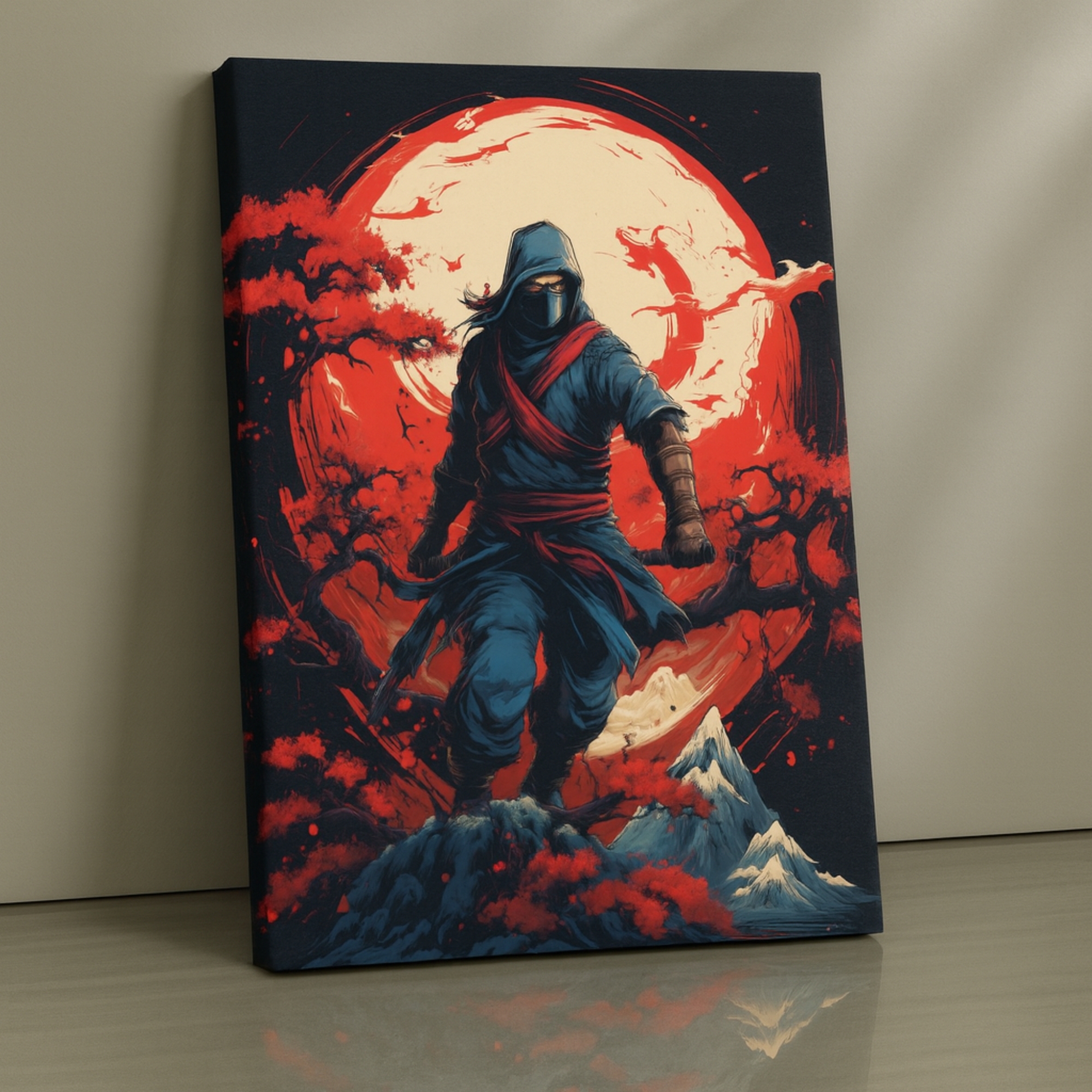 The Scarlet Moon Ninja Canvas Print depicts a masked warrior standing beneath a glowing crimson moon, enveloped in misty shadows and drifting embers. With its dramatic lighting and stealth-driven aesthetic, it is perfect for anime lovers, gaming setups, and night-themed interiors. The canvas print symbolizes silence, precision, and moonlit mystery.