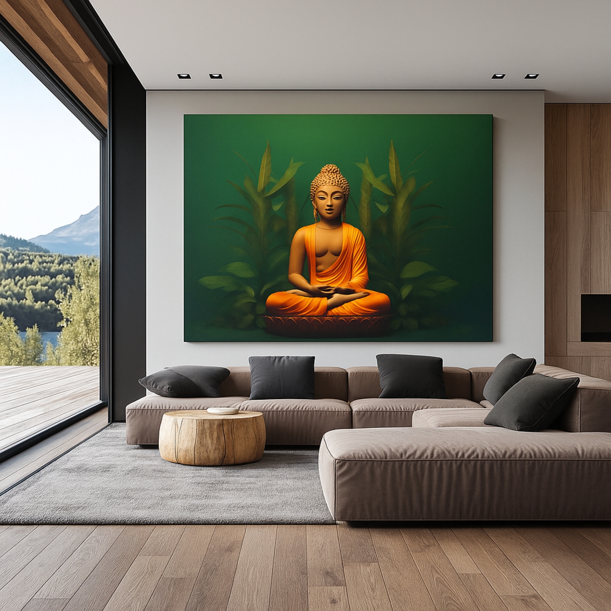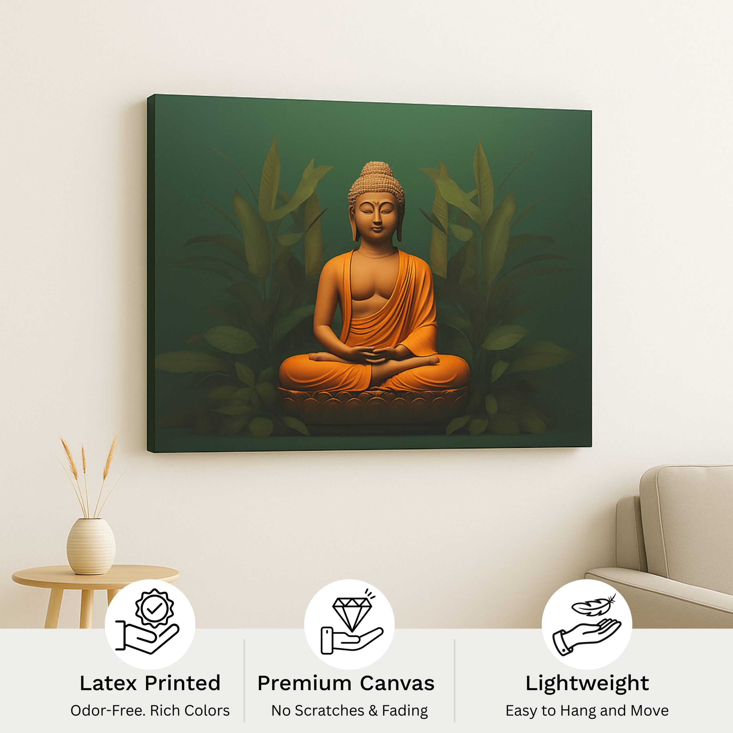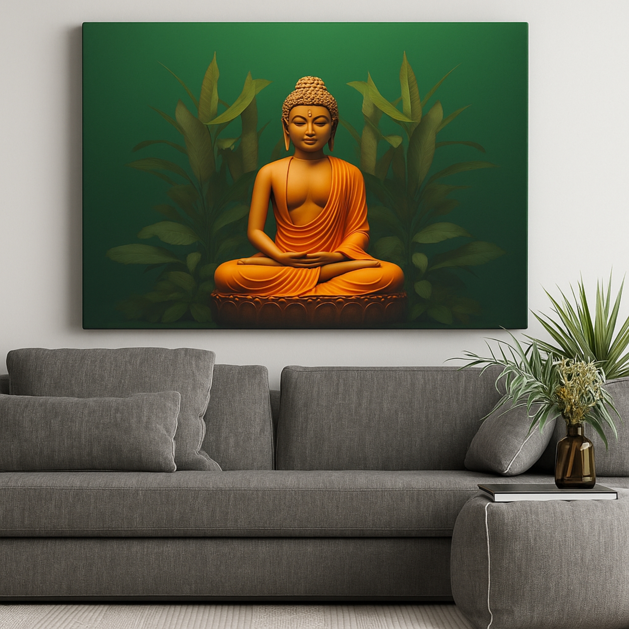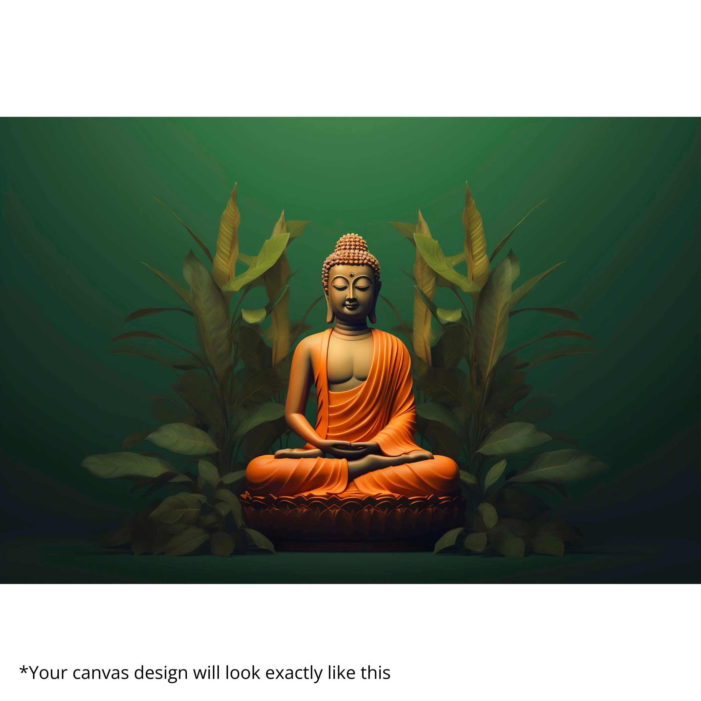 “Serene Green Aura” Canvas Print radiates calm energy with a golden Buddha seated in meditation against lush green foliage. The vibrant contrast of deep green and saffron tones symbolizes balance, grounding, and spiritual harmony. This artwork brings peace and positivity to any living or meditation space.