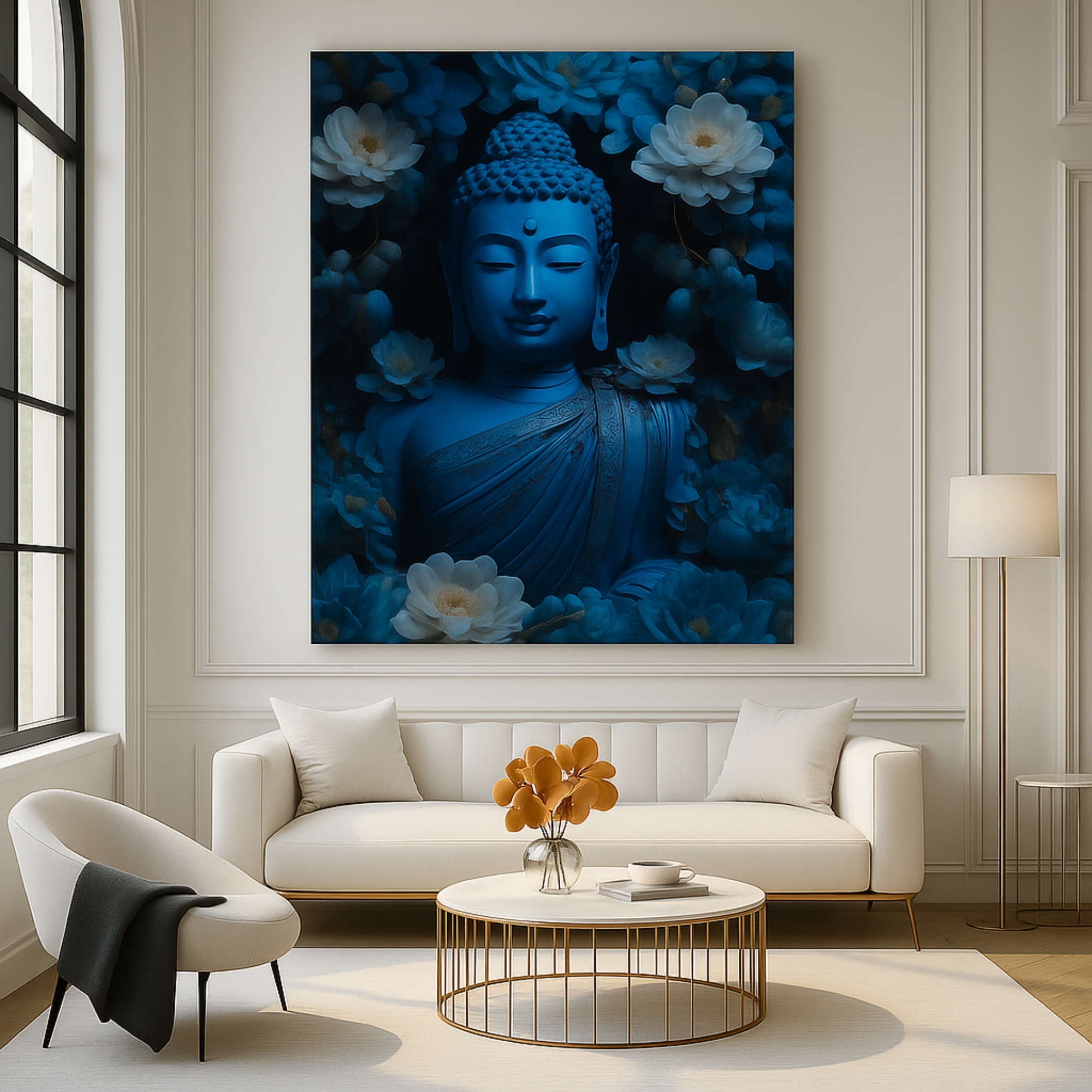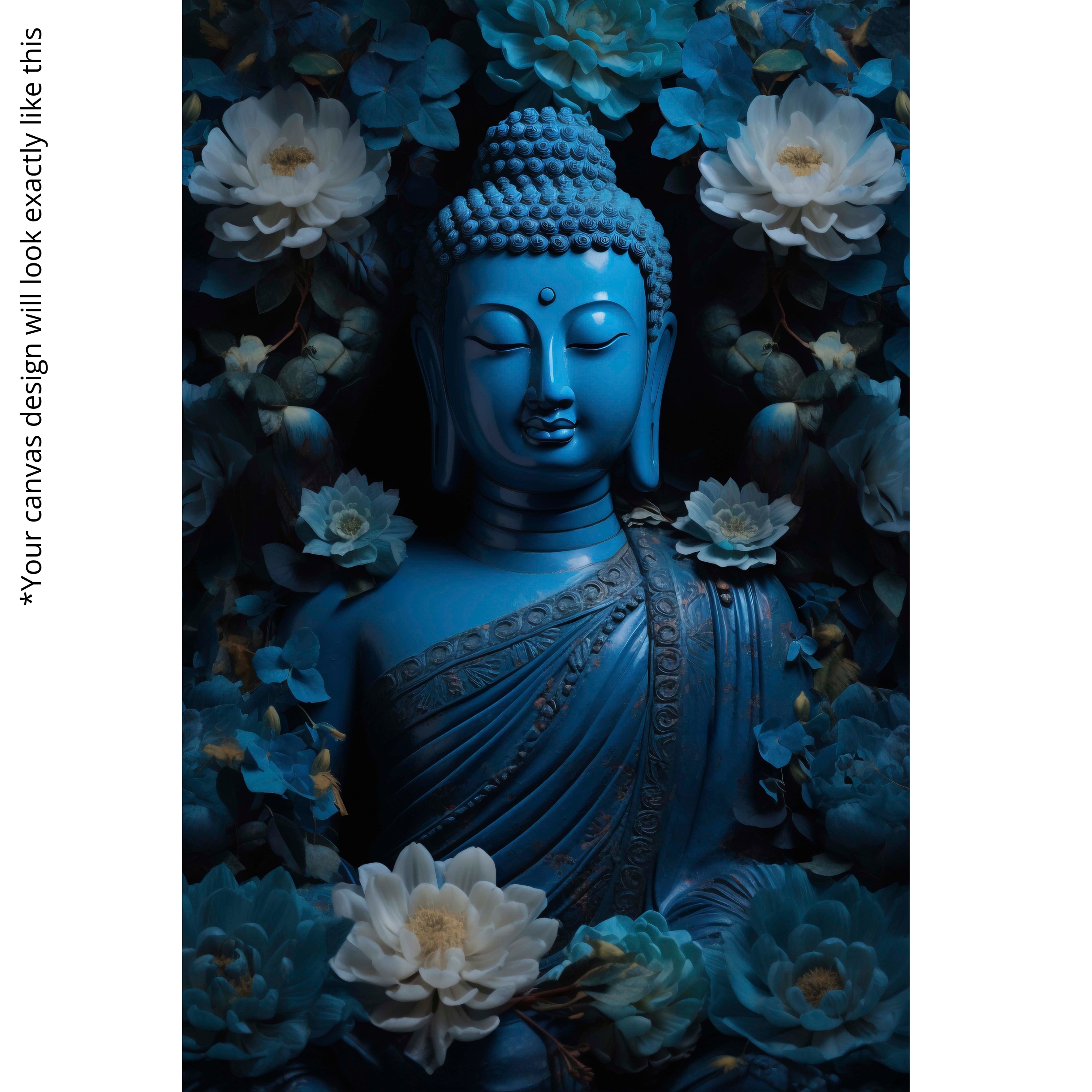 A deep sapphire-blue Buddha with lotuses, printed on premium canvas. Eco-friendly inks, fade-resistant, ready-to-hang.