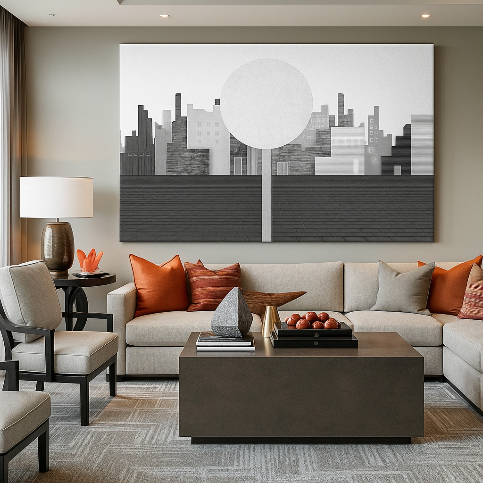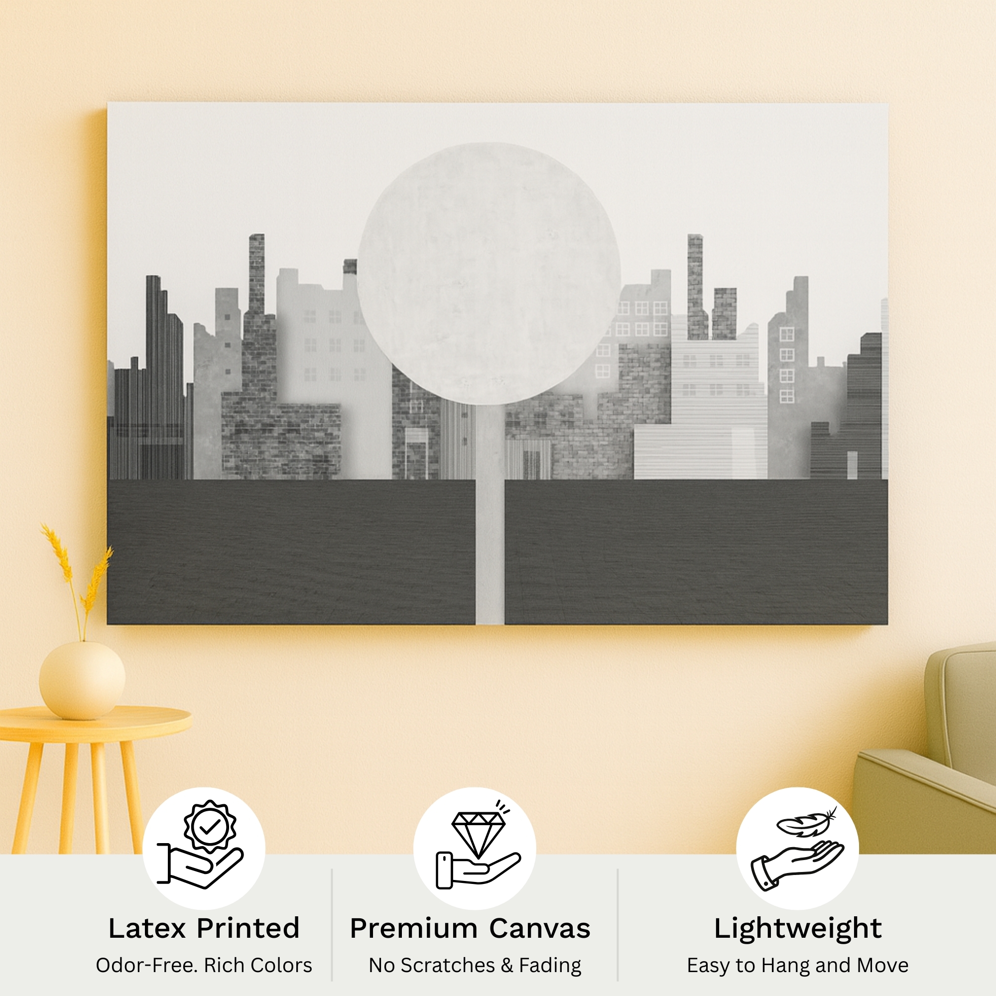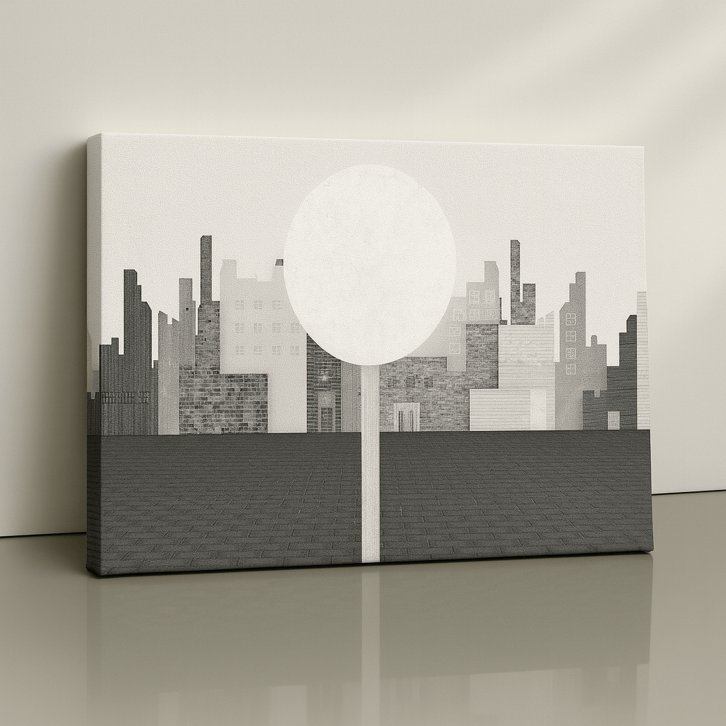 The Silent Skyline Moon canvas print blends a calm monochrome cityscape with a large glowing moon, creating a peaceful, dreamlike urban scene. Perfect for brightening living rooms, nurseries, creative corners, and home offices, this canvas print delivers warmth, balance, and high-end aesthetic appeal. Playful Echoes fits beautifully with pastel décor, Scandinavian themes, and modern abstract styling.