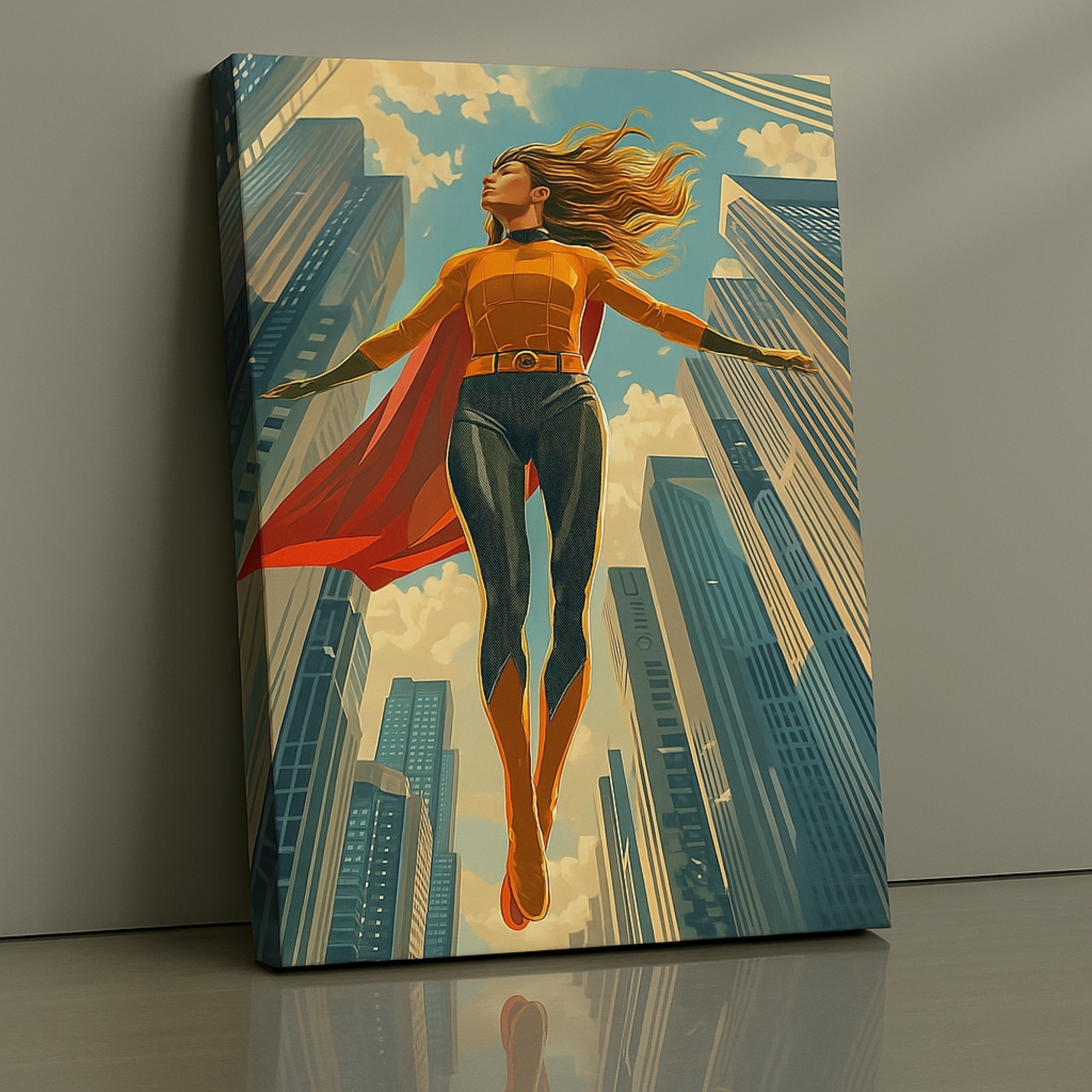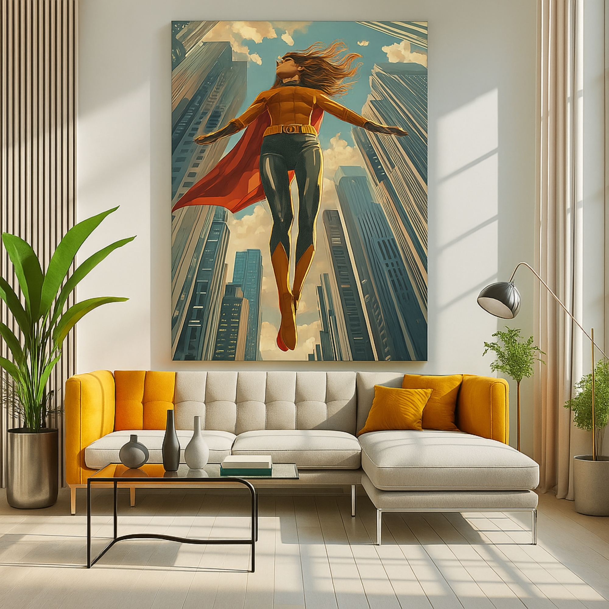 “Skybound Guardian” Canvas Print depicts a towering sentinel with metallic wings standing atop glowing cloudlit peaks. Soaring composition, sky blues, and ethereal highlights create a majestic protective presence—perfect for gaming lofts, modern living rooms, and interiors wanting an uplifting heroic tone. The blend of metallic textures and atmospheric haze gives rich cinematic depth.