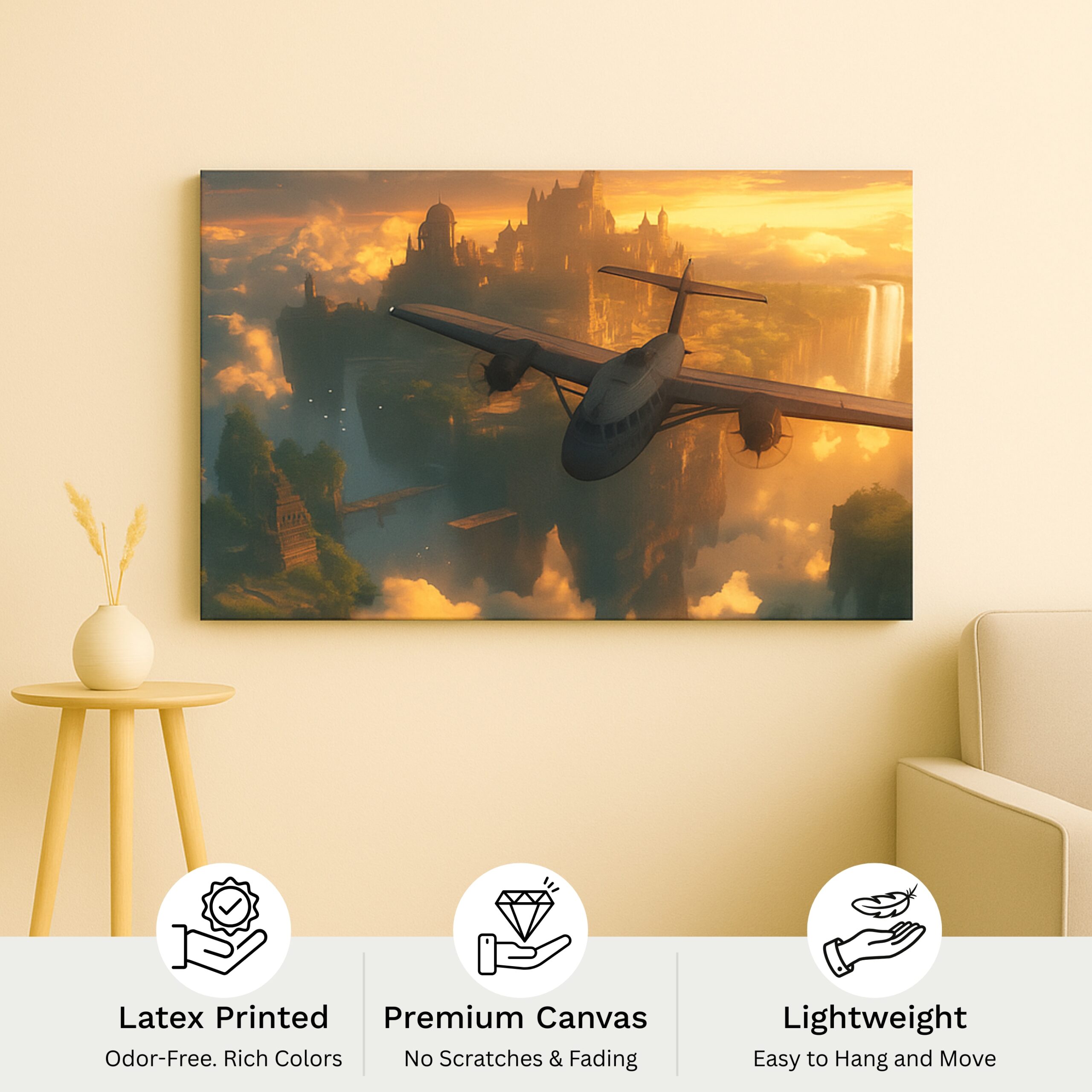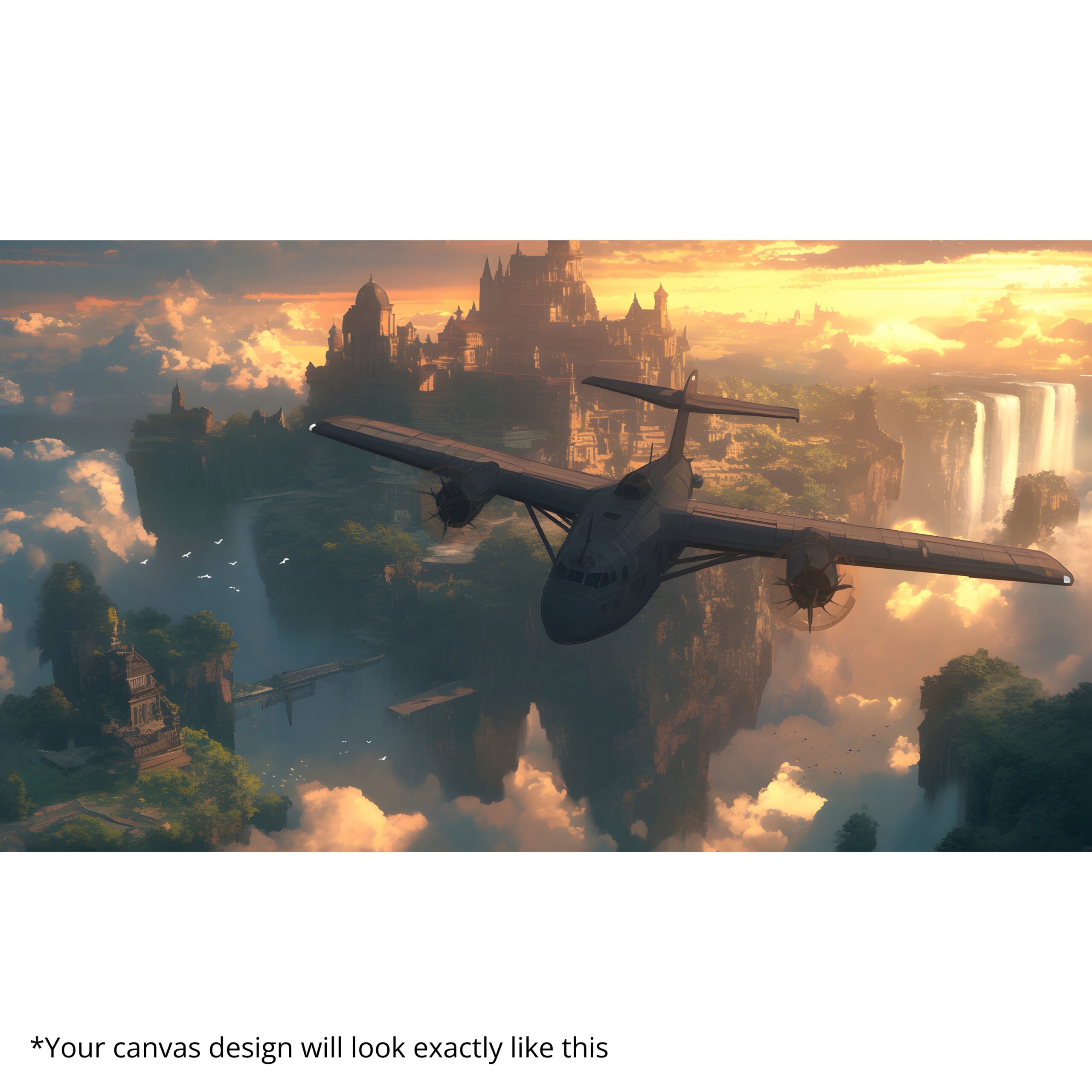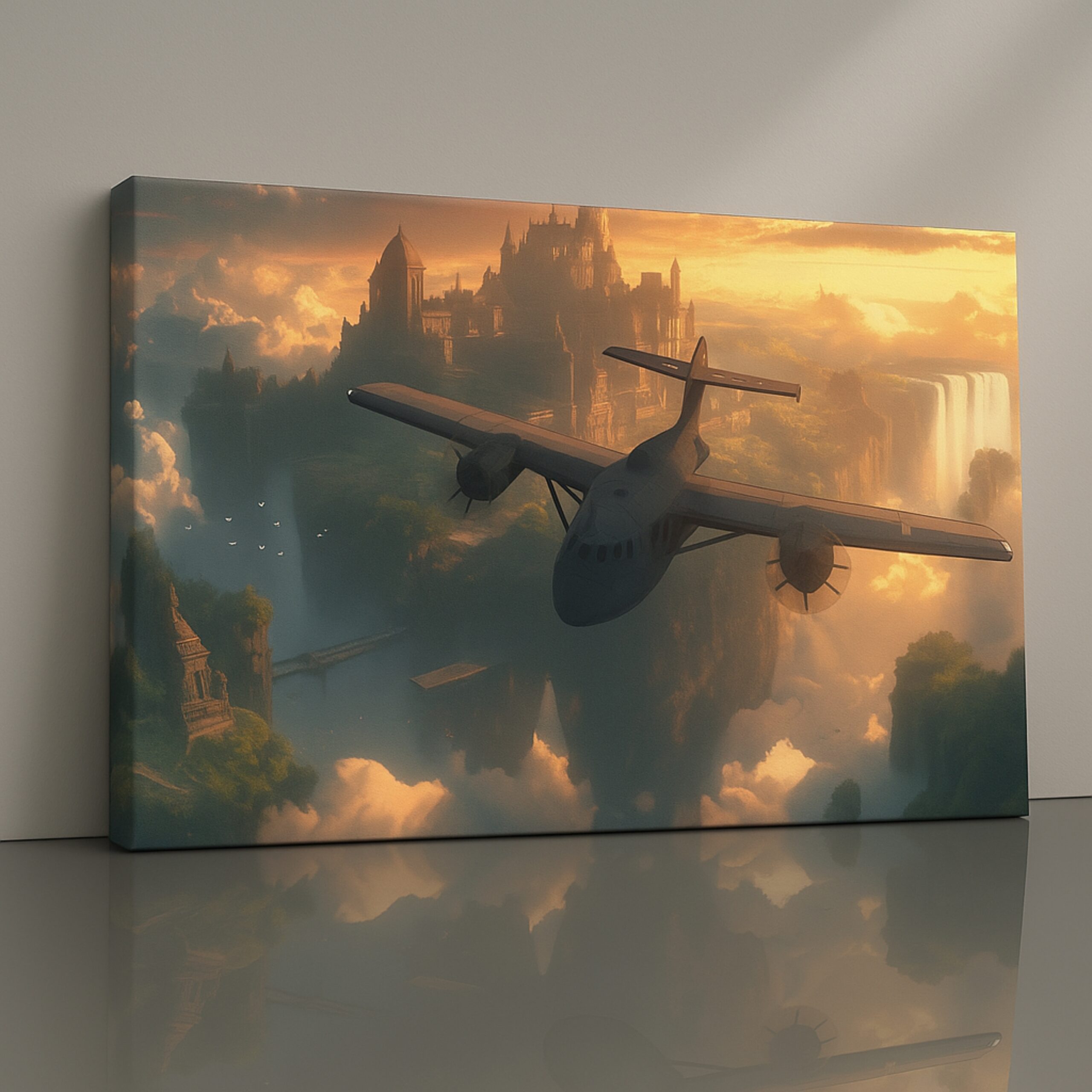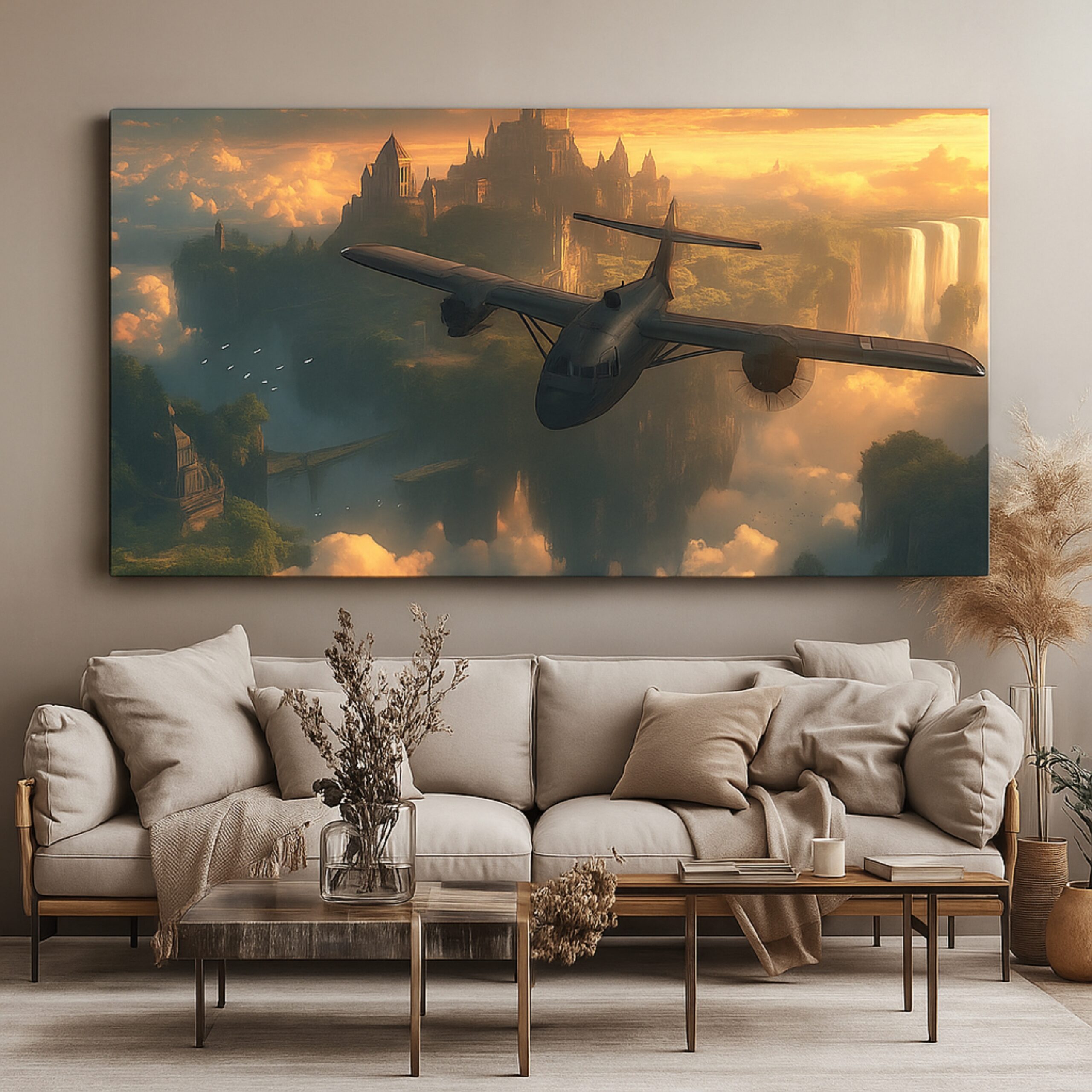 The Skybound Kingdom Canvas Print transports you into a fantasy world where golden light bathes floating castles above endless clouds. A lone aircraft soars into the horizon, symbolizing courage, imagination, and the pursuit of dreams. This canvas print blends cinematic depth with artistic wonder, making it a striking focal point for living rooms, study corners, and offices. Its breathtaking scale inspires serenity and wanderlust, turning blank walls into portals of exploration.