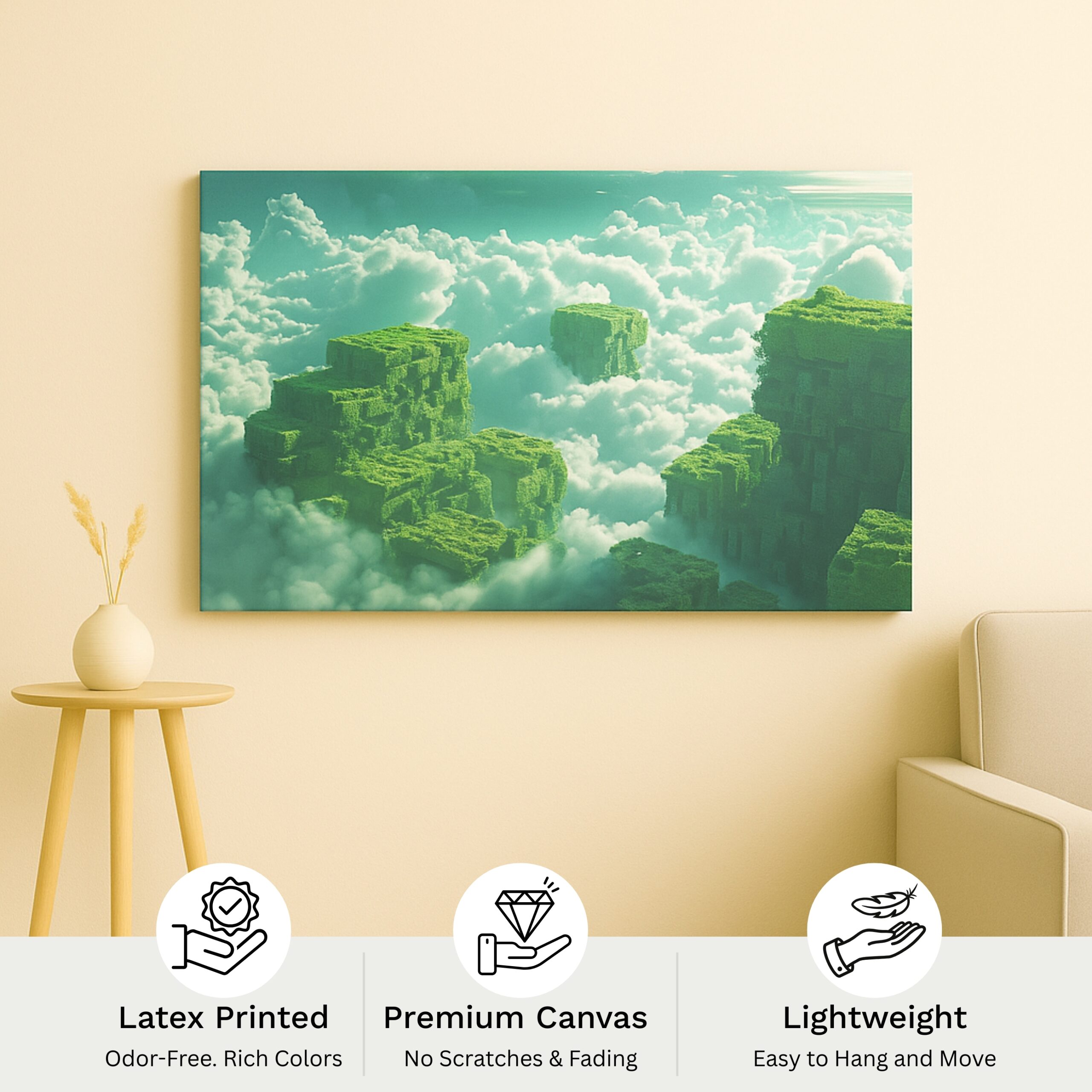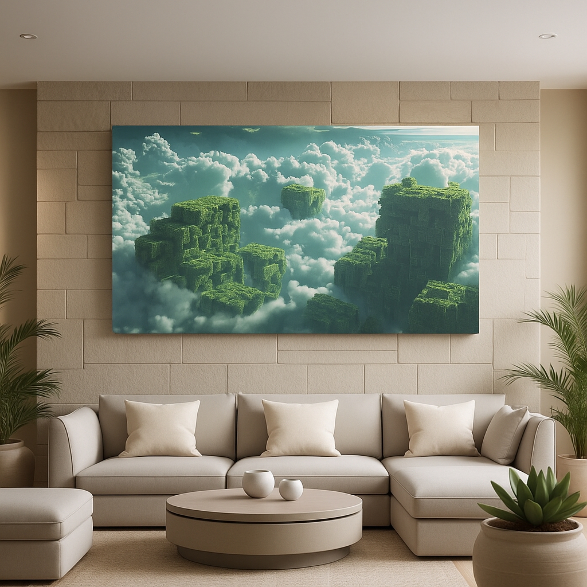 The Skyward Realms Canvas Print unveils dreamlike landscapes where towering green structures float above clouds, evoking awe and wonder. This canvas print transforms interiors into gateways to imagination, celebrating nature defying gravity. Rich tones and surreal composition make it a calming yet inspiring centerpiece for modern décor, ideal for dreamers who love fantasy landscapes.