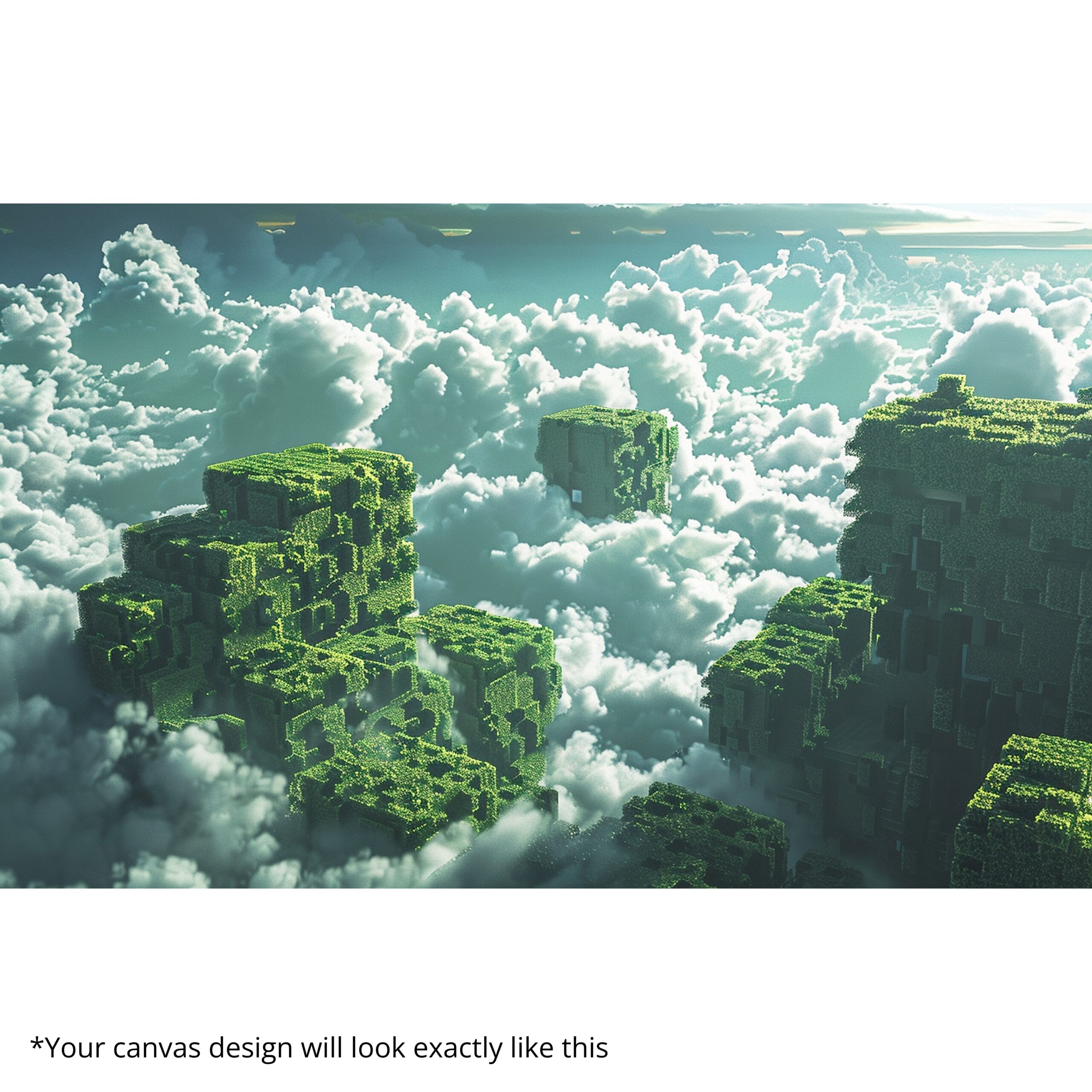 Surreal fantasy canvas of floating green structures in the clouds. Premium canvas, fade-resistant inks, hand-stretched, and ready-to-hang.