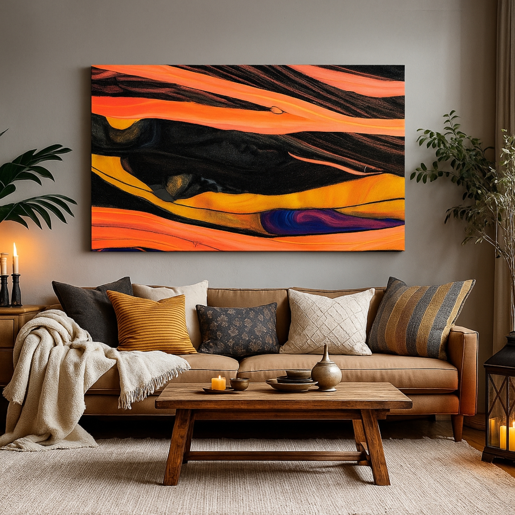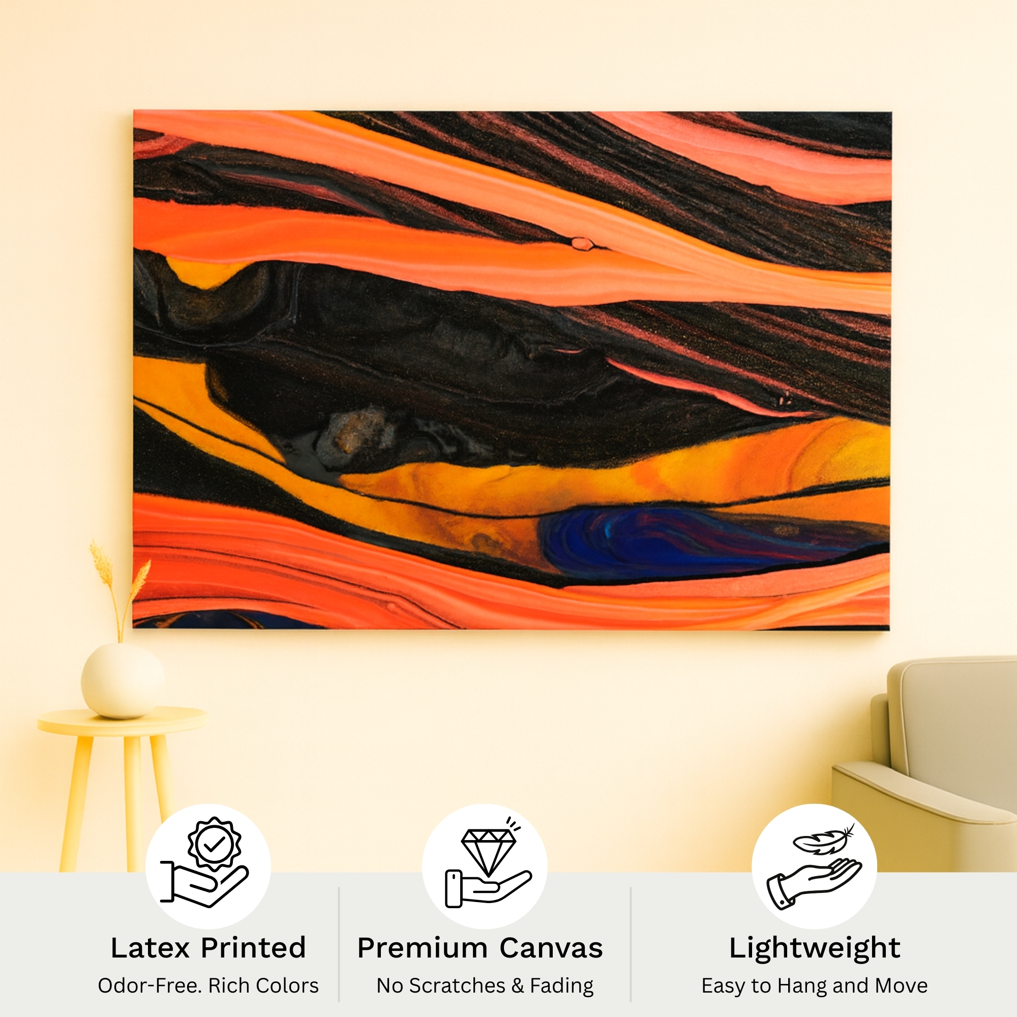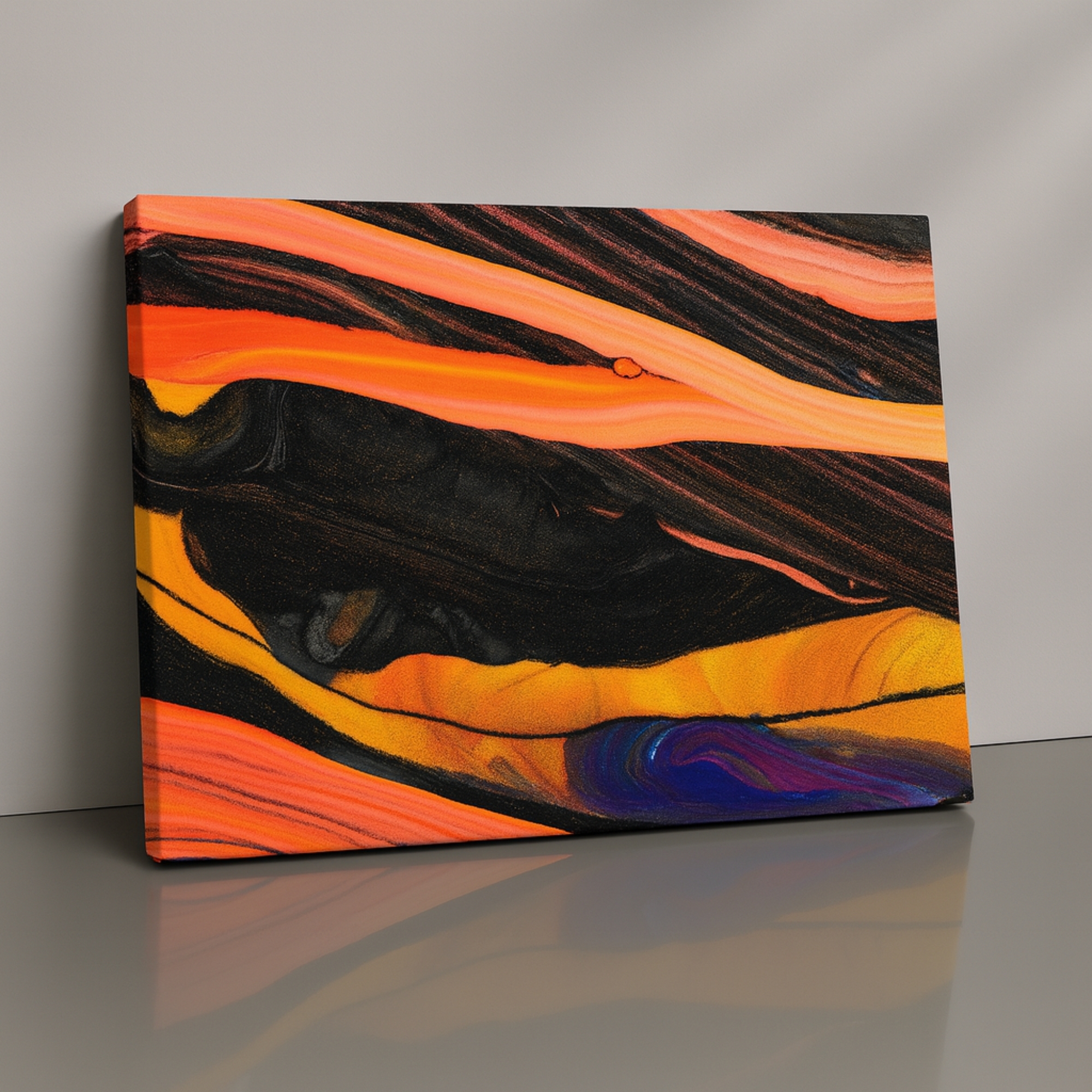 The Solar Ember Flow canvas print bursts with fiery oranges, molten yellows, deep blacks, and streaks of intense color movement. Perfect for brightening living rooms, nurseries, creative corners, and home offices, this canvas print delivers warmth, balance, and high-end aesthetic appeal. Playful Echoes fits beautifully with pastel décor, Scandinavian themes, and modern abstract styling. Its high-contrast palette creates dramatic visual impact and expressive character.