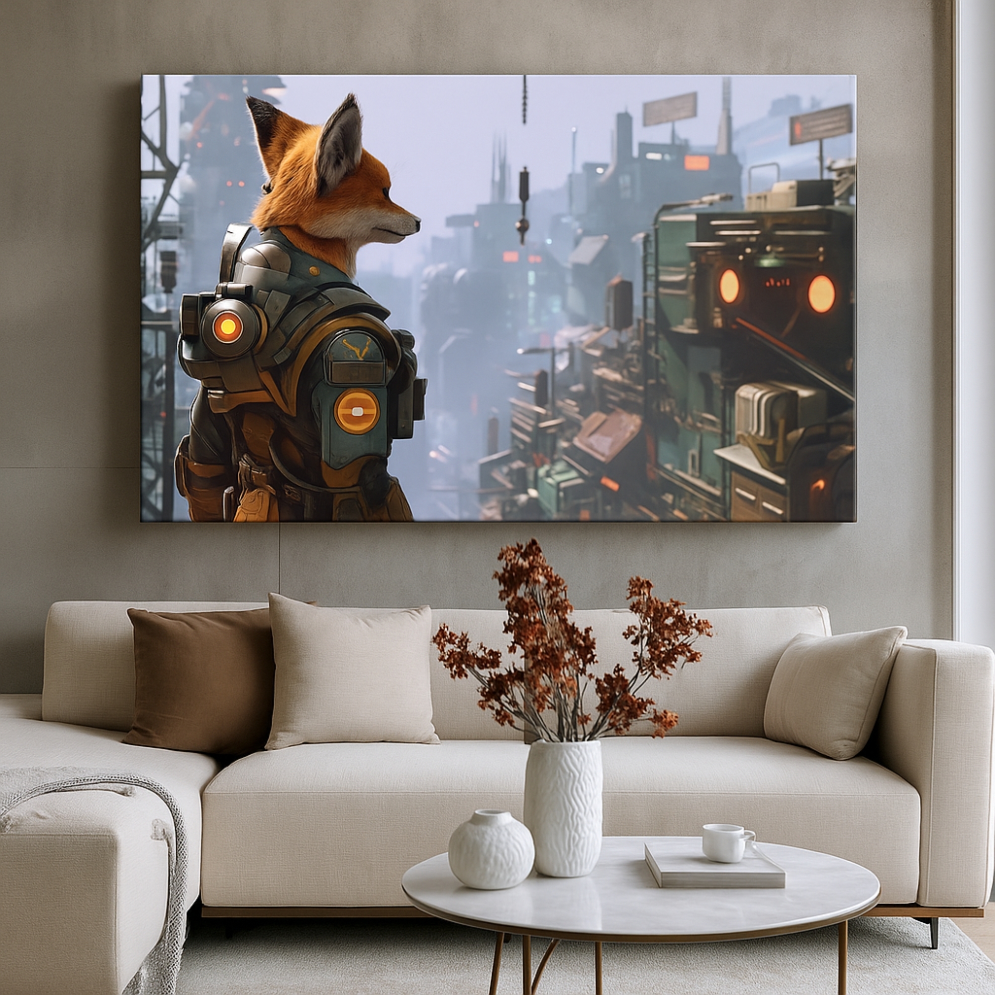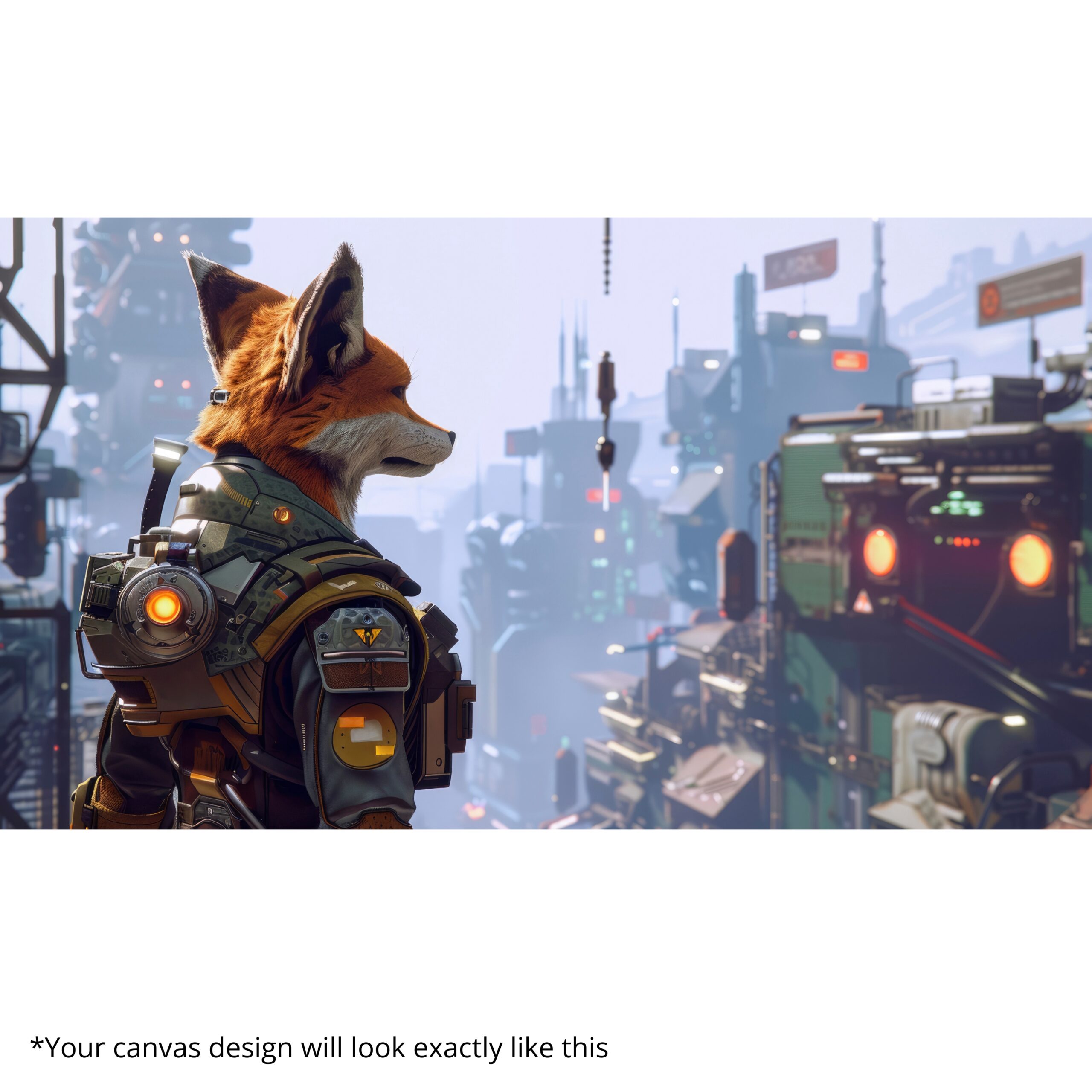 Futuristic fox adventurer overlooking neon city skyline. Premium canvas, fade-resistant inks, hand-stretched, ready-to-hang.