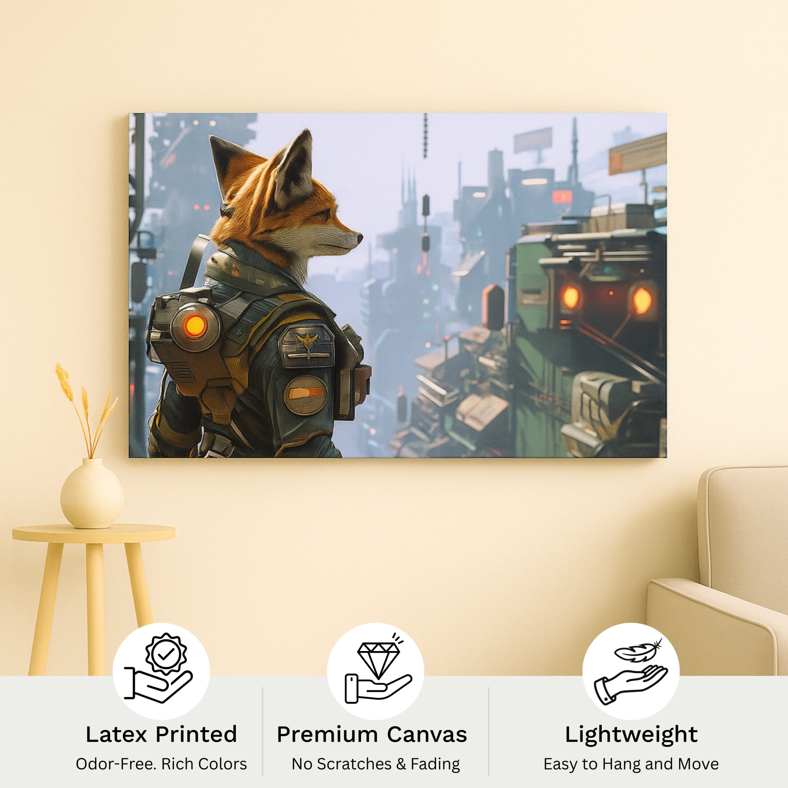 The Starbound Outlaw Canvas Print follows a lone fox-like adventurer in futuristic armor, gazing across a towering neon city. Independence, resilience, and curiosity define this cinematic scene, where anthropomorphic character design meets soaring sci-fi skylines. This canvas print adds depth and intrigue to living rooms, creative studios, and bedrooms, telling a story of courage and exploration that resonates with modern décor lovers and genre fans alike.