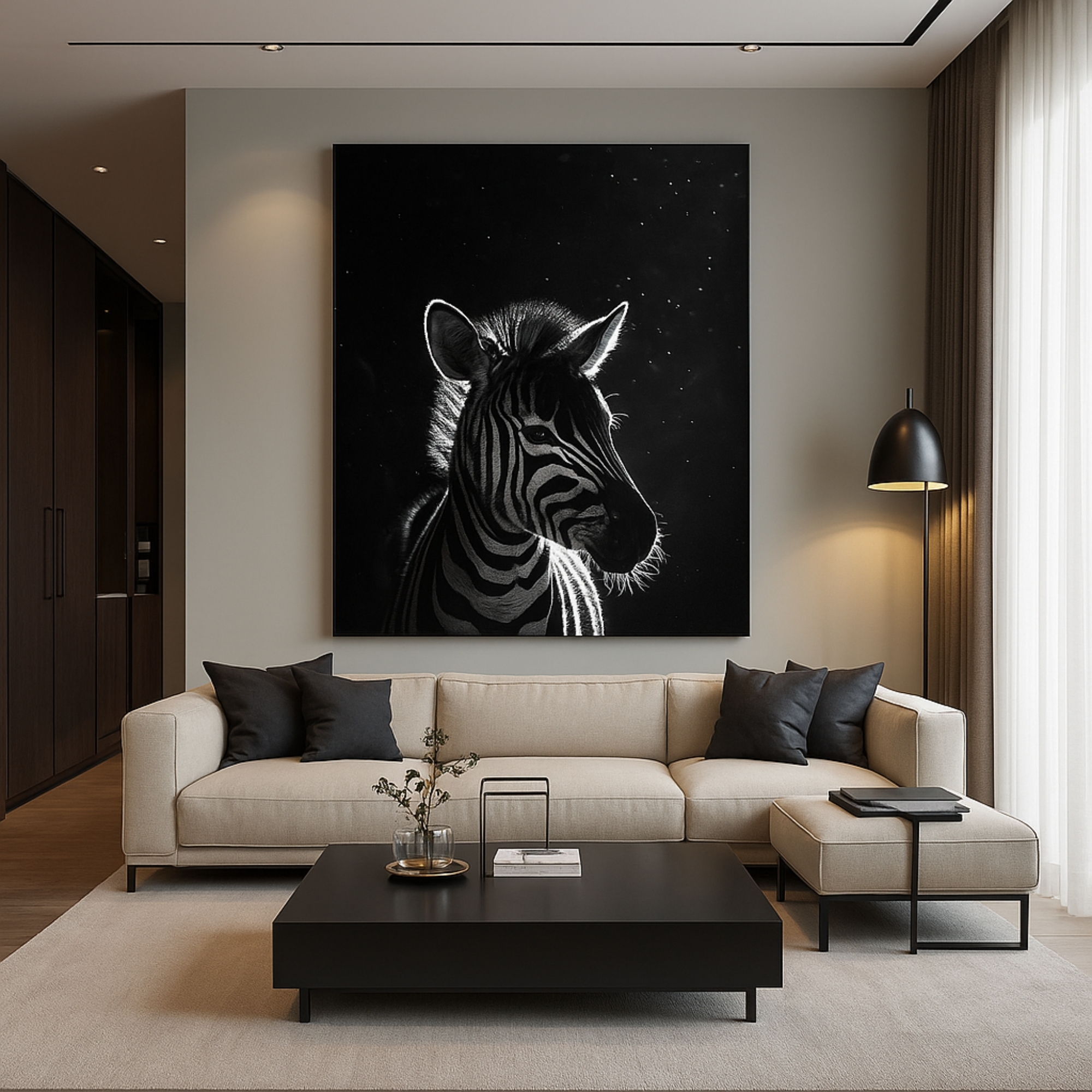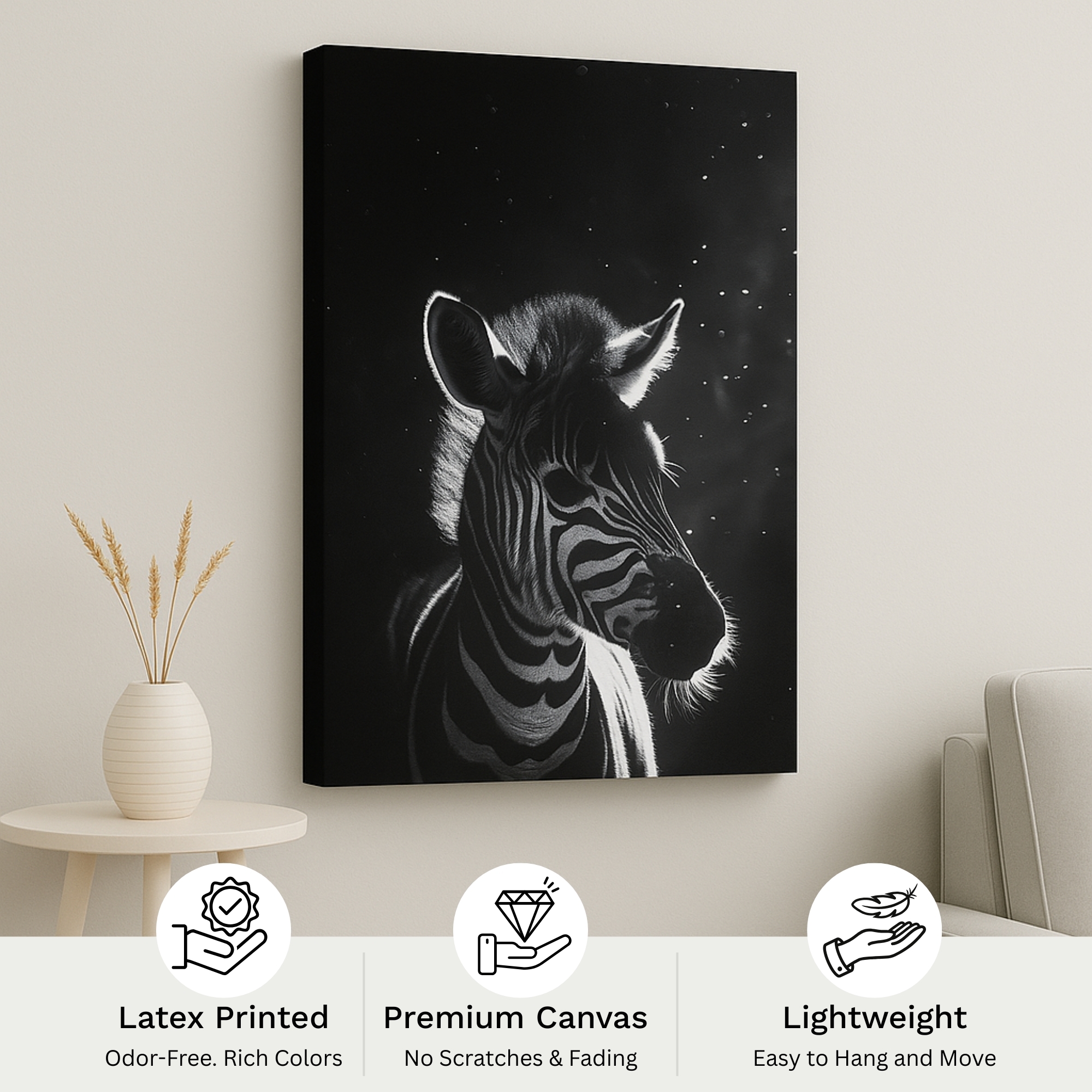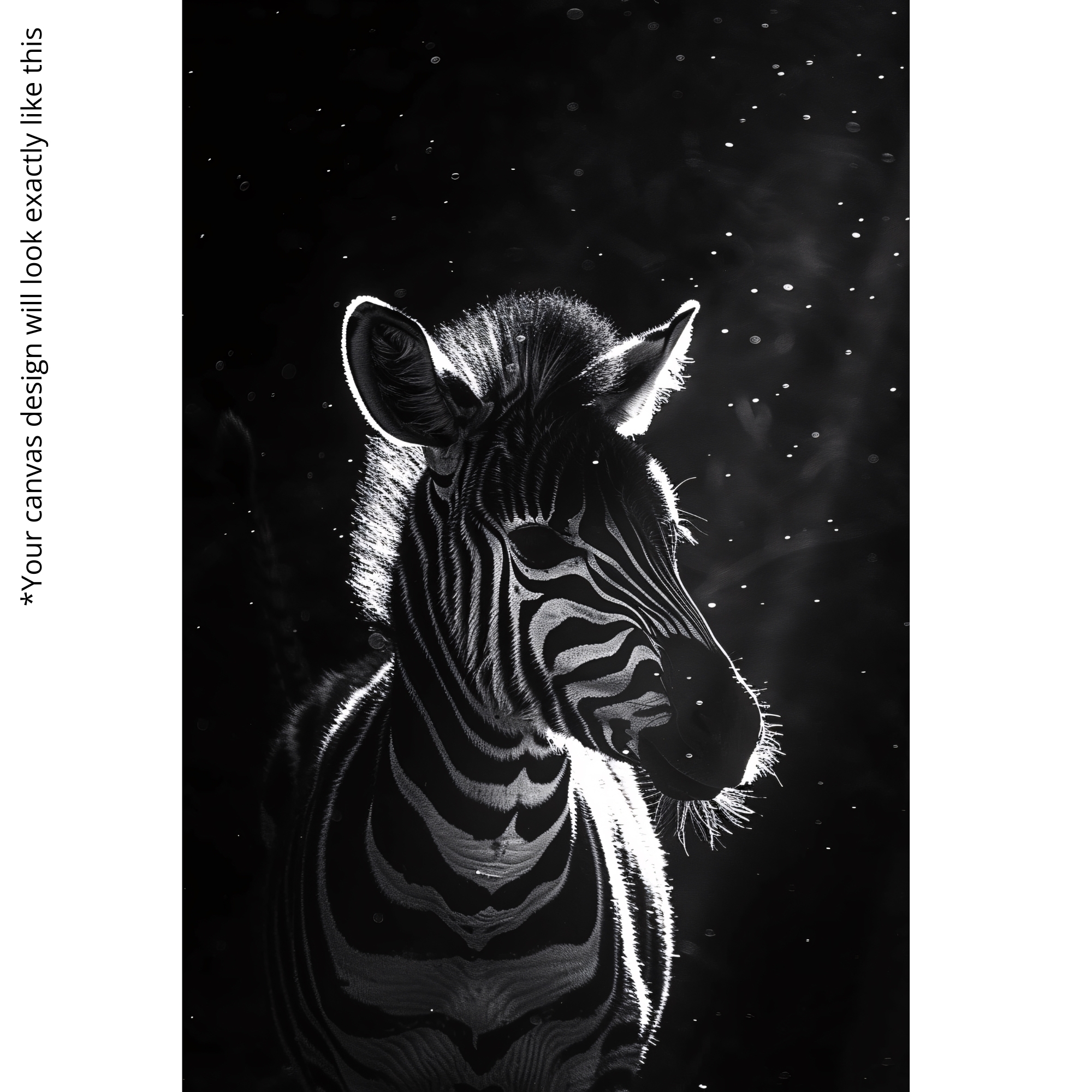 The Starlit Stripes Canvas Print features a striking zebra illuminated by soft celestial light against a deep night sky. High-contrast monochrome details and minimalistic focus make this artwork ideal for modern rooms, monochrome décor, bedrooms, and artistic spaces demanding elegant simplicity.