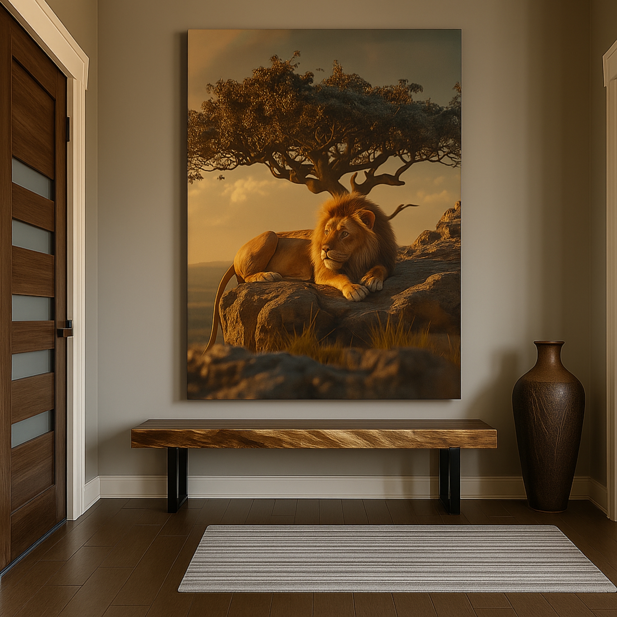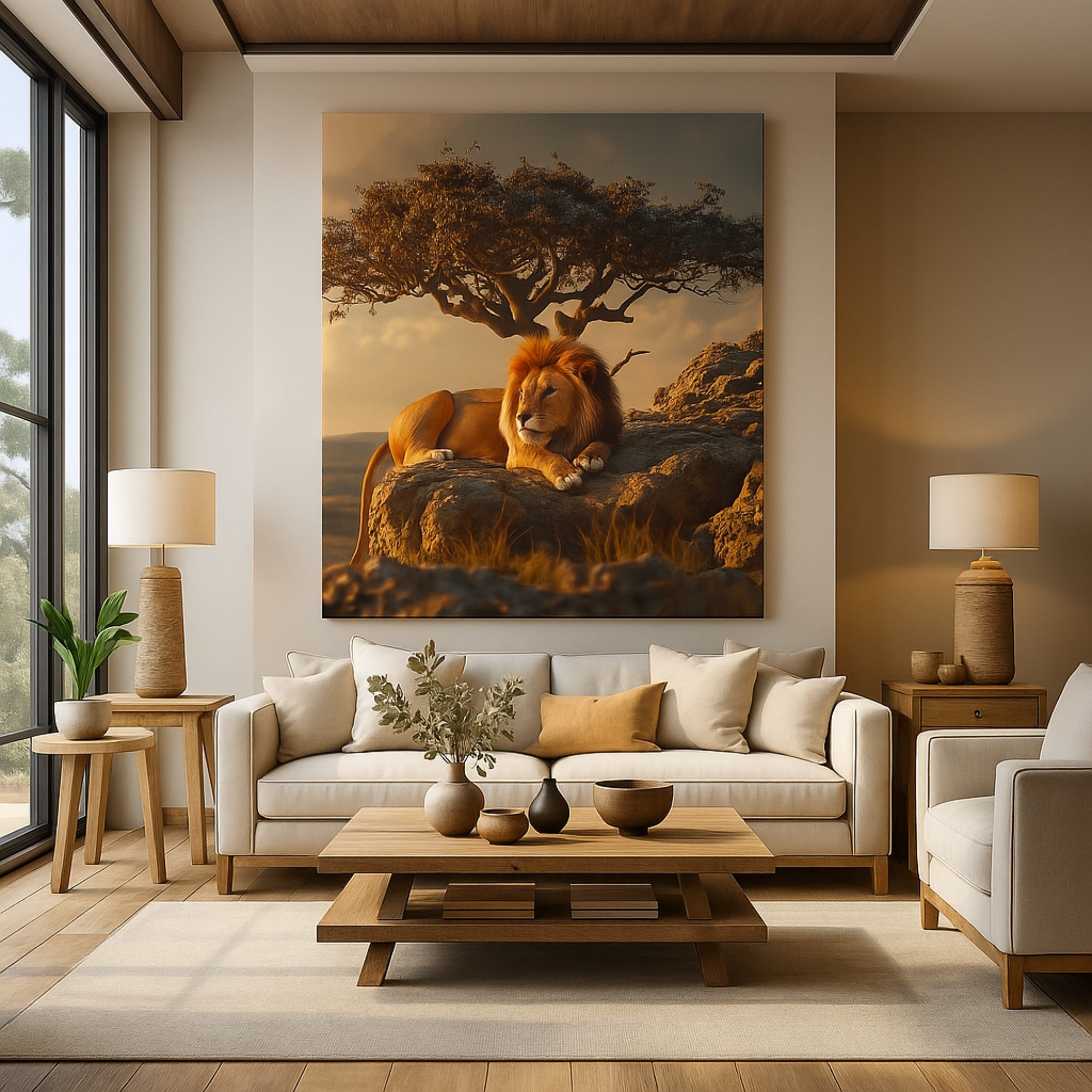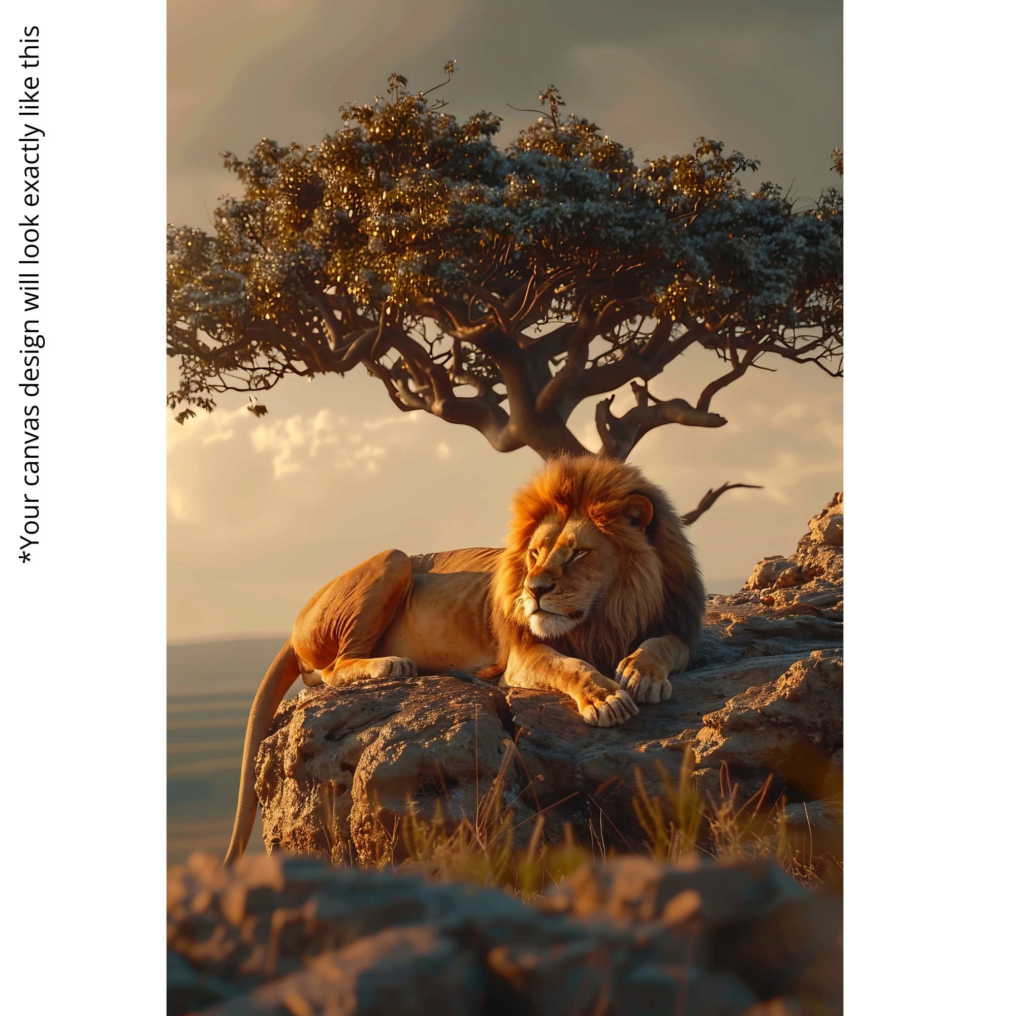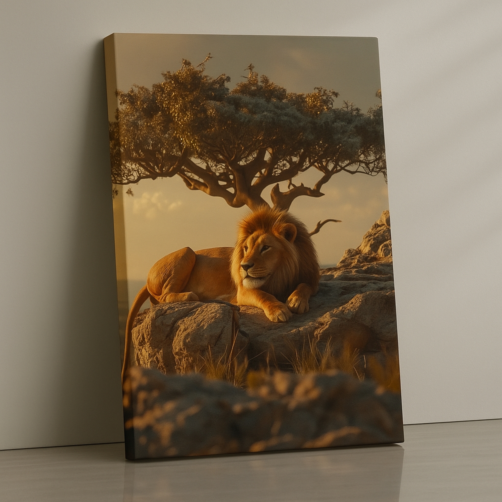 The Sunset King Canvas Print captures the peaceful strength of a lion relaxing atop sunlit rocks during golden hour. Warm light reflects across his mane, creating a cinematic wildlife portrait filled with calm authority and sunset glow. Perfect for earthy homes, warm-toned interiors, office walls, and safari-inspired décor.