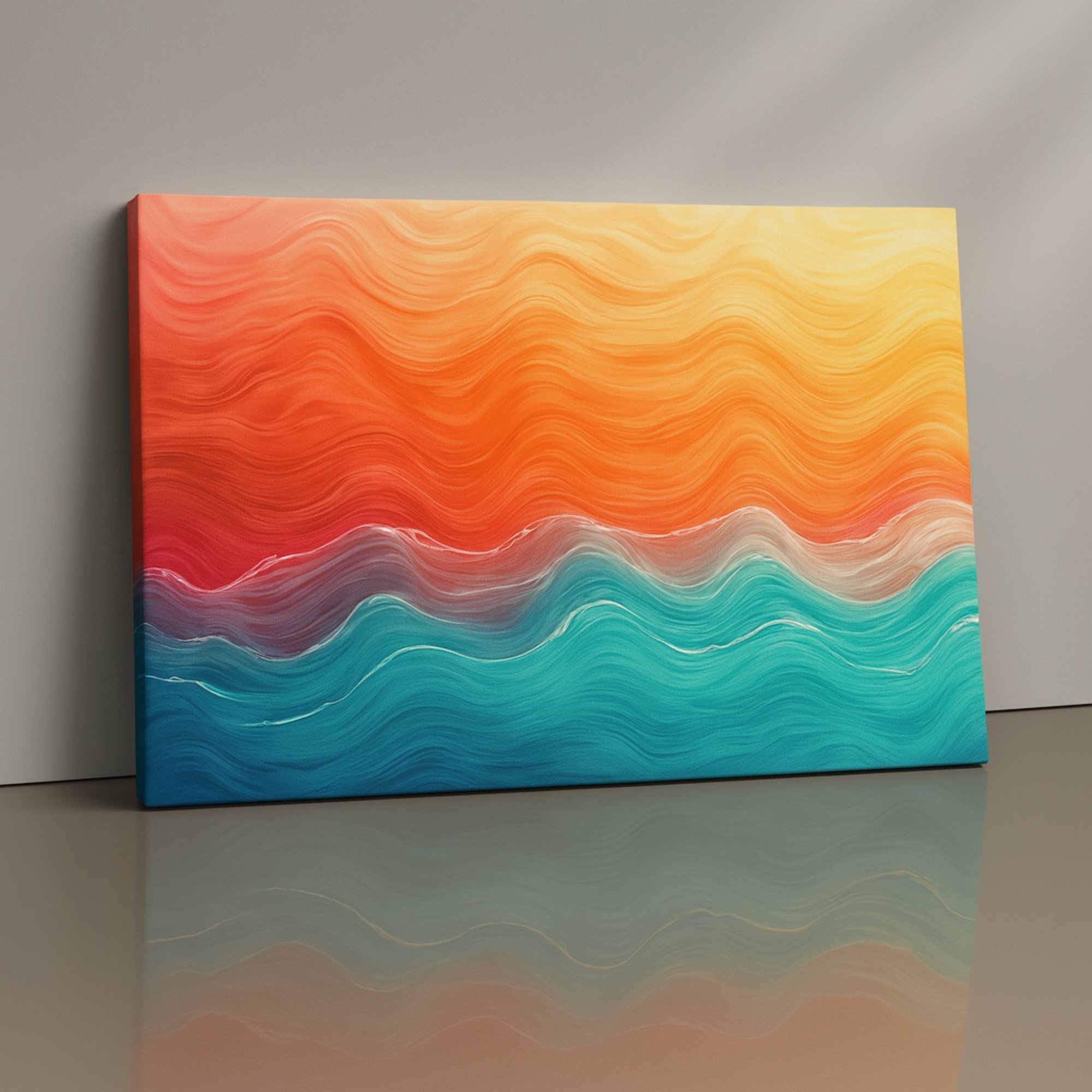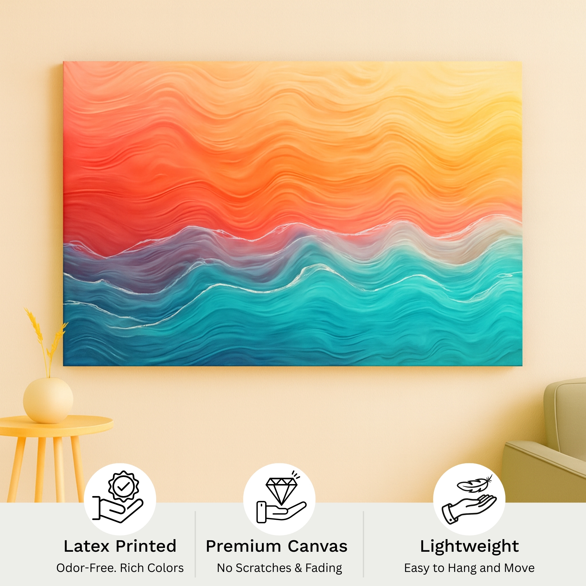 The Sunset Waves canvas print blends warm sunset hues with smooth ocean-inspired strokes to create a calming, uplifting décor statement. This canvas suits Indian modern spaces with its radiant gradients, soothing wave textures, and serene energy. Perfect for bedrooms, lounges, and relaxation corners, it adds warmth and balance through flowing color transitions.