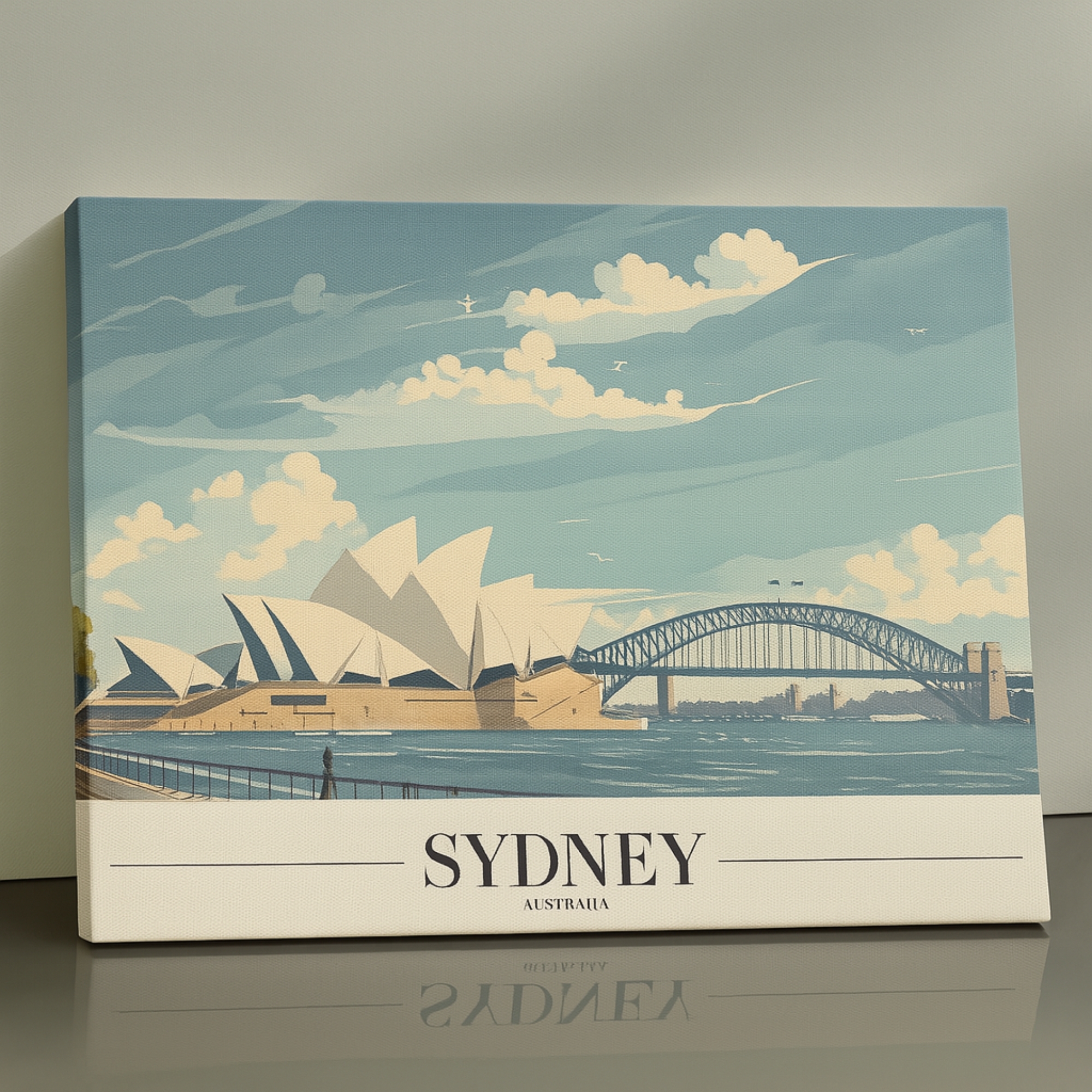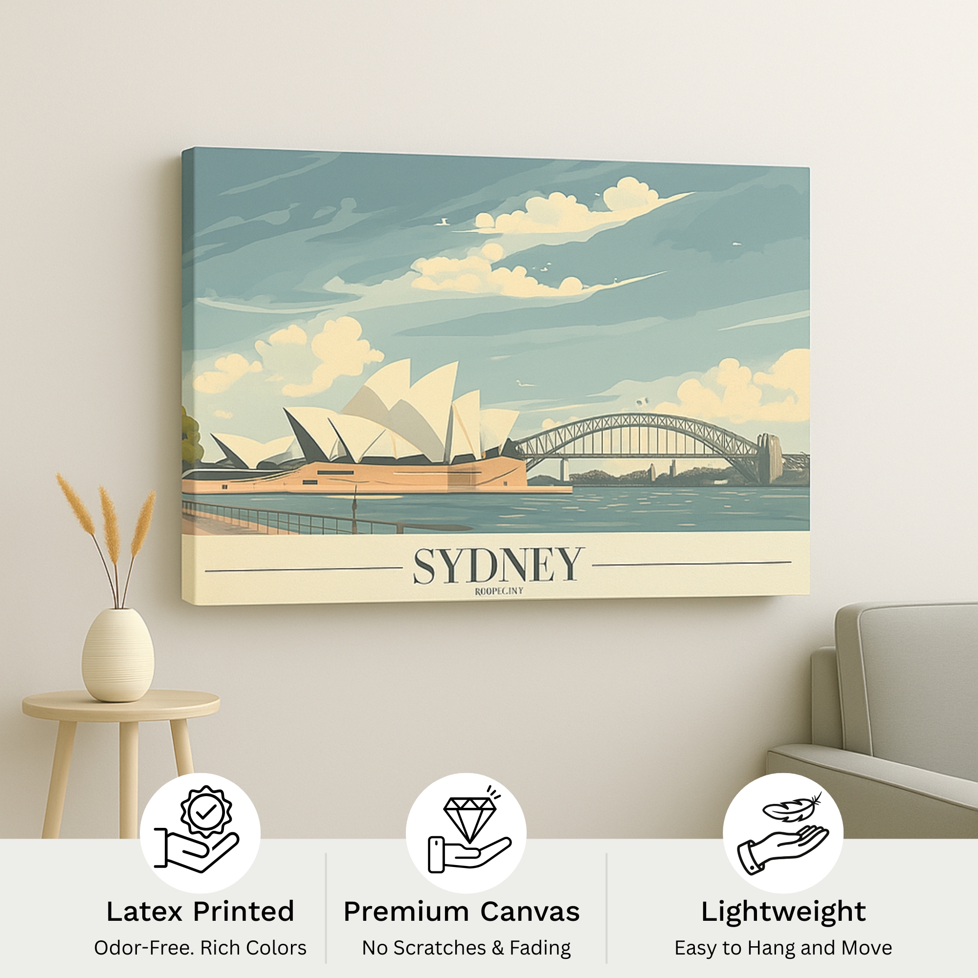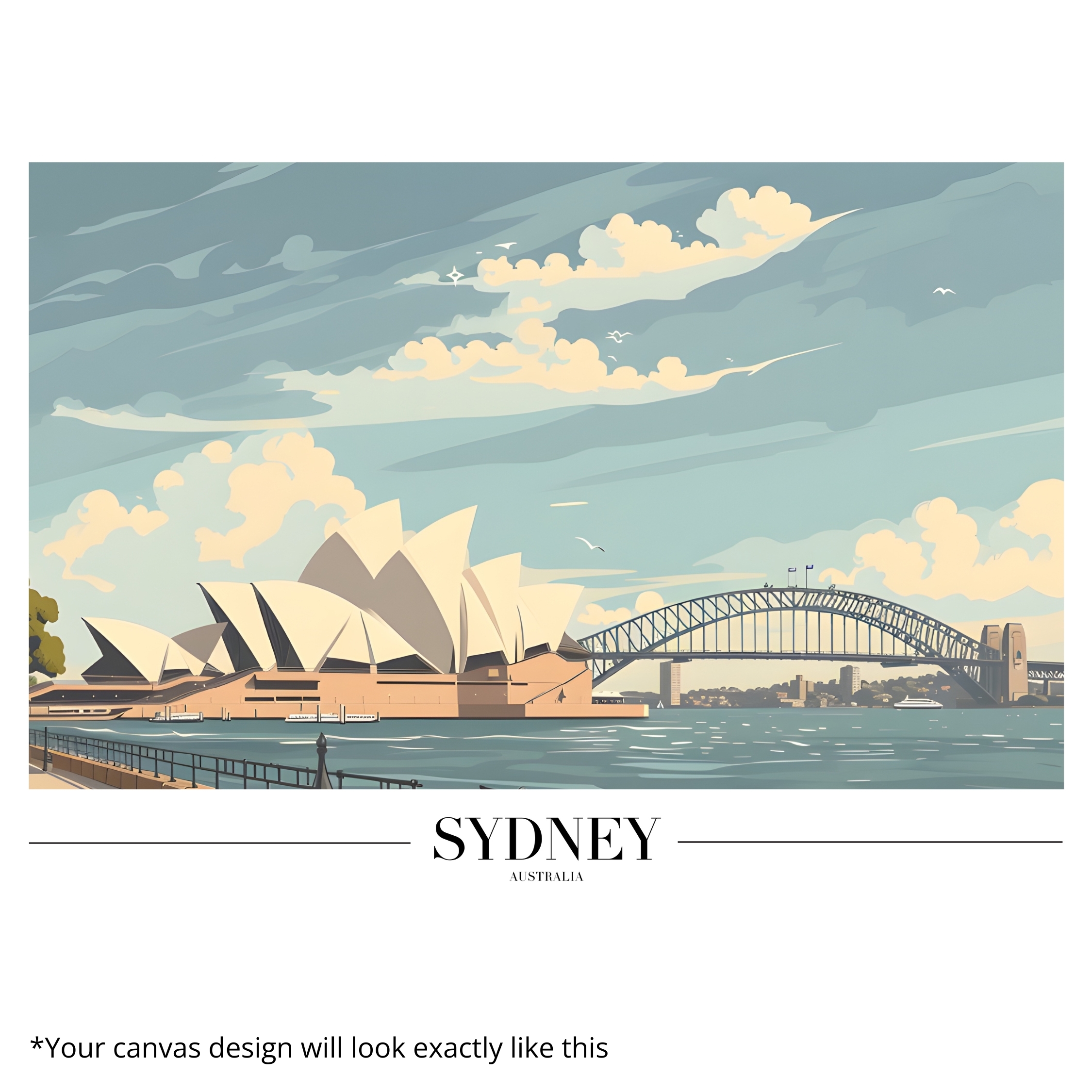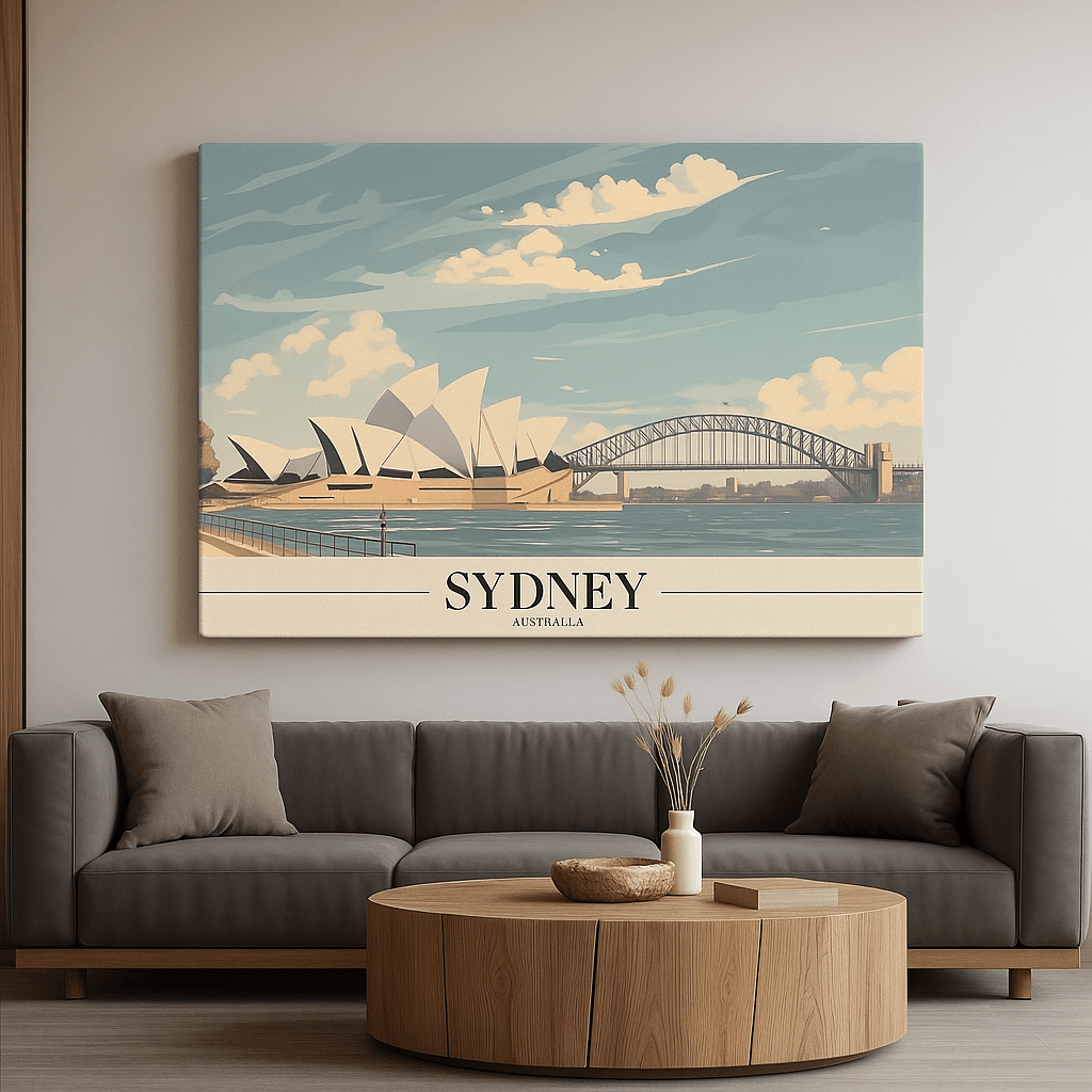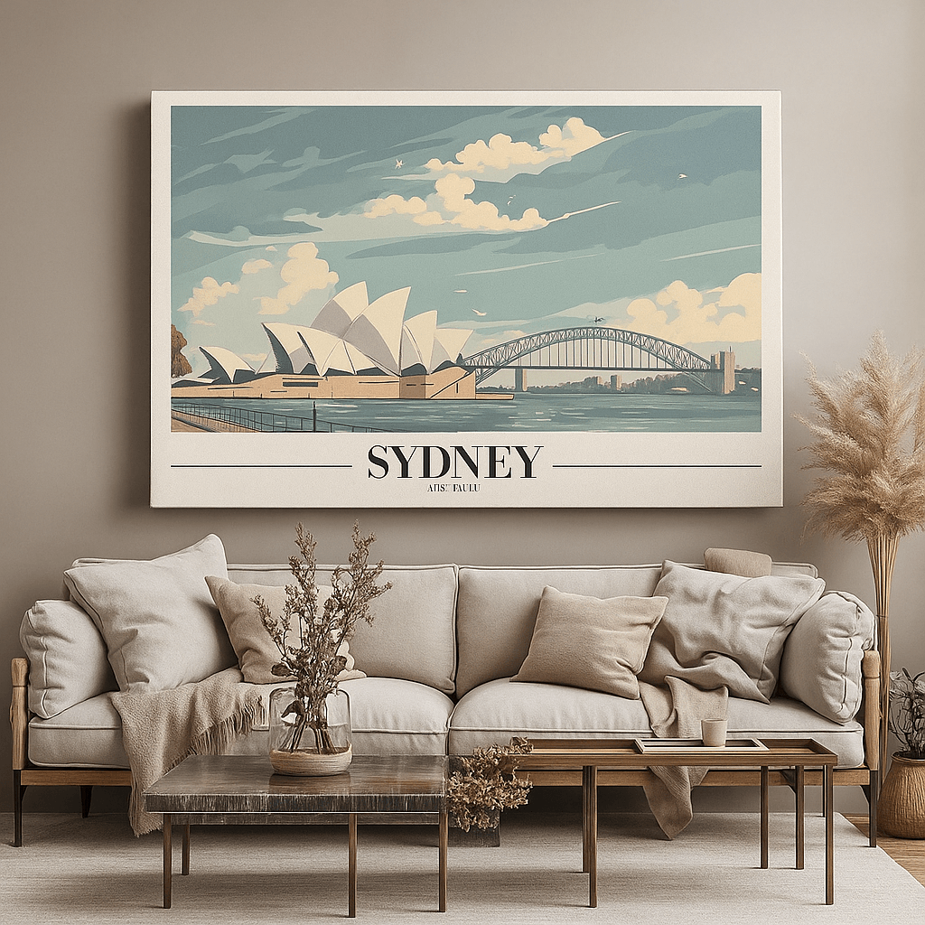 Canvas Print inspired by Sydney highlights the harmony of iconic architecture and coastal scenery, featuring the Opera House, harbor waters, and open skies. The artwork feels fresh, airy, and uplifting, making it perfect for coastal, travel-inspired, or contemporary interiors. The soft color palette enhances brightness while maintaining refined detail. Printed on premium stretched canvas using eco-friendly latex inks, it ensures fade-resistant vibrancy and long-term durability. The canvas arrives professionally hand-stretched and ready to hang, allowing for effortless display. This Canvas Print adds relaxed sophistication and global charm to any room.
