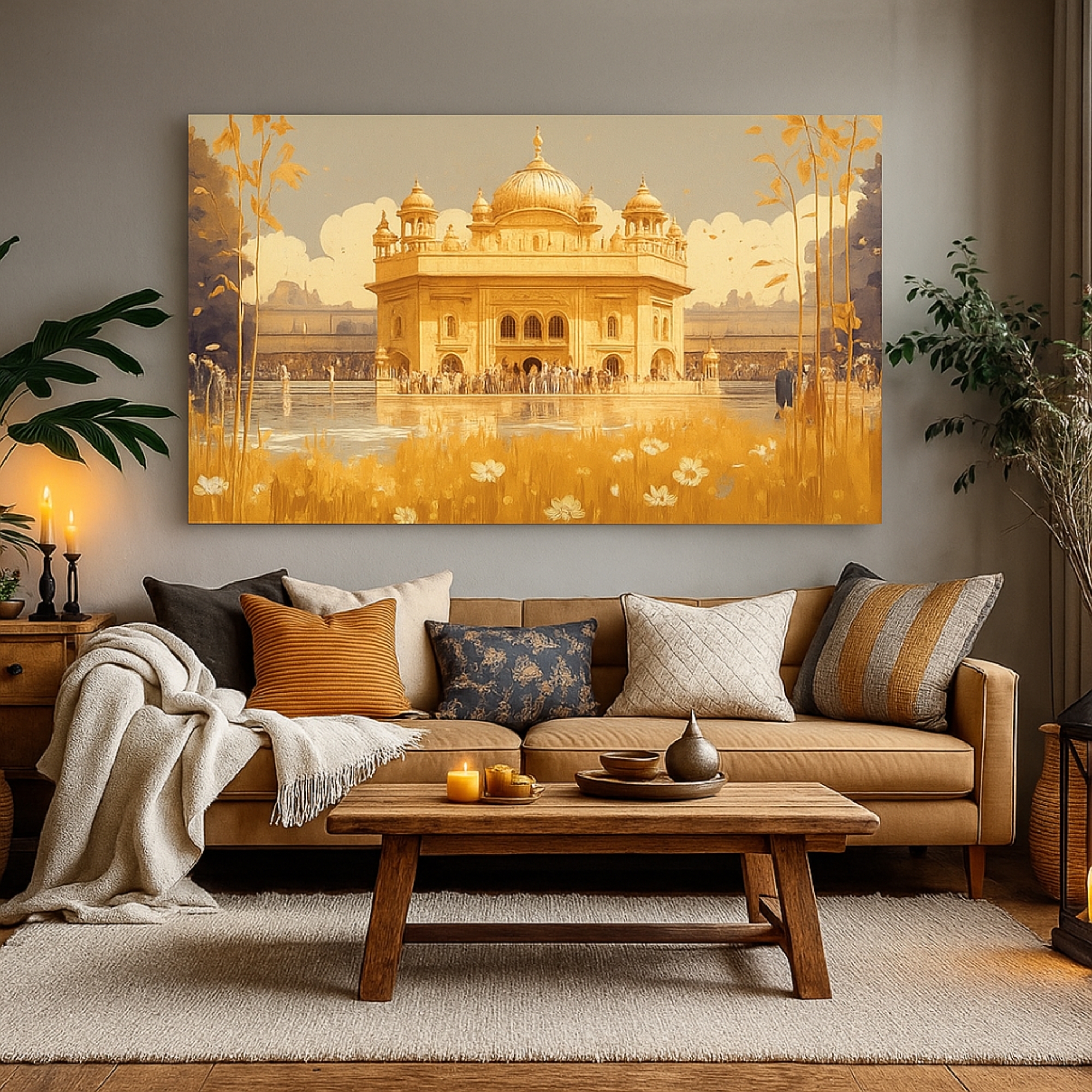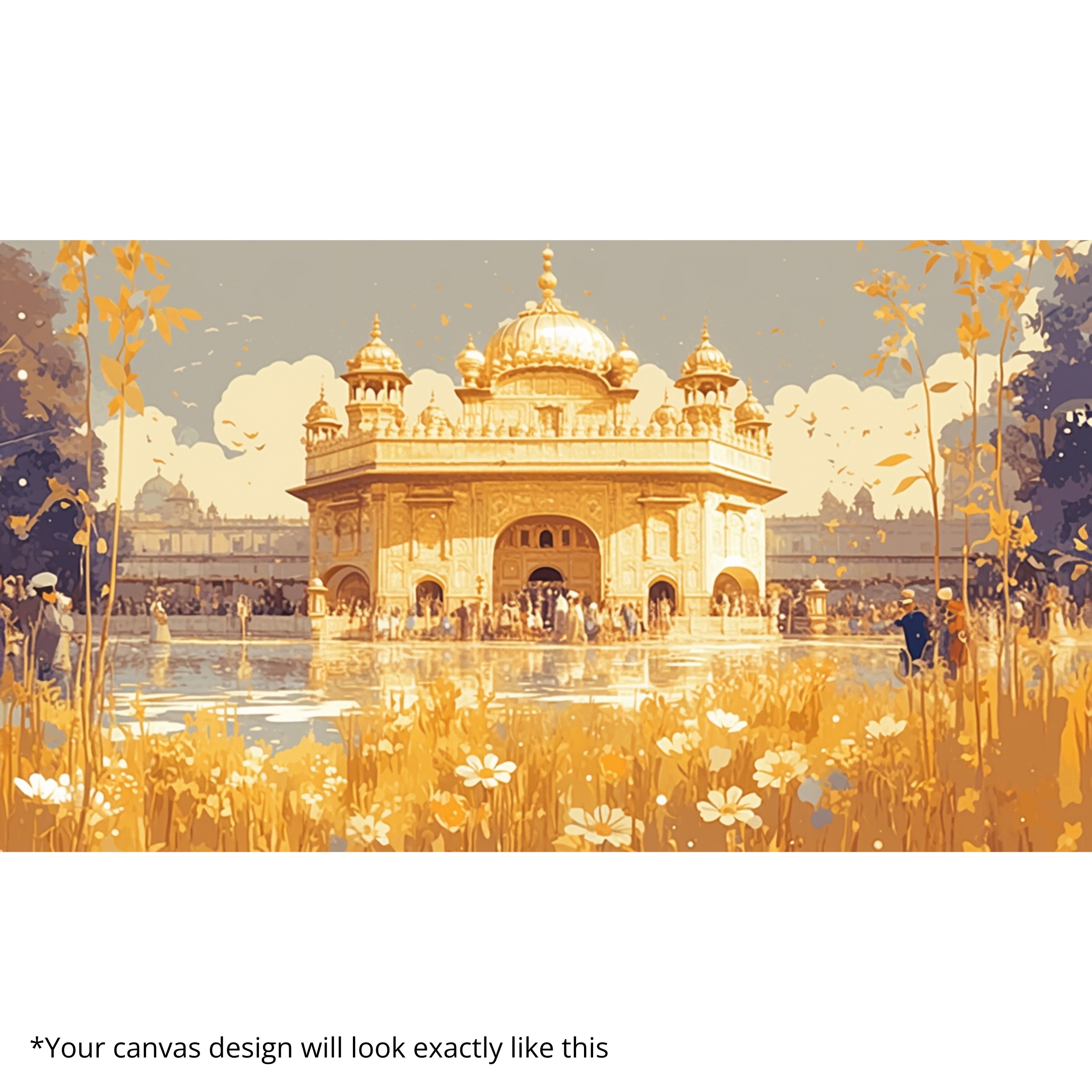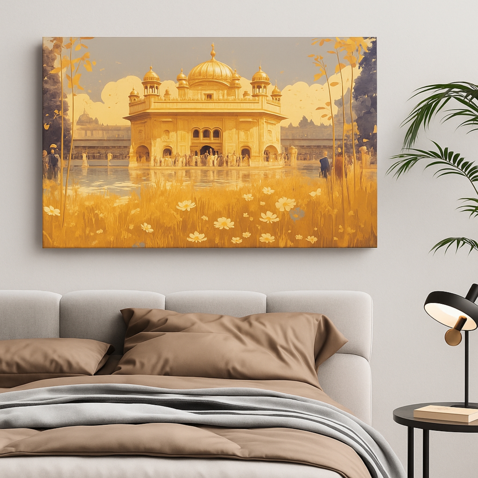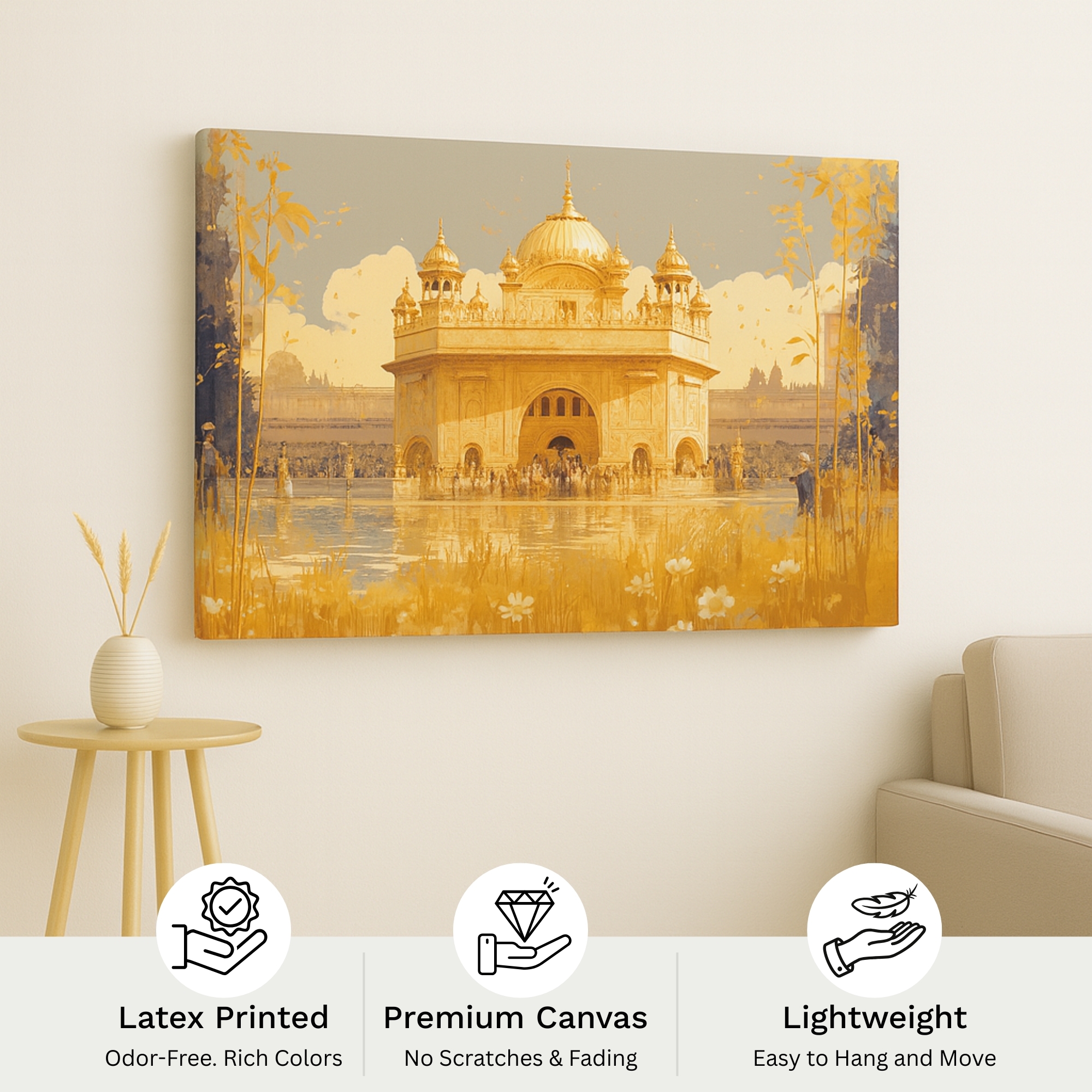 The Temple of Light Canvas Print captures the sacred glow of an illuminated temple reflected on tranquil waters. Rich saffron and amber tones evoke purity and reverence. This canvas wall art celebrates India’s heritage while fitting seamlessly into modern décor.