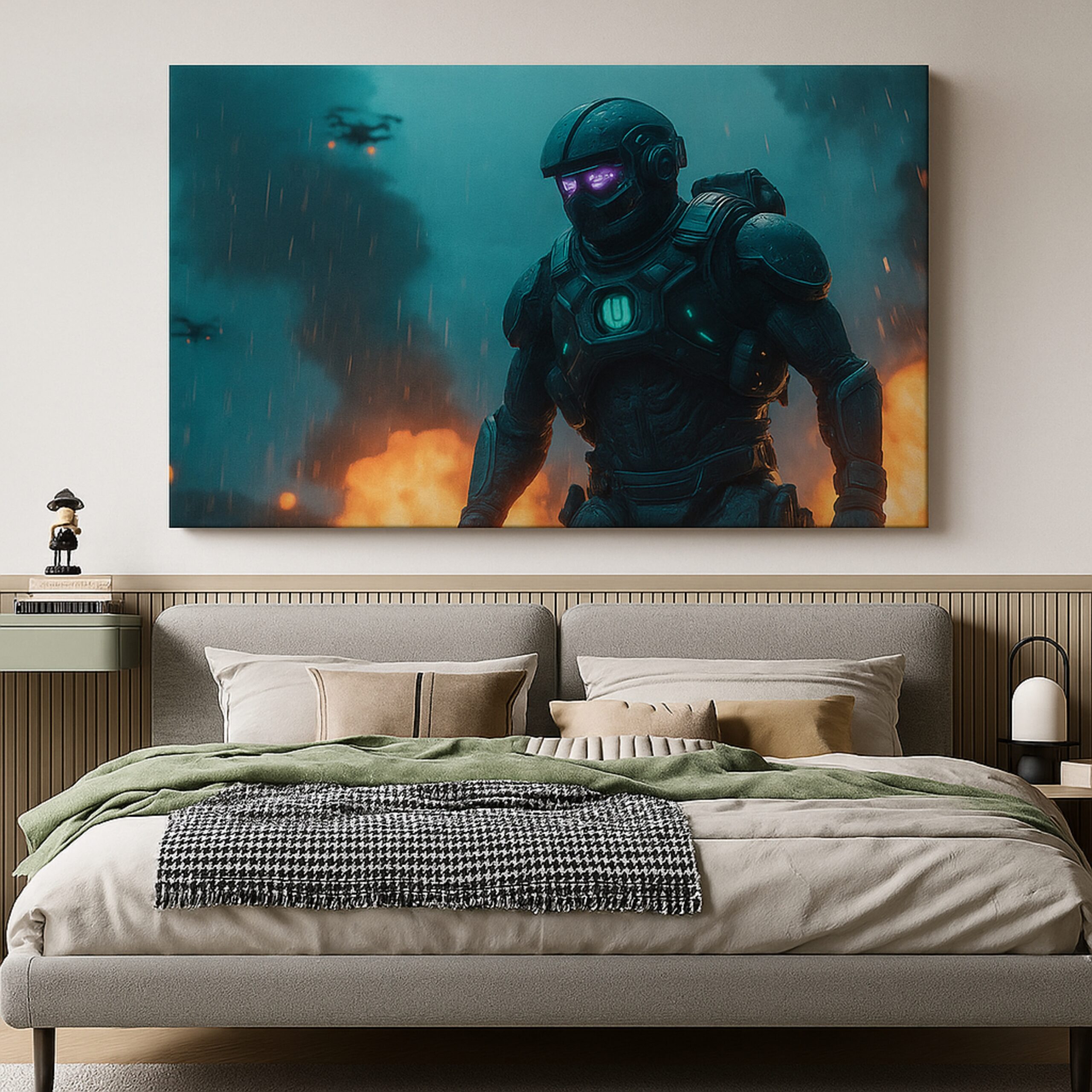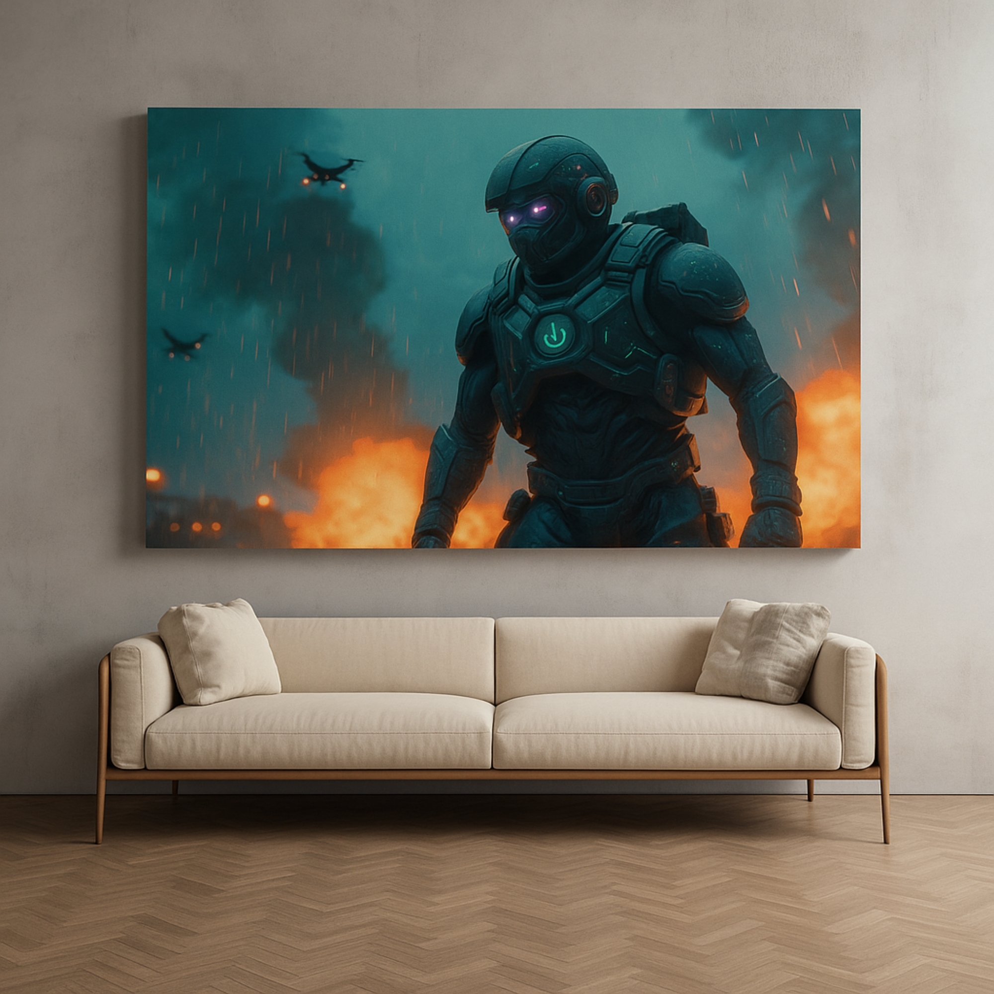 The Titan Protocol Canvas Print strides into view with an armored mech marching through fire and storm, visor aglow. A tribute to resilience, innovation, and sheer presence, this canvas print unleashes futuristic power across your walls. Bold composition and cinematic scale make it a natural centerpiece for offices, gaming rooms, and tech-forward lounges. The high-contrast palette pairs easily with industrial metals and dark furnishings for a polished, modern impact that never fades into the background.