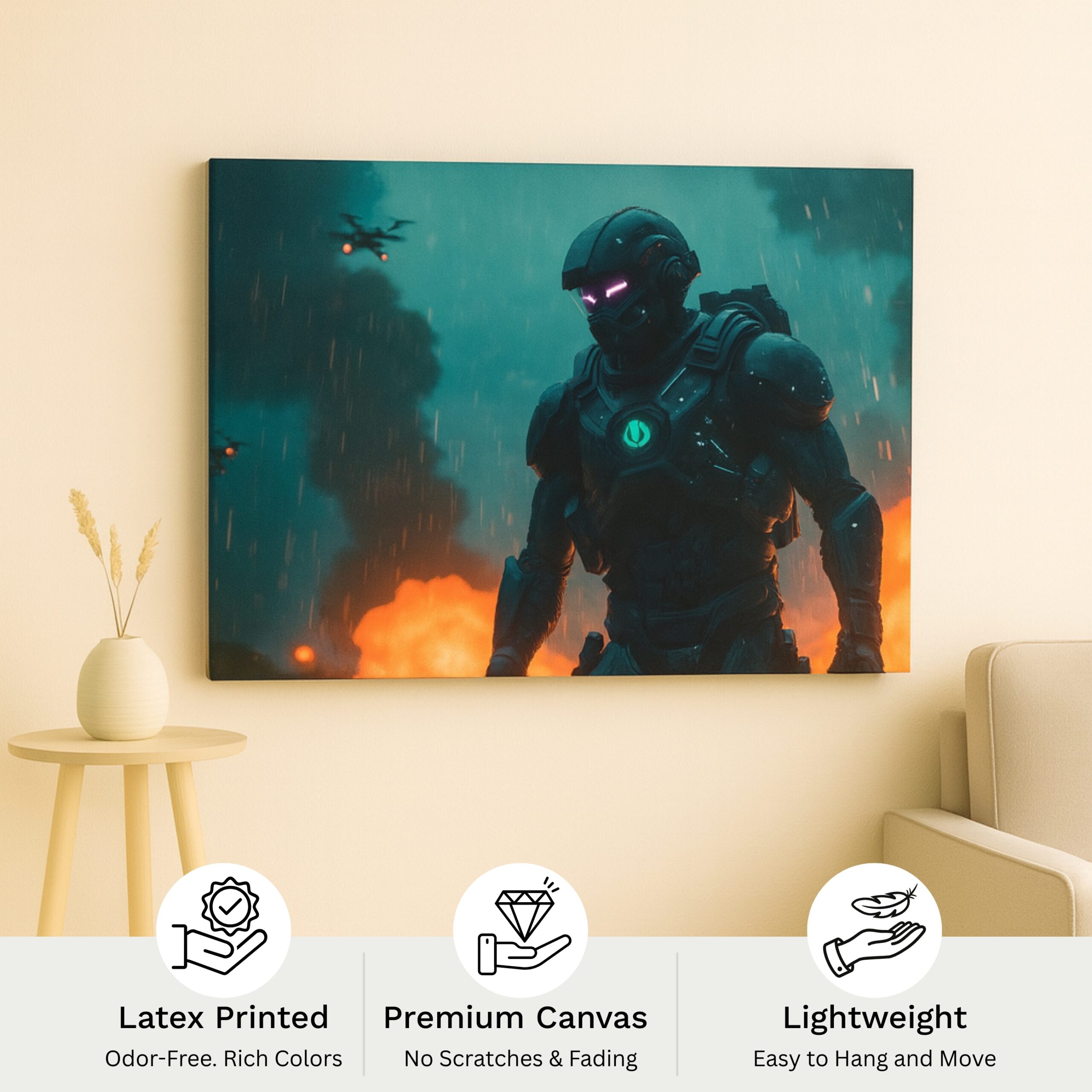 This mech-centric canvas print also makes a standout gift for sci-fi fans and concept-art enthusiasts. Printed on premium stretched canvas with fade-resistant inks, it preserves metallic nuance and stormy glow for years. Proudly made in India, this canvas wall art pairs durable craftsmanship with future-grade aesthetics to energize interiors day after day.