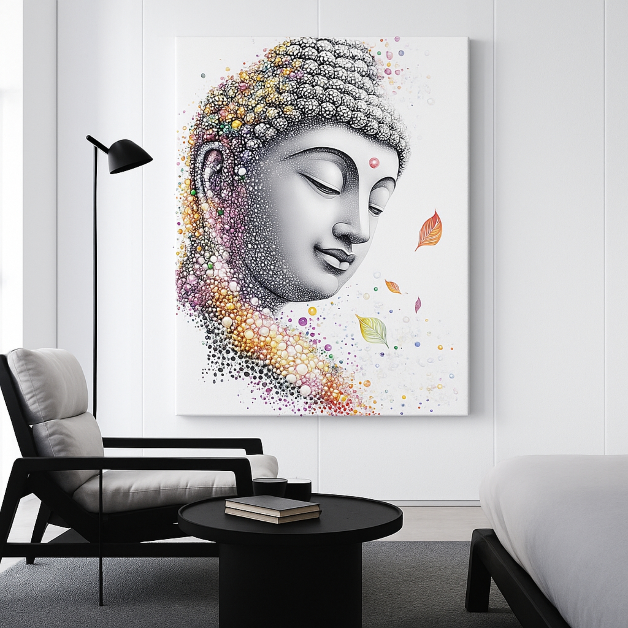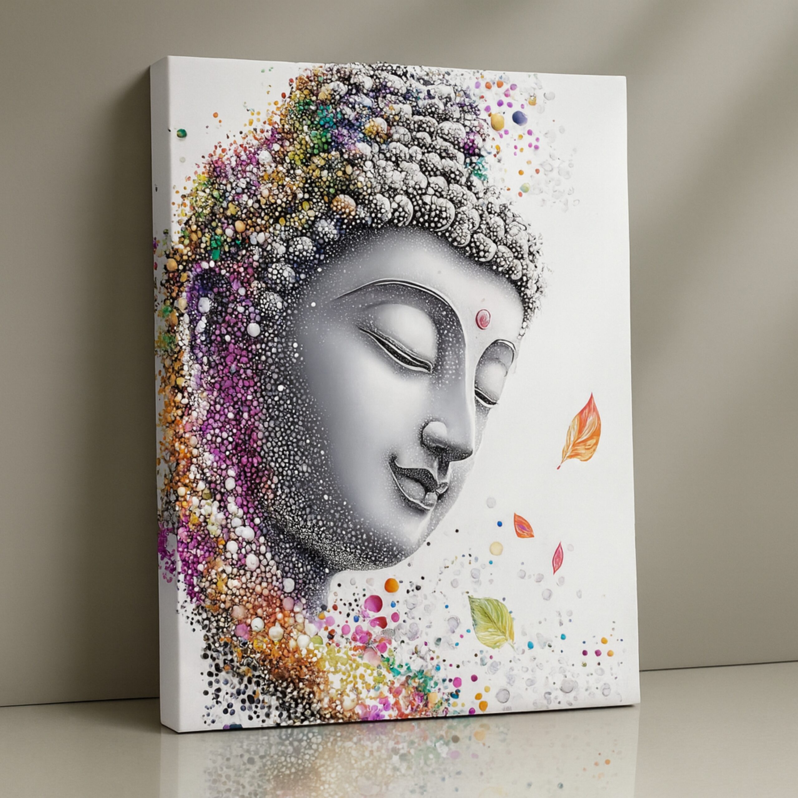 “Tranquil Bloom” is a meditative Buddha Canvas Print designed to bring peace, clarity, and positivity into your home. Buddha’s calm face is delicately adorned with blooming floral textures, symbolizing mindfulness and growth. Shades of grey merge with soft, vibrant tones to represent clarity emerging from life’s chaos, making it a versatile artwork for both modern and traditional interiors.