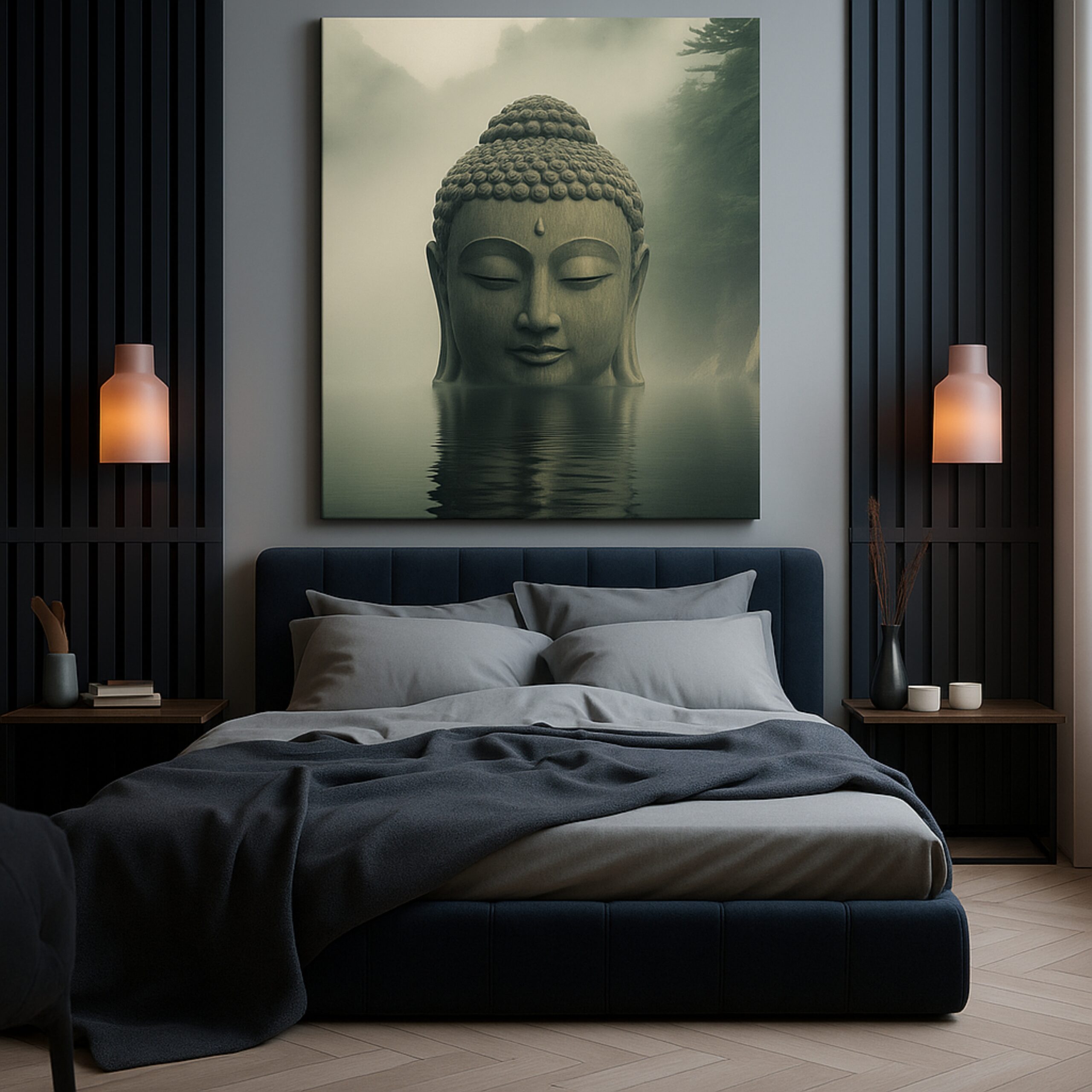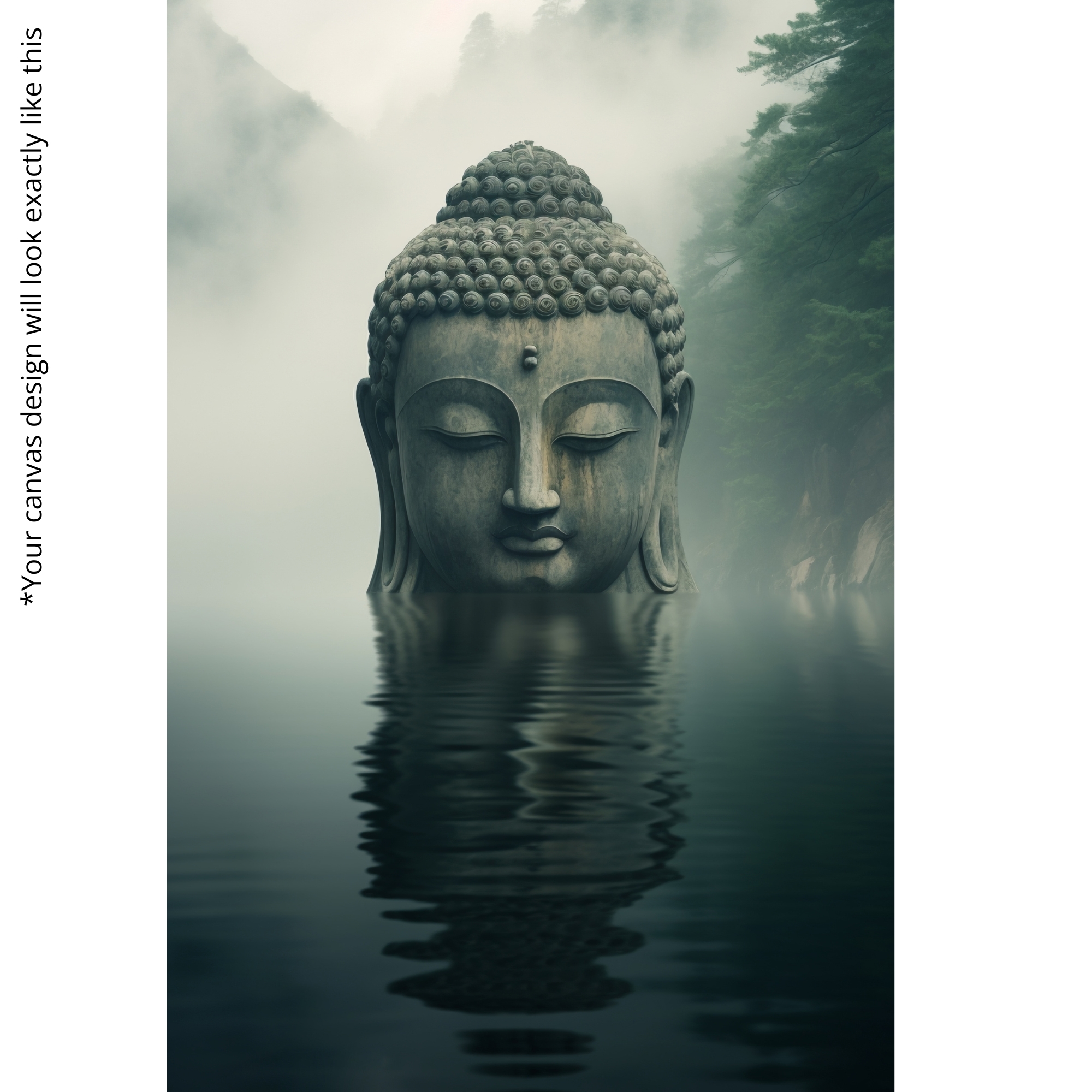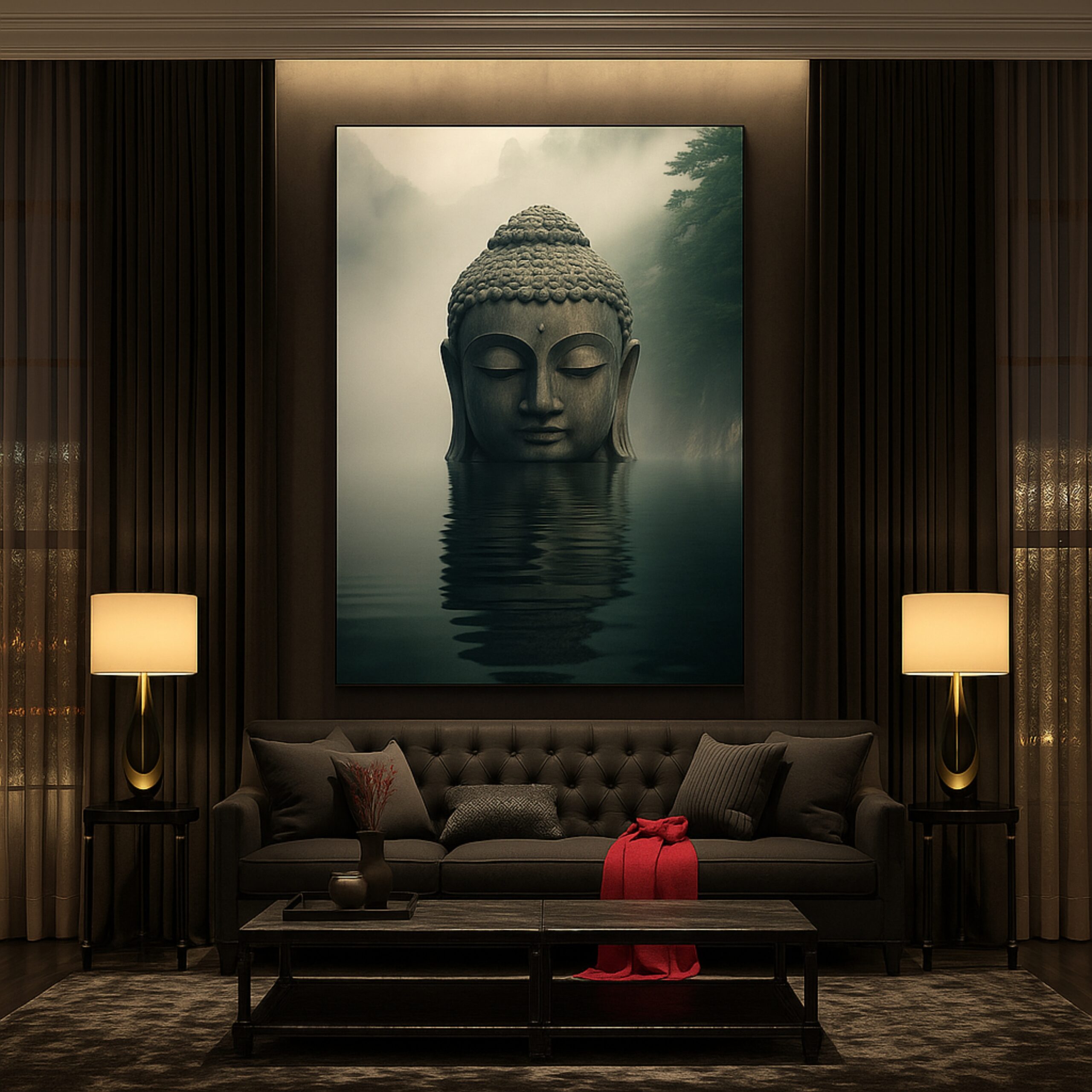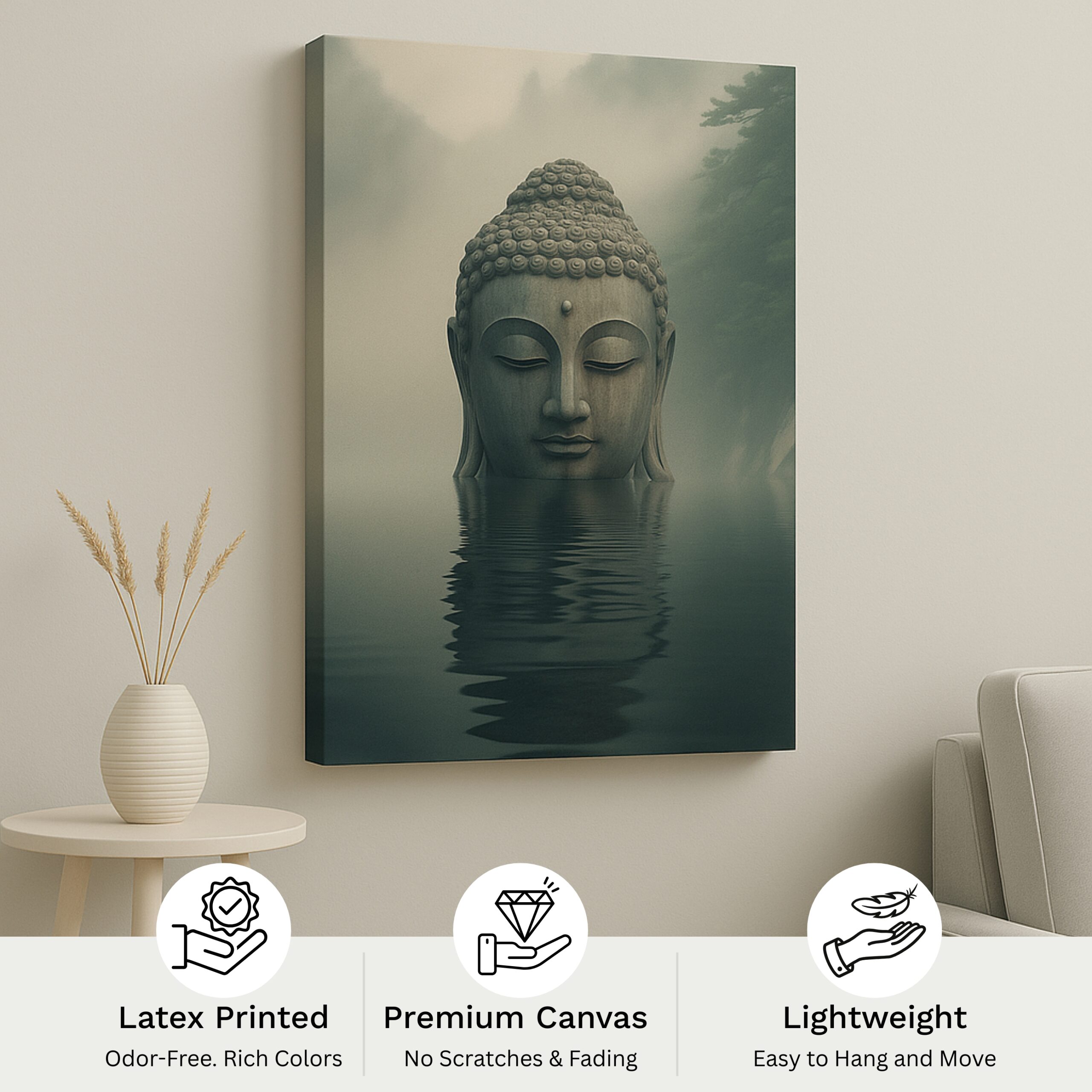 Canvas Print of “Tranquil Buddha” depicts a peaceful Buddha head emerging from still waters, surrounded by mist and soft light. This artwork represents self-realization and inner clarity, inviting viewers to find calm within chaos. The muted green and grey palette makes it ideal for modern minimal interiors that value simplicity and spiritual presence.