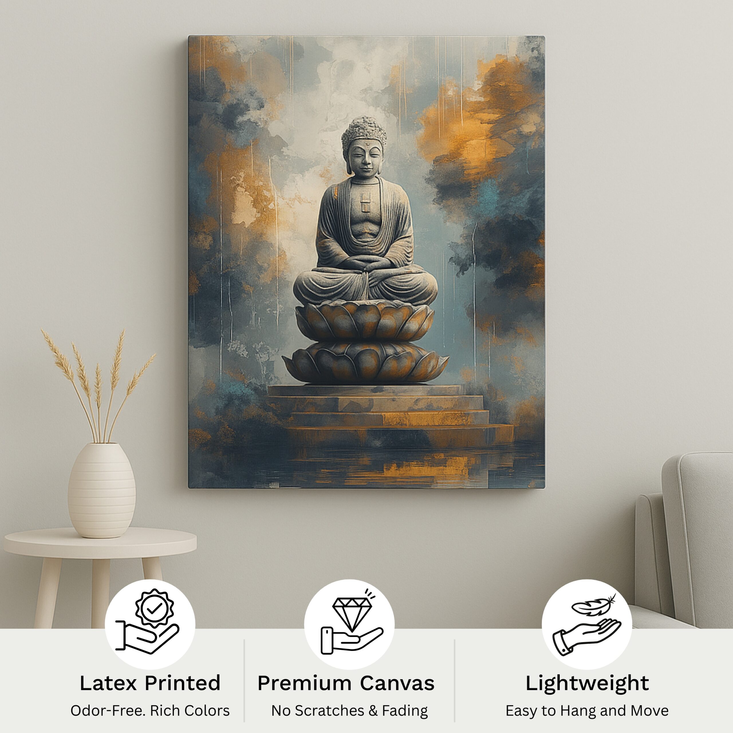 Crafted in India with artisanal precision, this Buddha canvas print radiates spiritual depth and mindful beauty. Whether used as meditation artwork, spiritual décor, or a thoughtful gift, it adds a sense of calm and reverence to every setting.