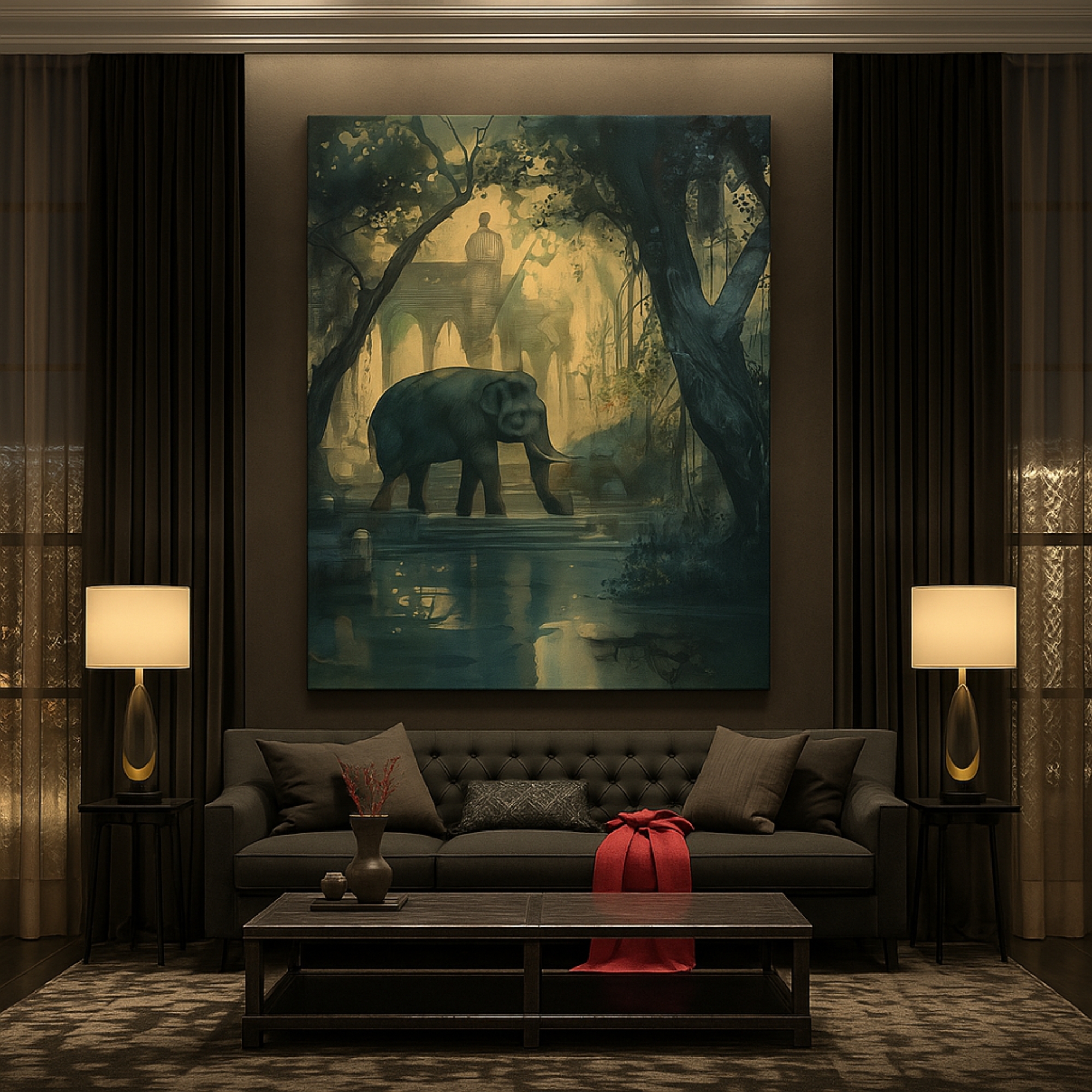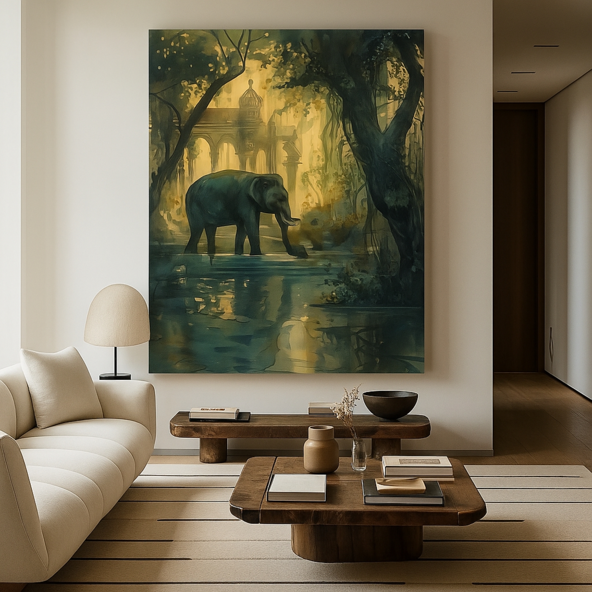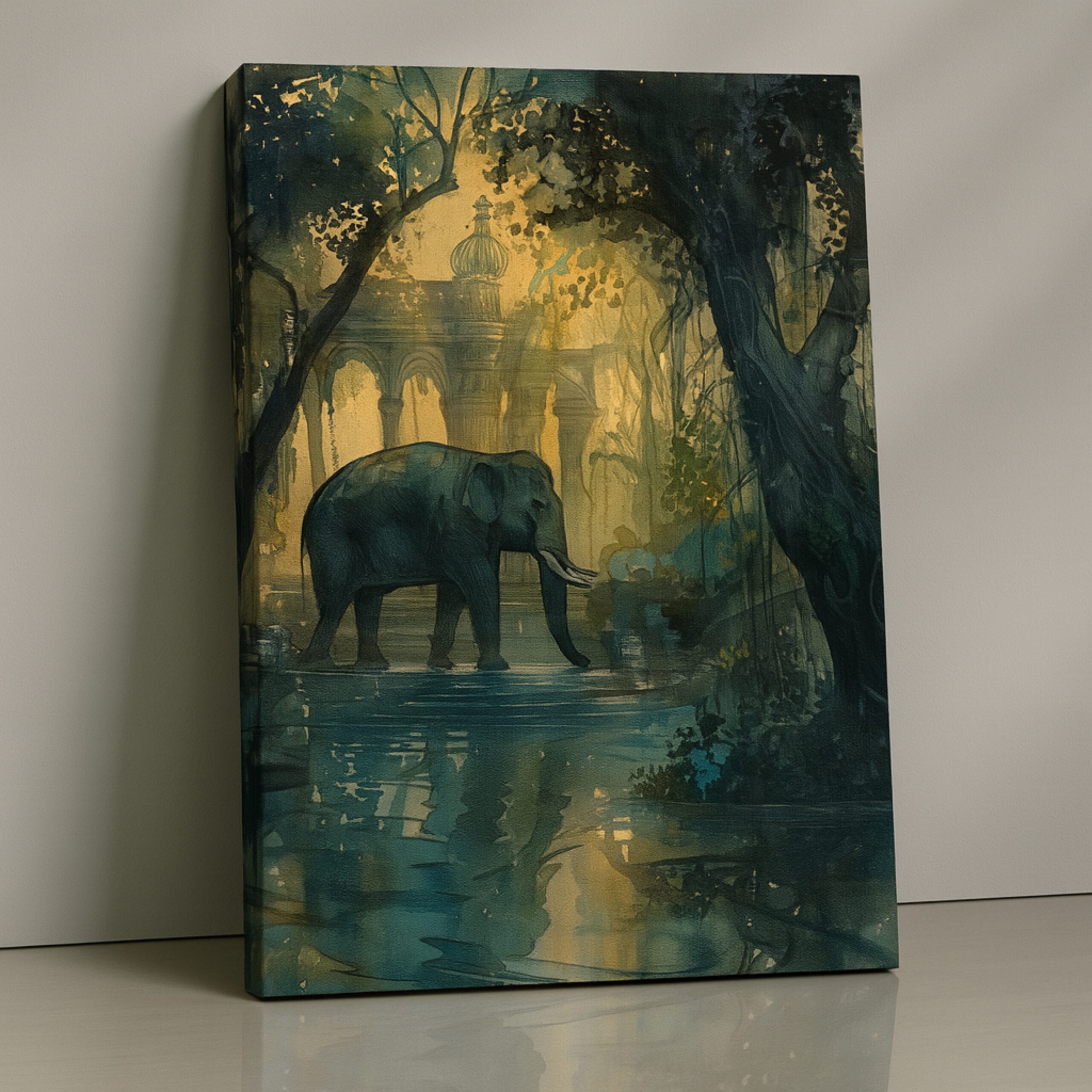 The Twilight Elephant Canvas Print captures a majestic elephant silhouette walking through a dreamy forest at dusk, with palace domes glinting far beyond. Soft golden light filters through trees to create a poetic balance of nature and heritage. This canvas print introduces calm, strength, and quiet drama to living rooms, bedrooms, and study spaces, anchoring interiors with a contemplative focal point.
