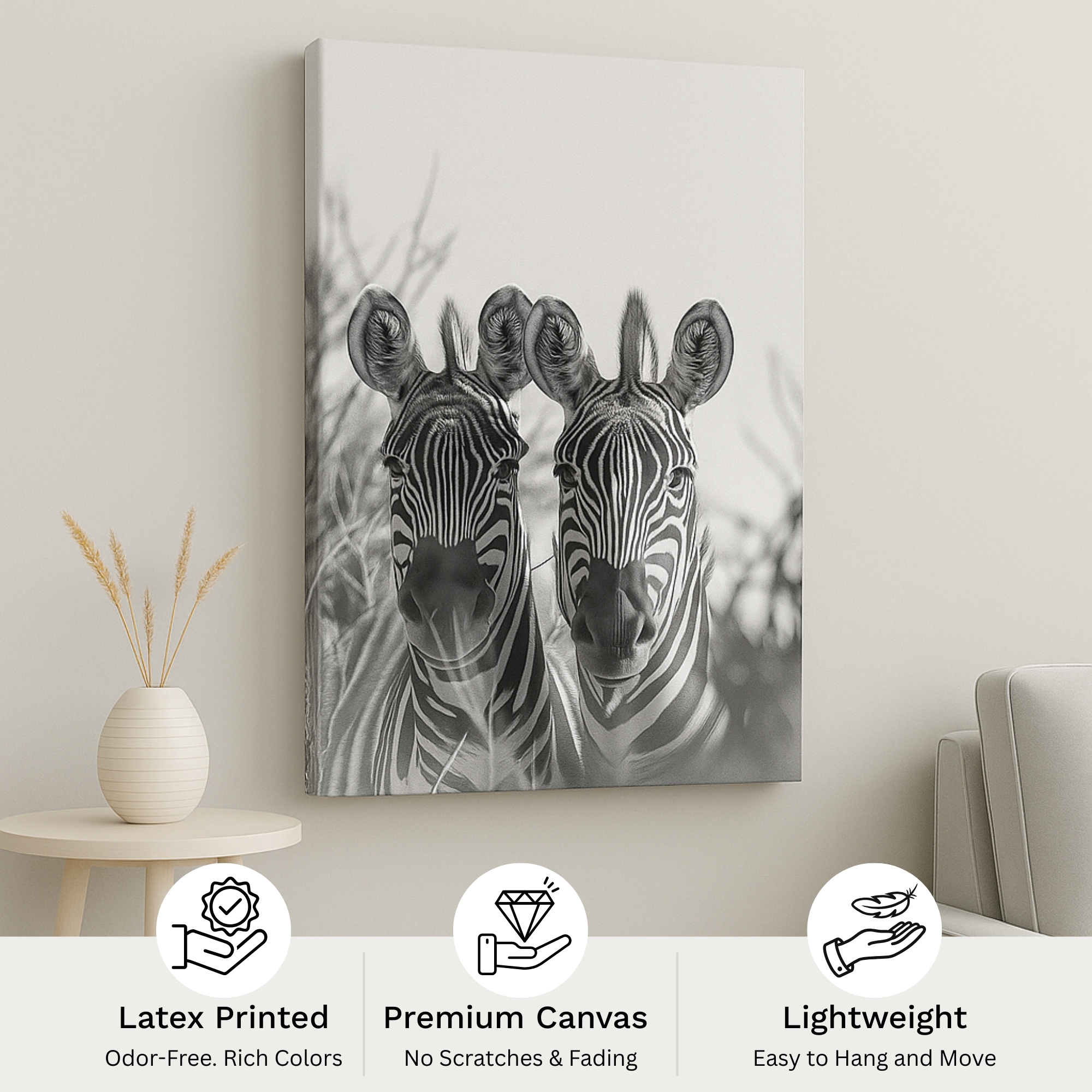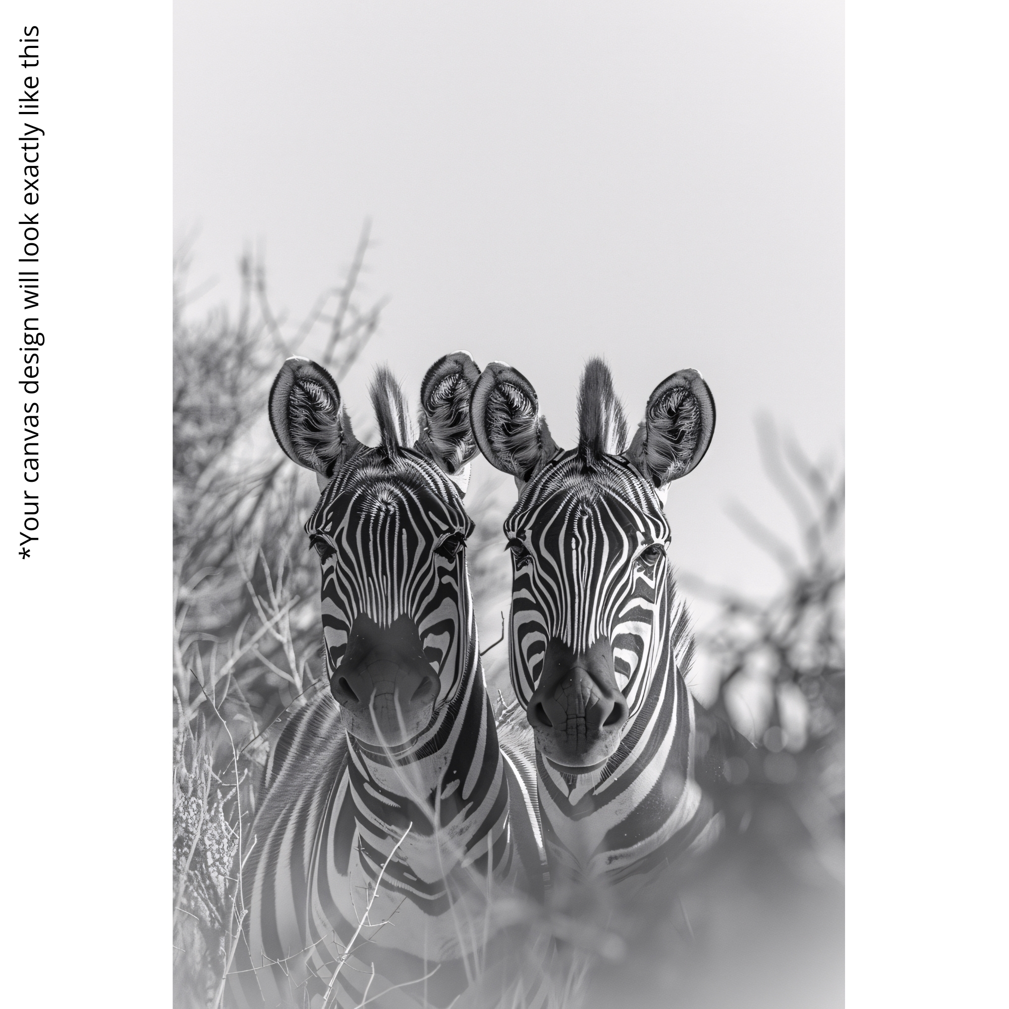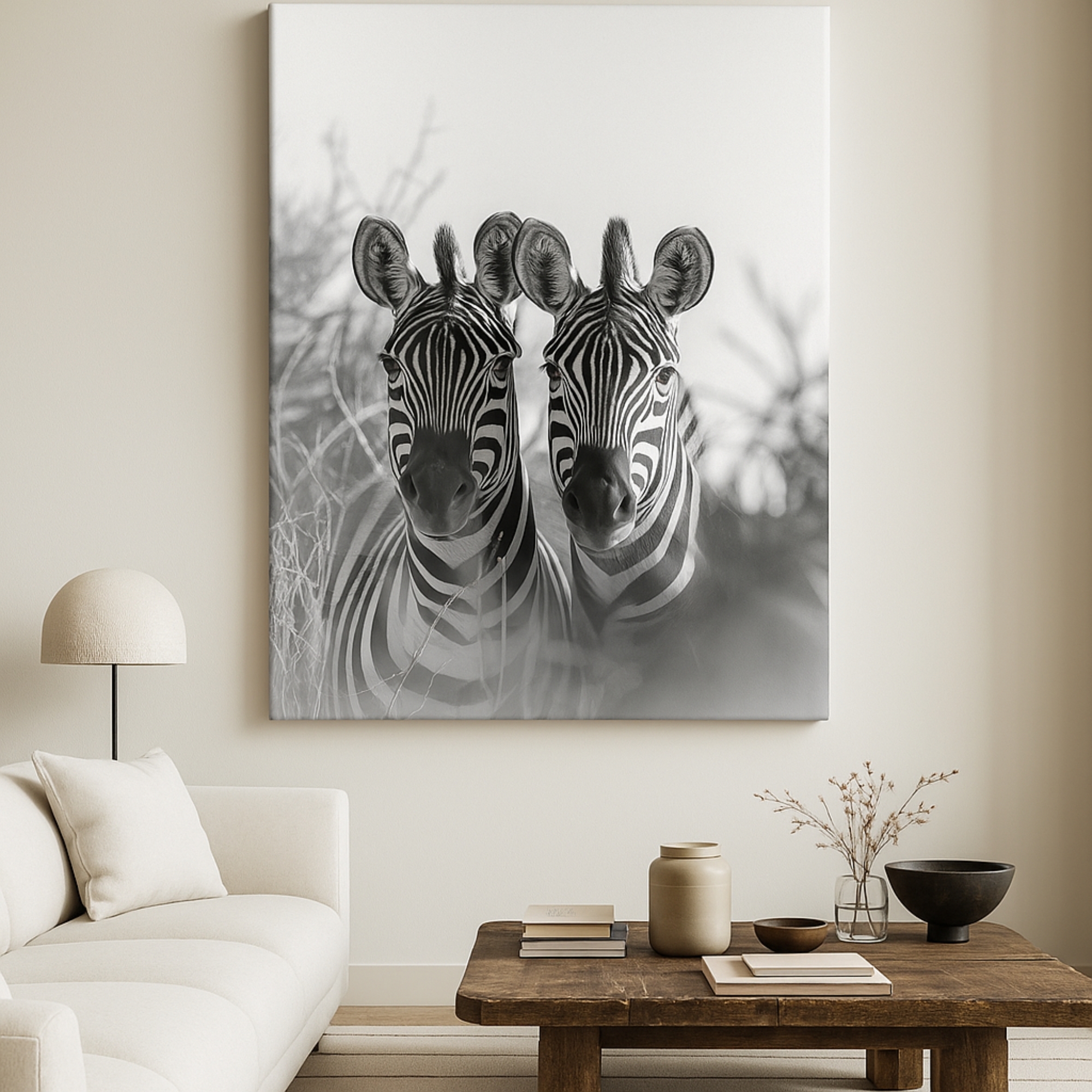 The Twin Echoes Canvas Print features two zebras standing closely together, captured in beautifully balanced monochrome tones. Soft background mist and smooth grayscale transitions create a calming wildlife artwork symbolizing unity, connection, and natural elegance. Ideal for minimalist interiors, modern bedrooms, wildlife-themed spaces, and décor that embraces gentle harmony.