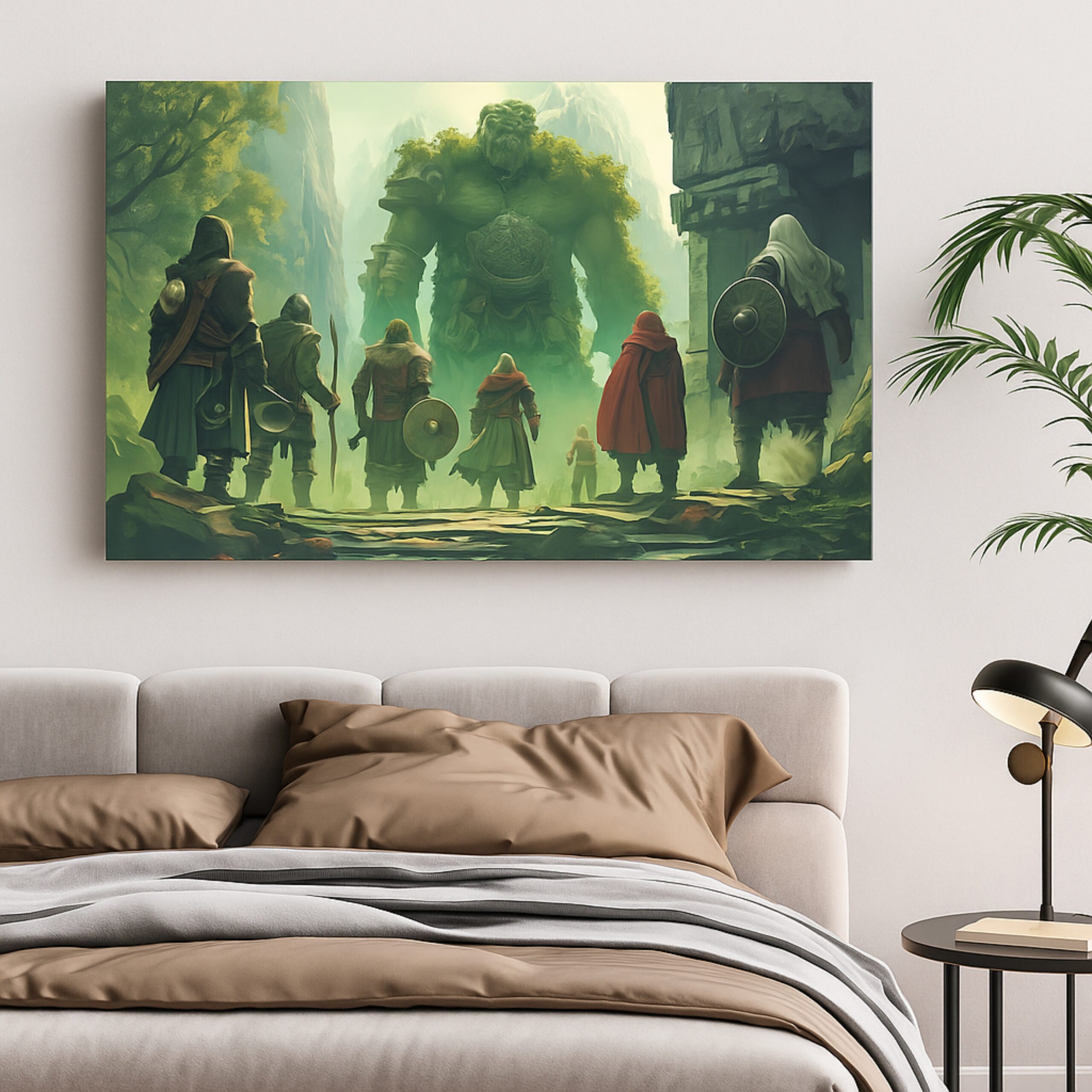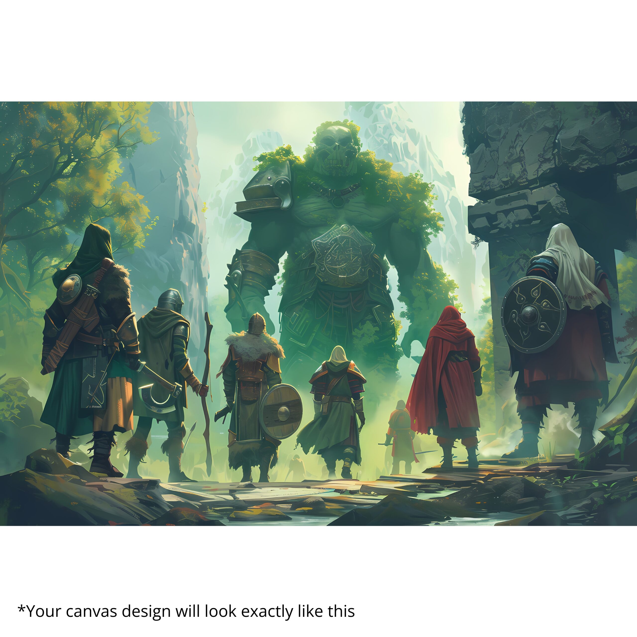 The Verdant Awakening Canvas Print immerses you in green-glowing serenity as cloaked adventurers face a moss-clad giant rising from ancient forest light. Lush tones and ethereal radiance conjure a world of natural magic and quiet power. This canvas print blends peace with wonder, inviting reflection in bedrooms, meditation spaces, libraries, and living rooms.