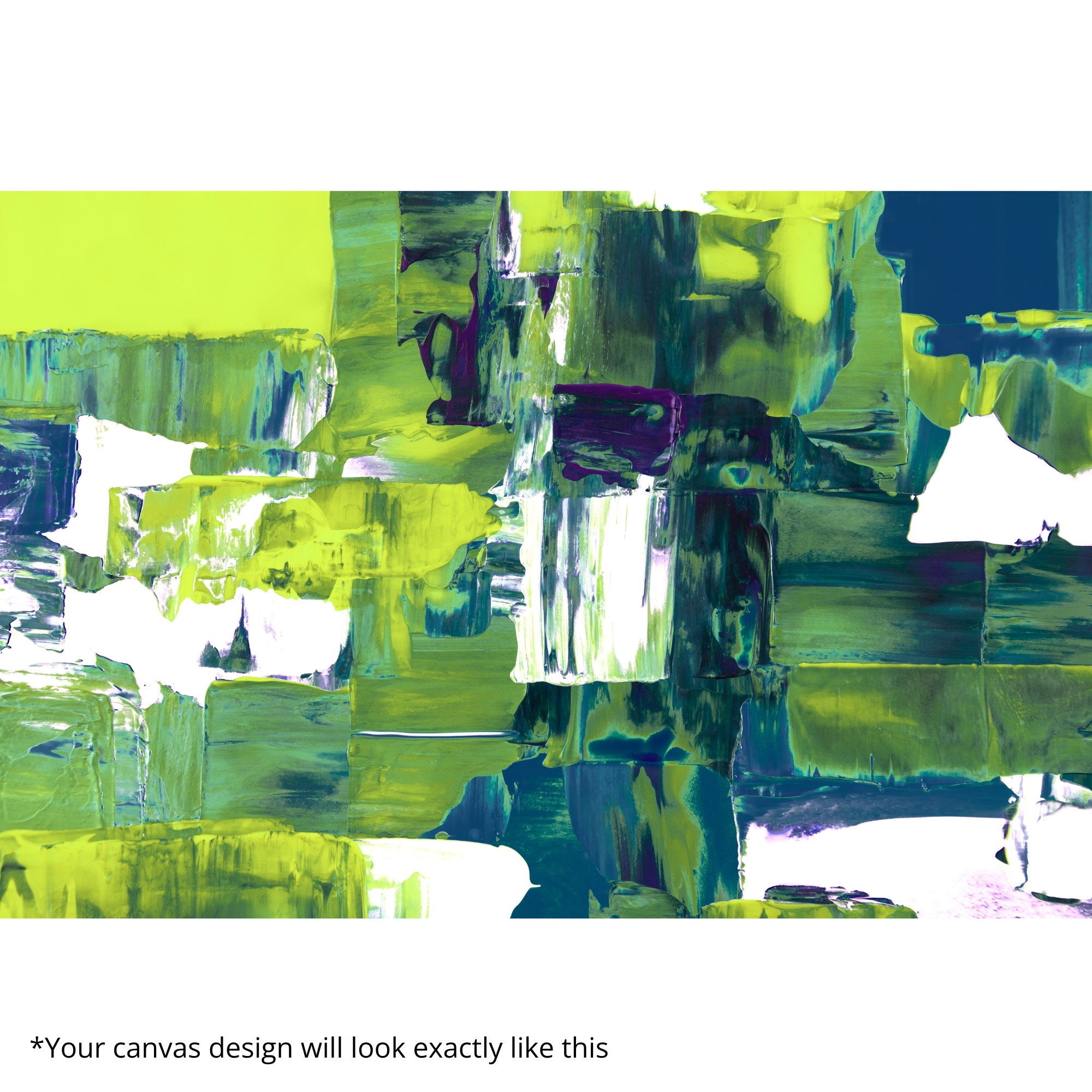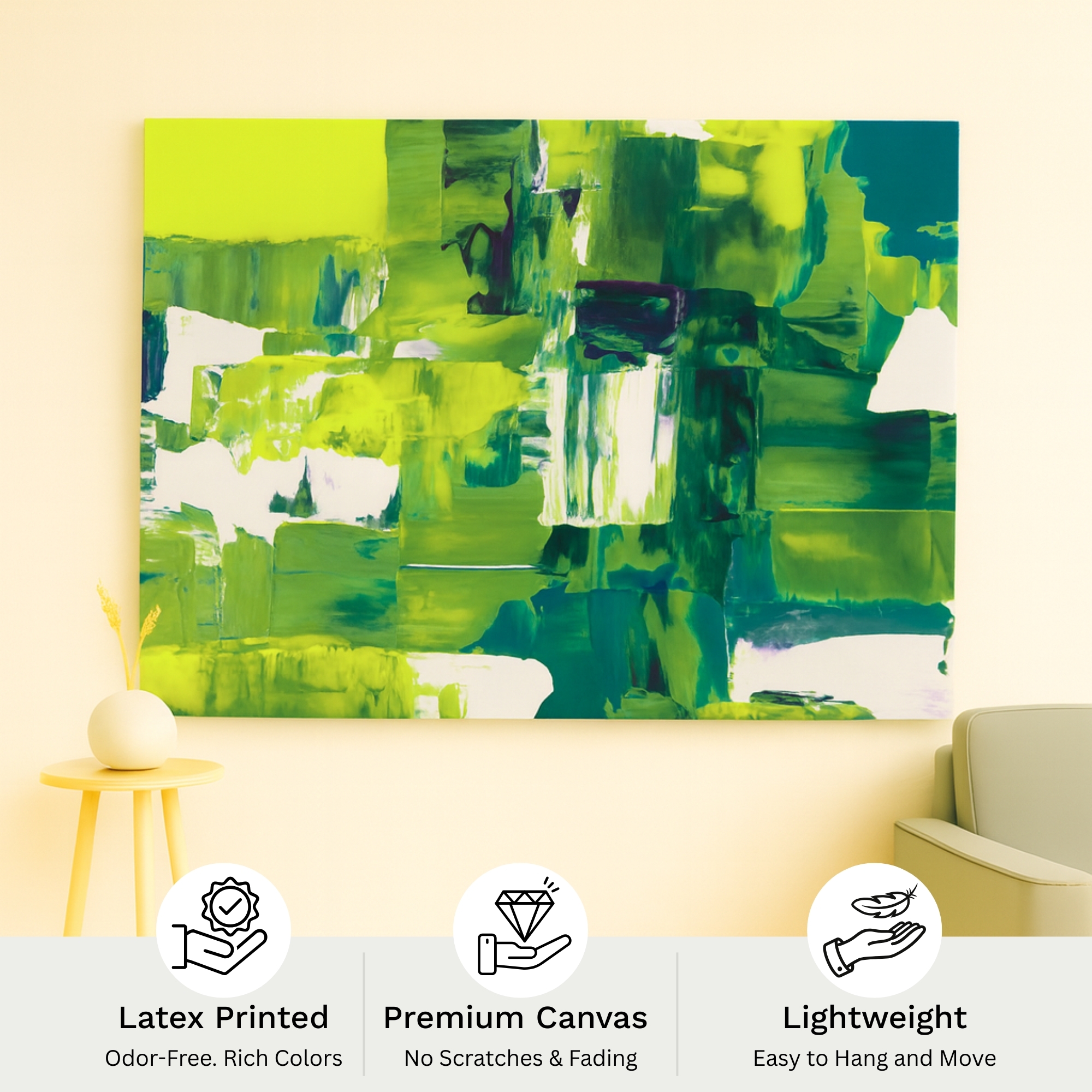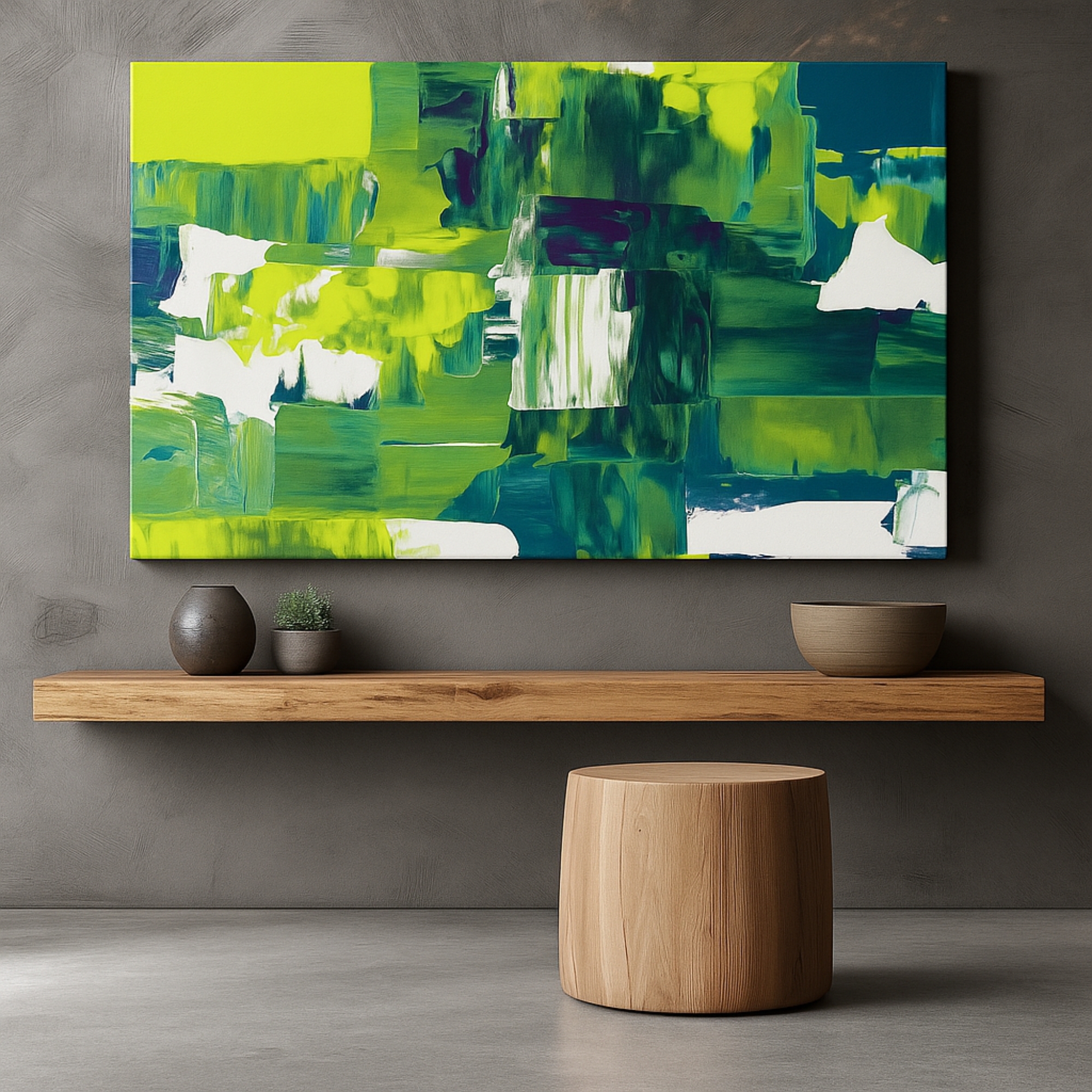 This canvas boosts interior energy with vivid greens and expressive modern texture.