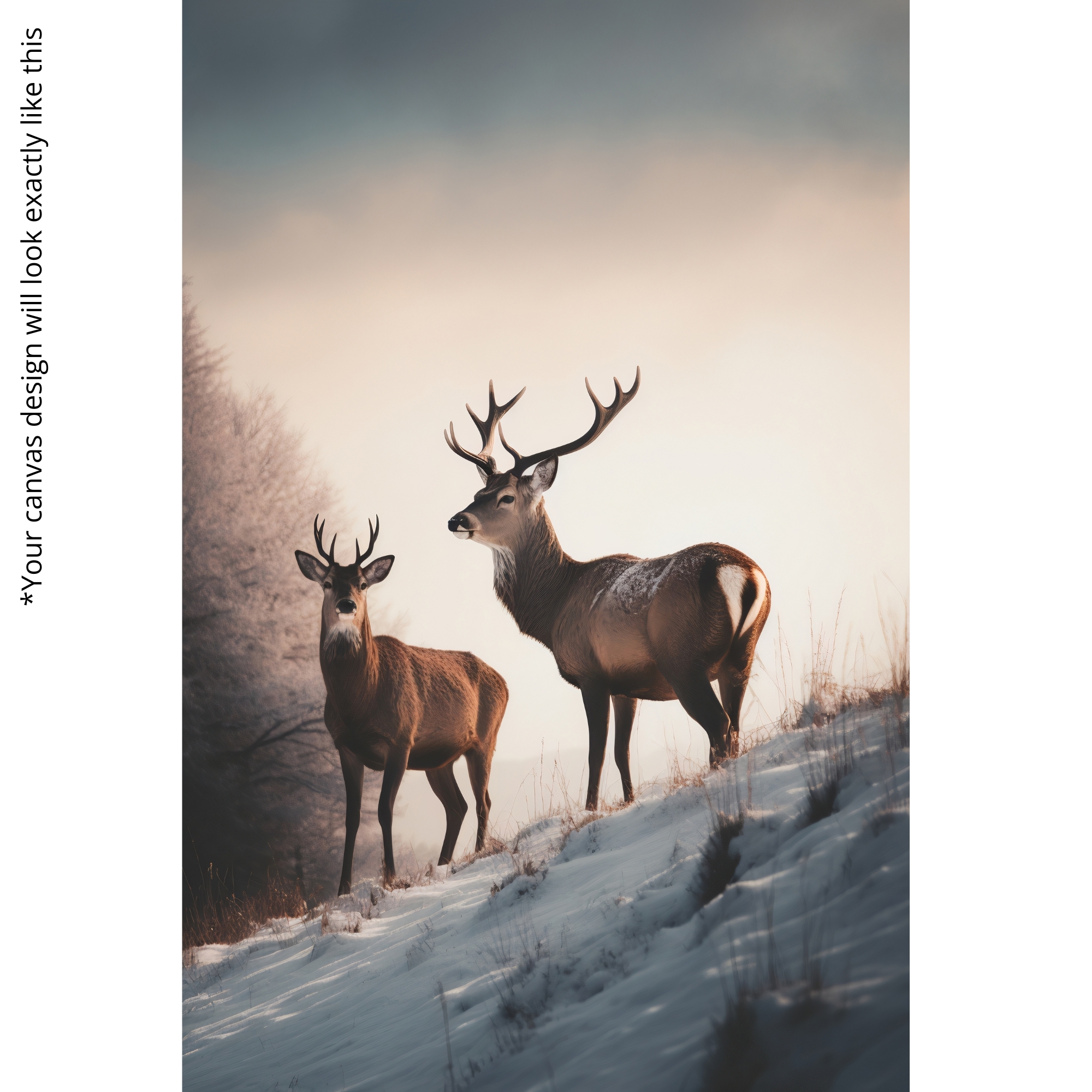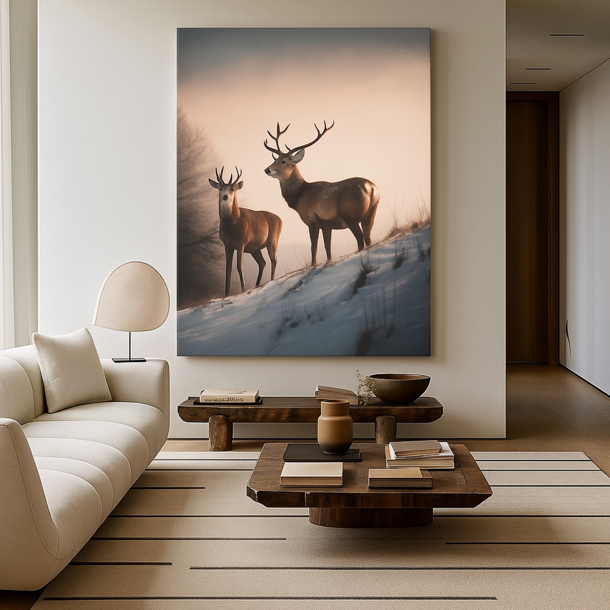 The Winter Companions Canvas Print depicts two deer overlooking a snow-covered hillside as the early morning sun paints the sky in delicate peach hues. Soft winter gradients, gentle shading, and peaceful wildlife composition create an atmosphere of companionship, calm, and seasonal beauty. Perfect for bedrooms, living rooms, Scandinavian spaces, and serene interior themes.
