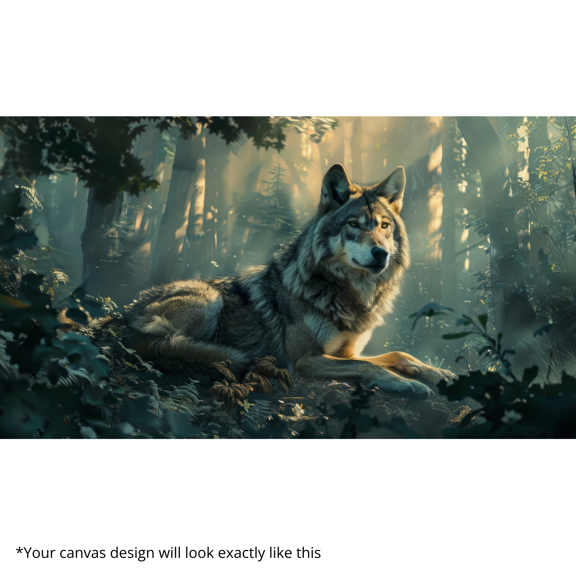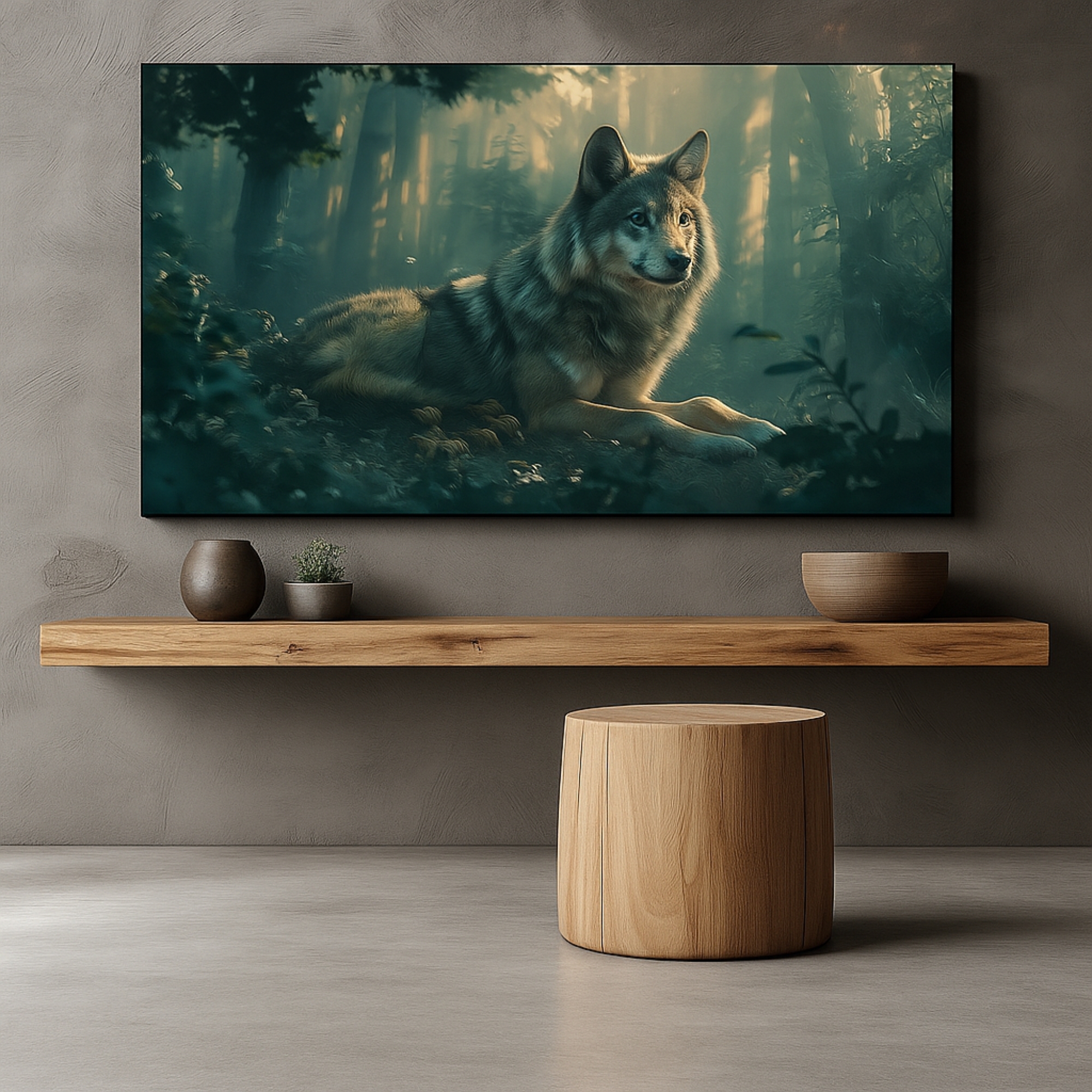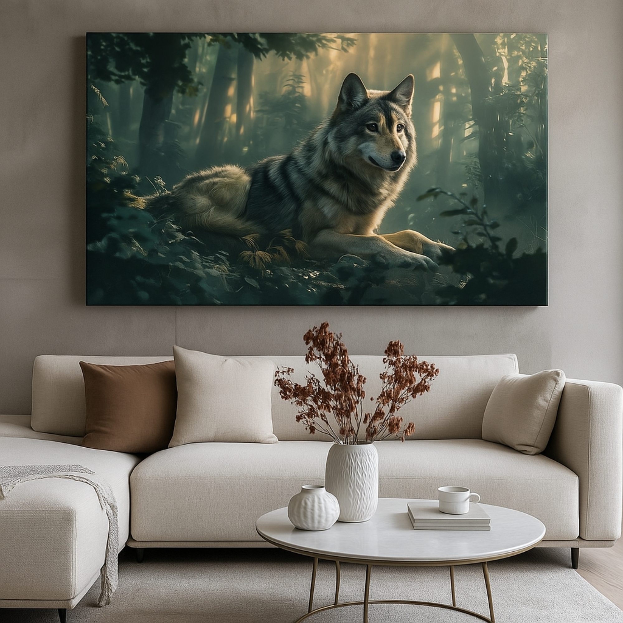 “The Woodland Sentinel canvas print captures a serene wolf resting in warm golden forest light. Soft highlights and gentle earthy tones create a calming atmosphere, making this piece ideal for peaceful, warm Indian homes. It symbolizes intuition, protection, and quiet strength — perfect for interiors needing harmony and grounding energy.